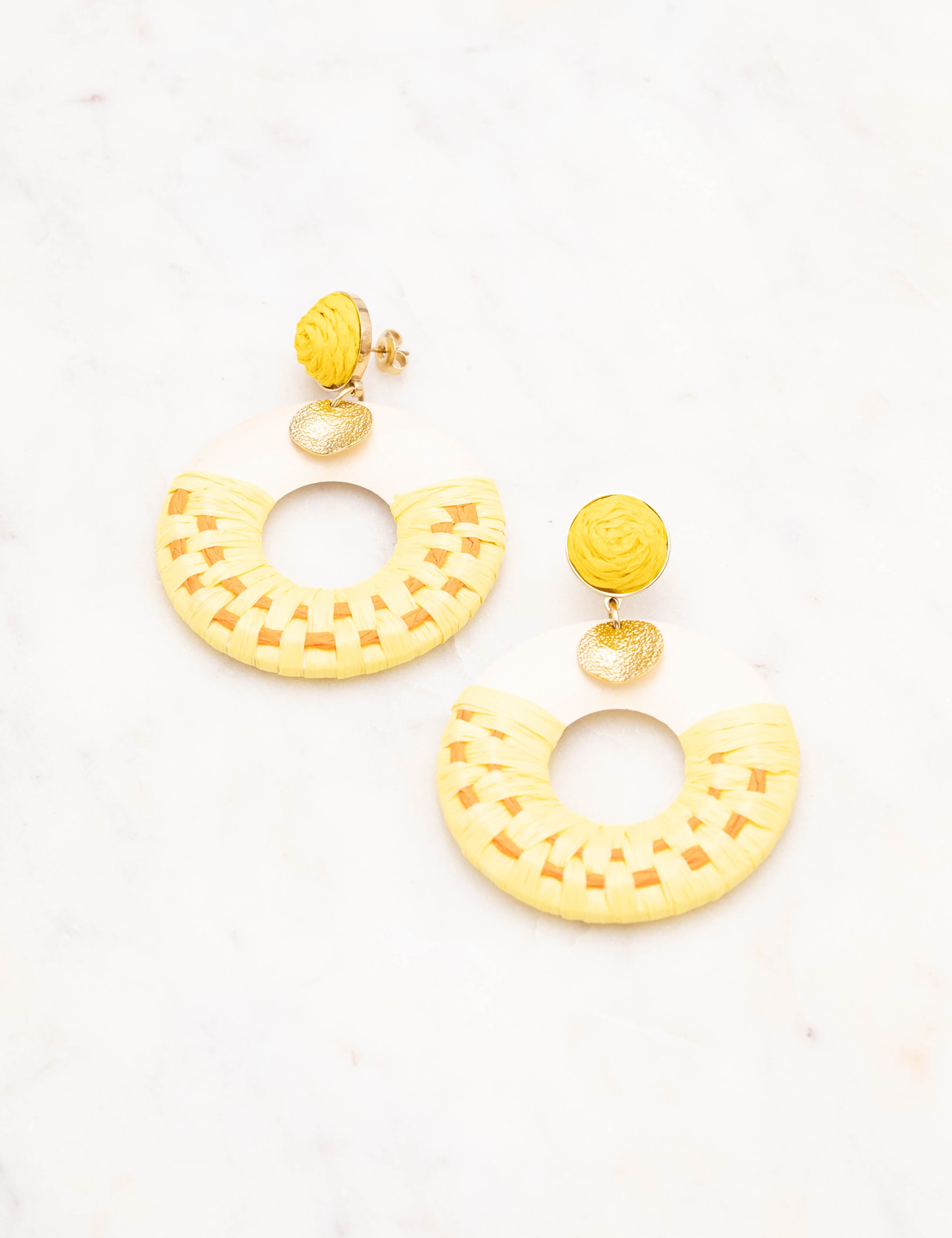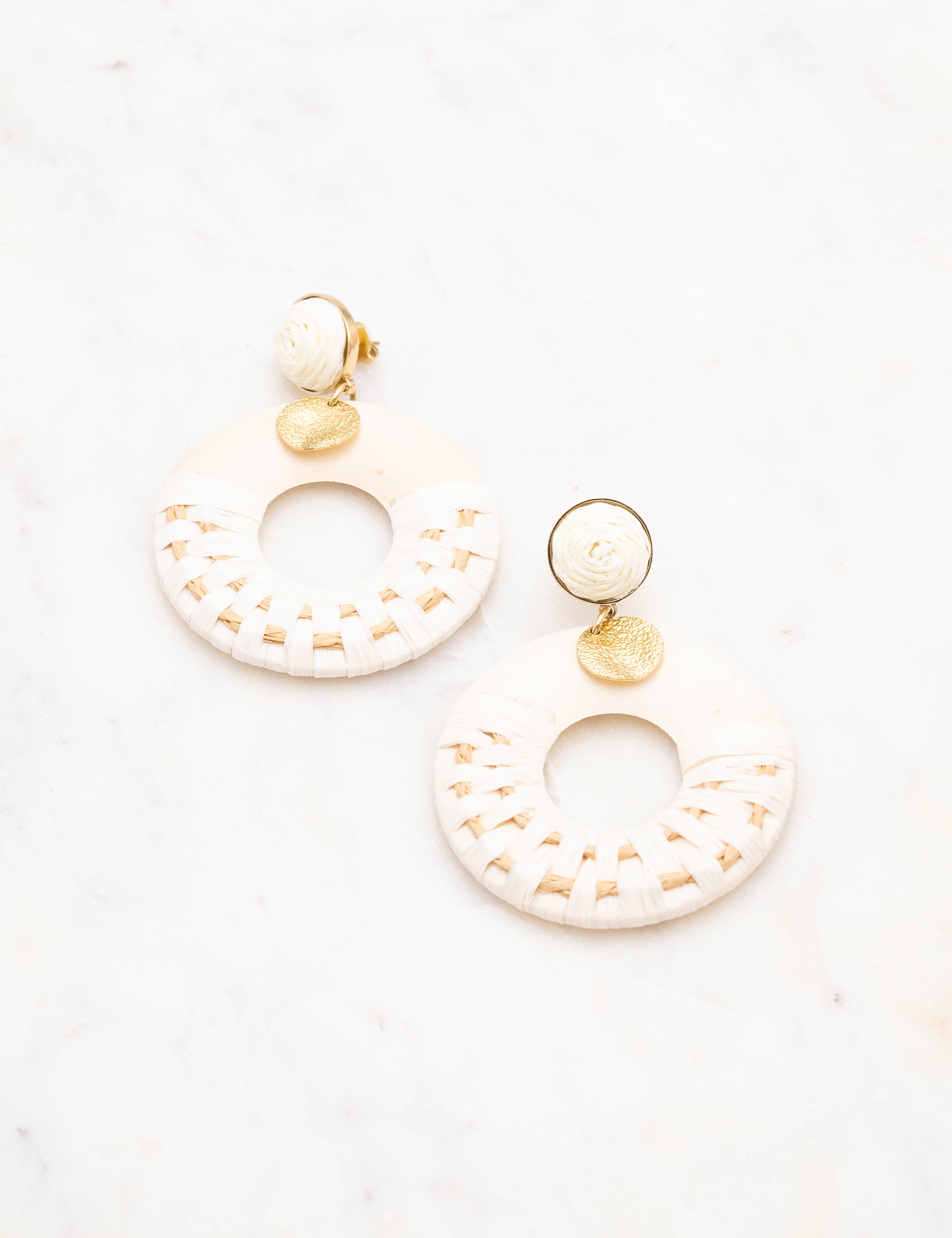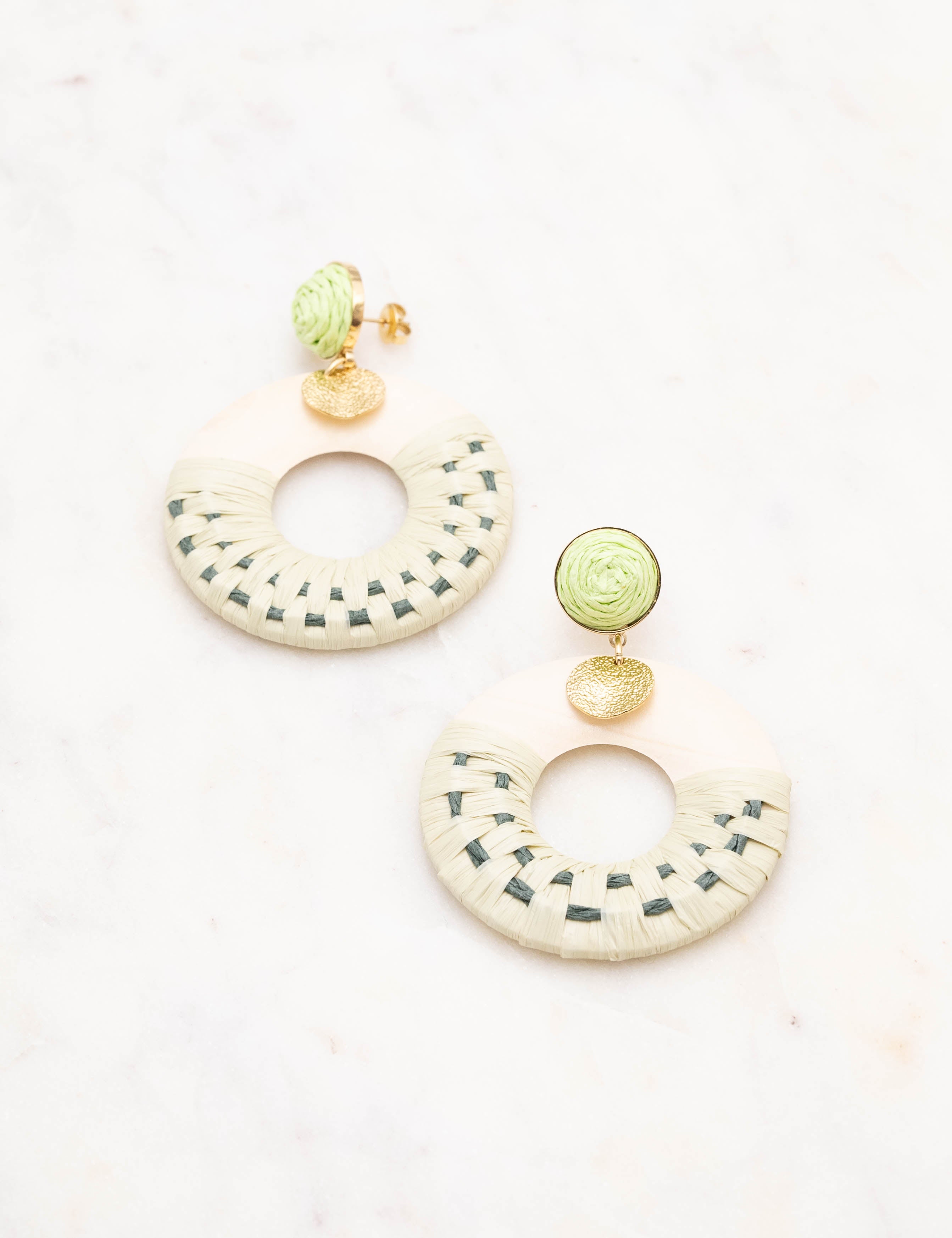 Boucles d'oreilles graphiques à puce pendantes en acier inoxydable et en bois ornées de raphia et d'une pampille ronde martelée.