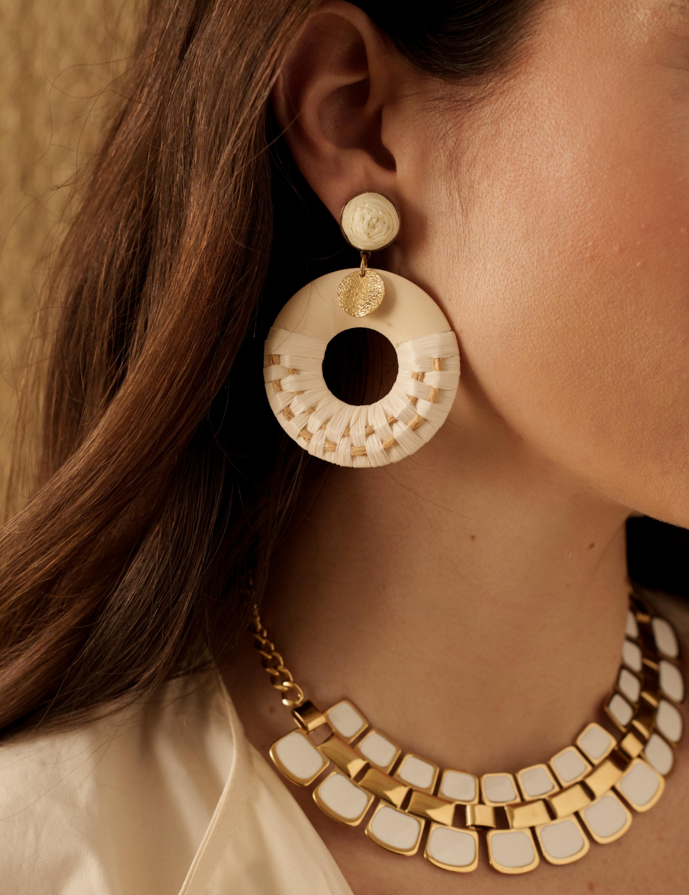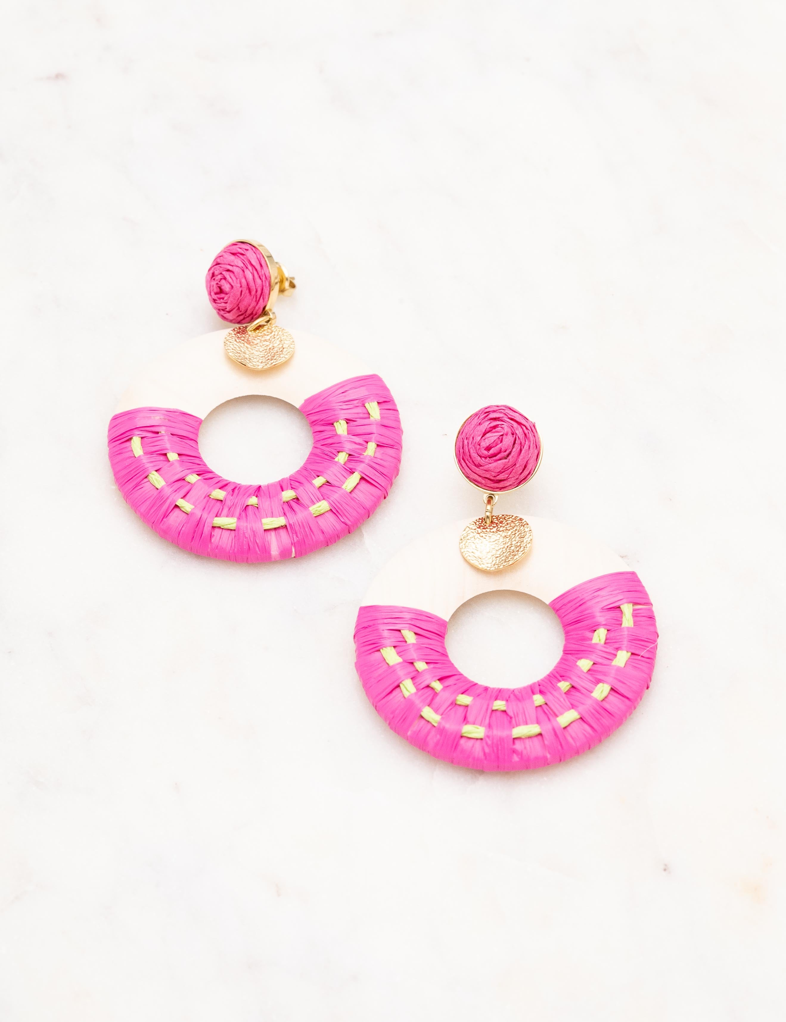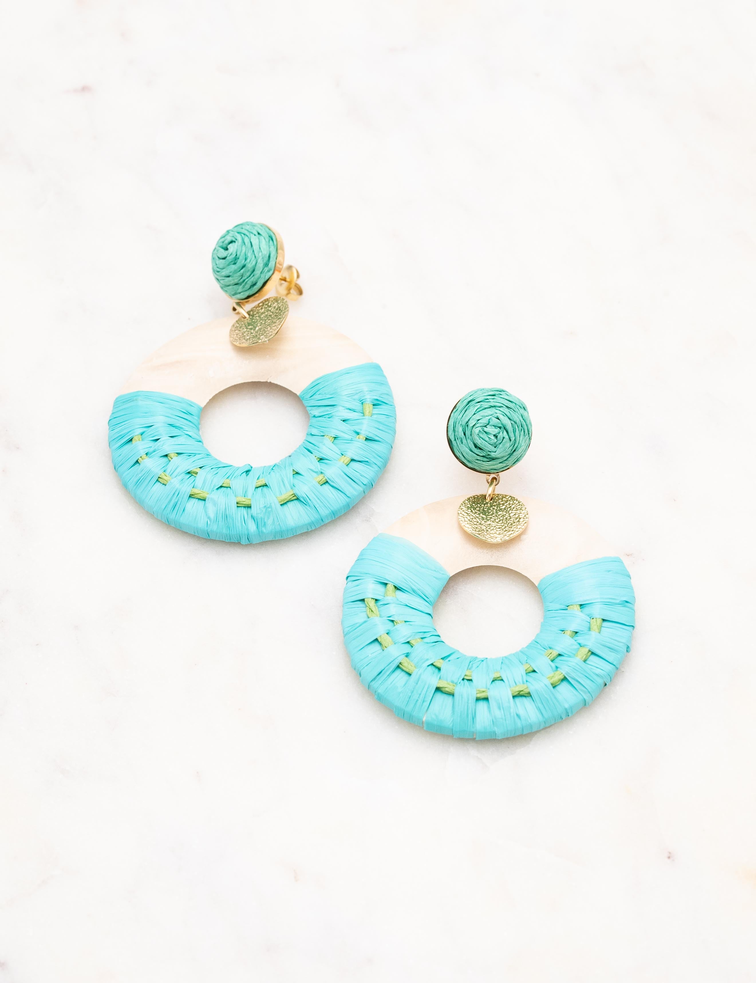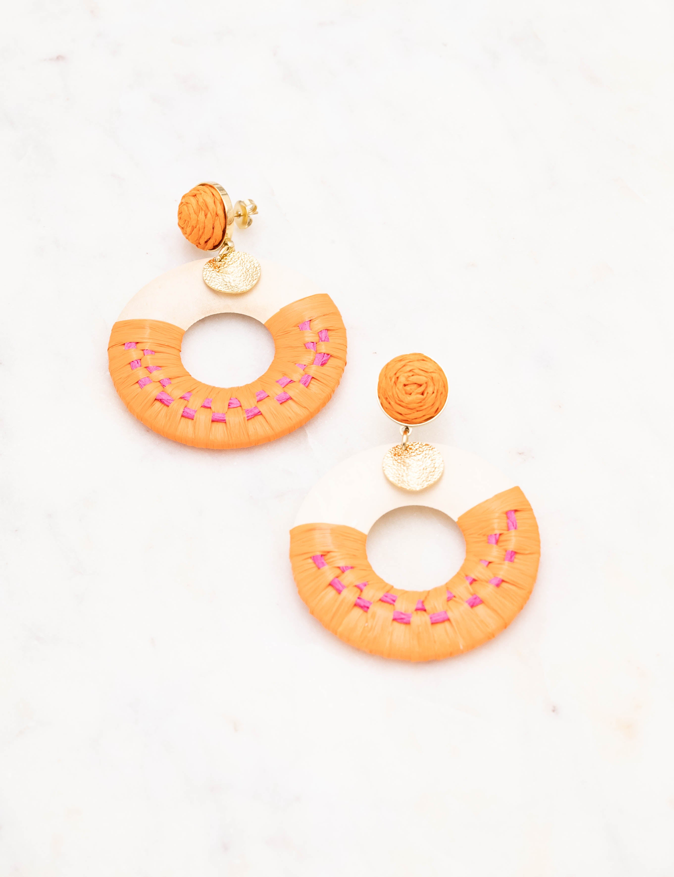 Boucles d'oreilles graphiques à puce pendantes en acier inoxydable et en bois ornées de raphia et d'une pampille ronde martelée.