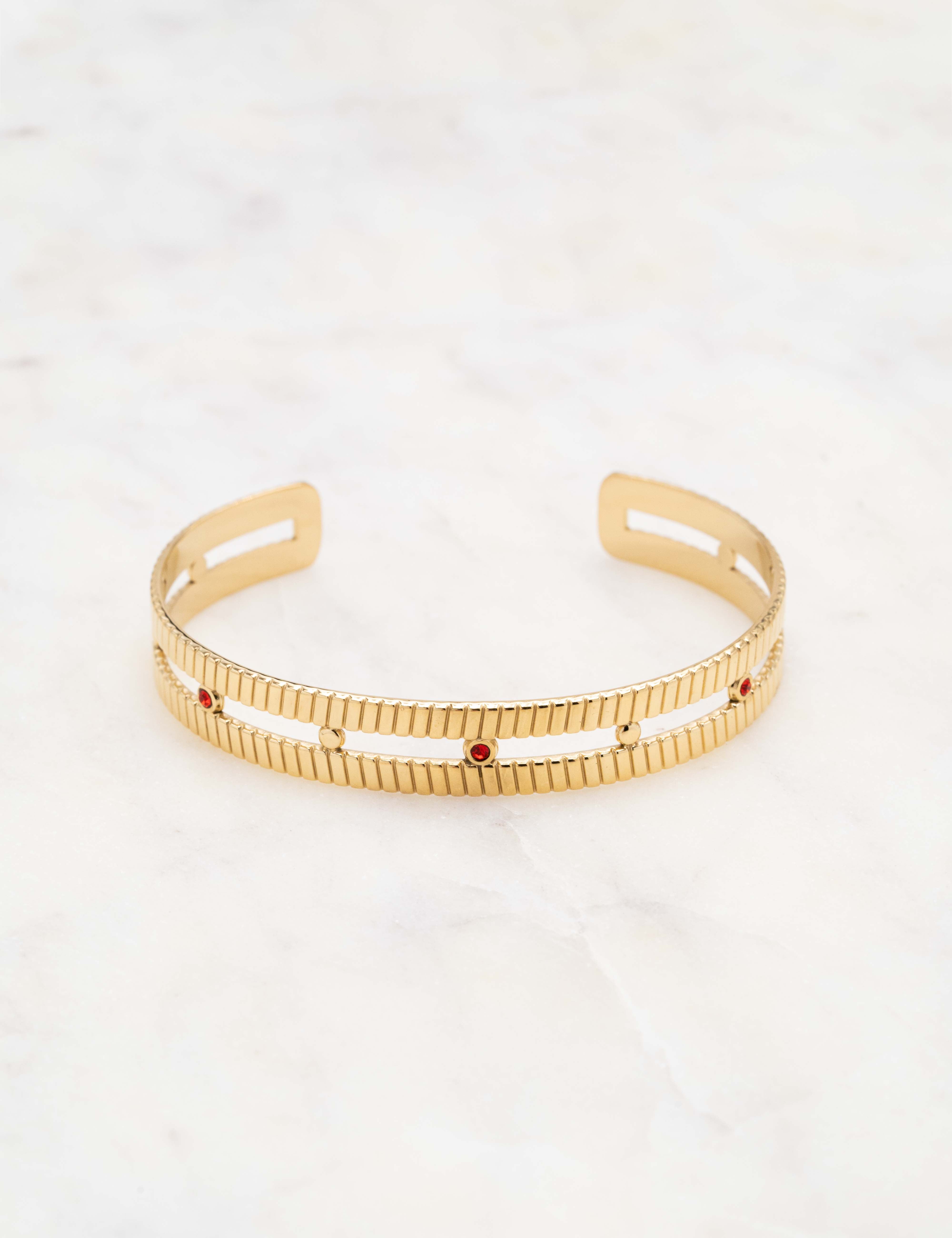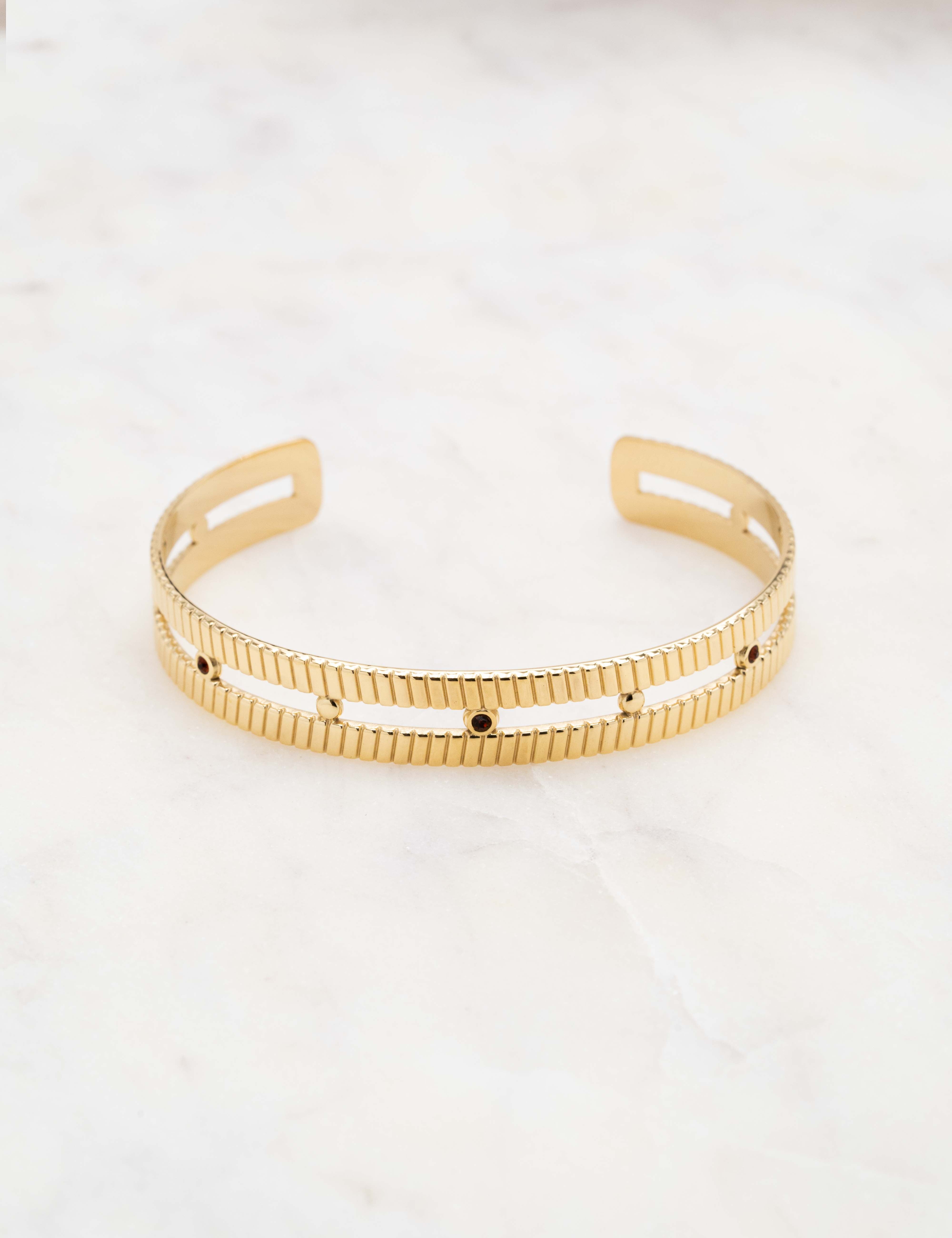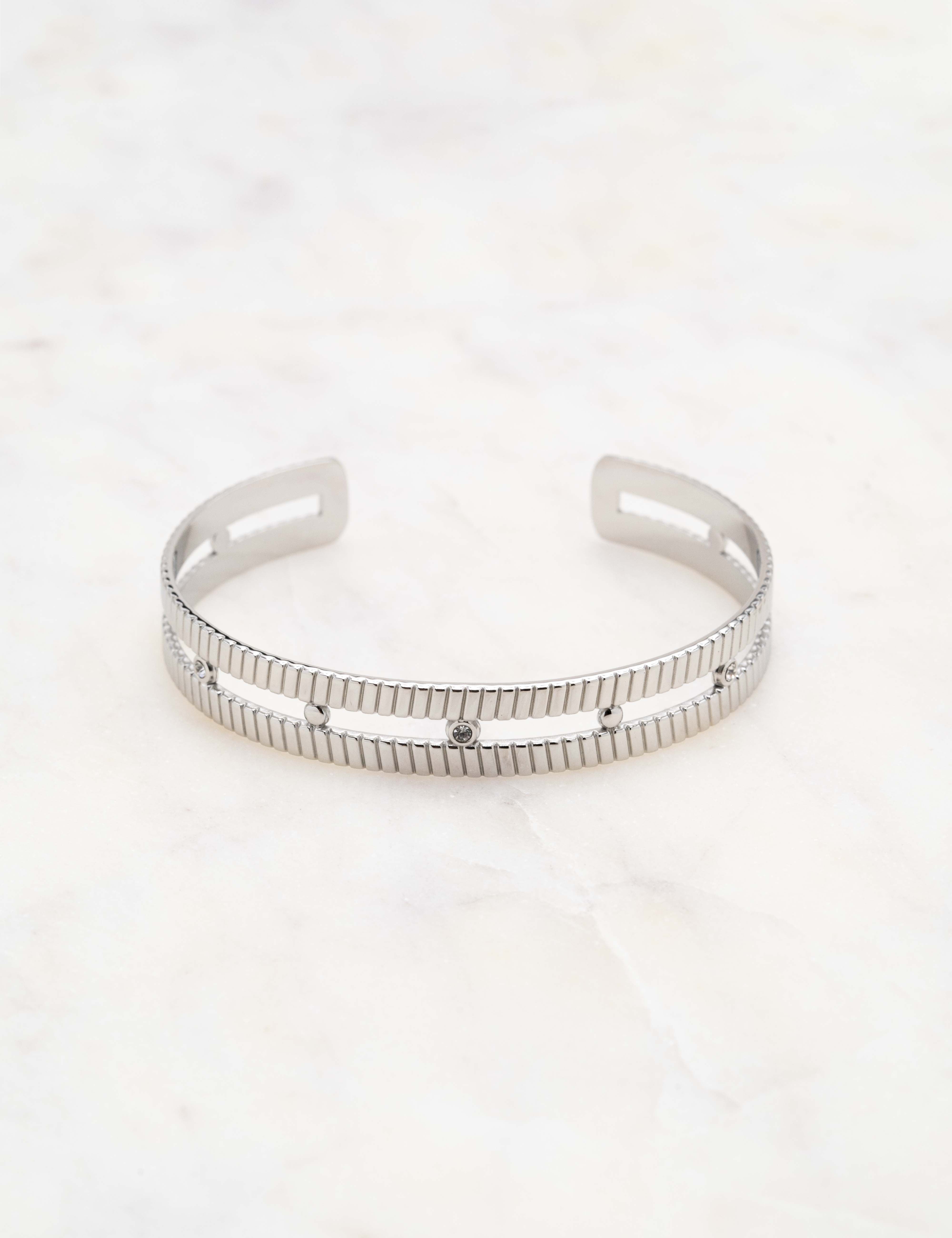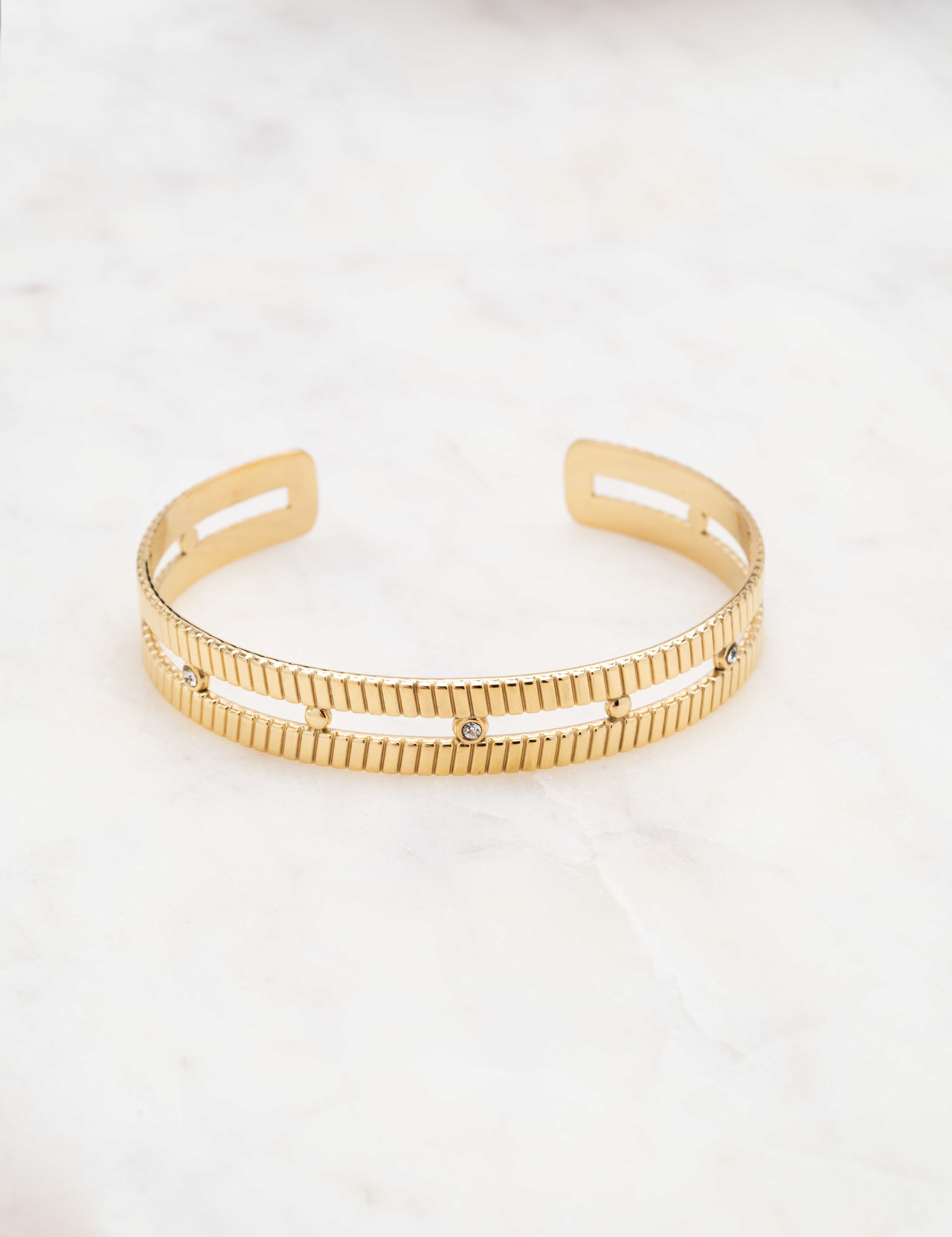 Bracelet type jonc malléable double rangs texturés orné de strass.