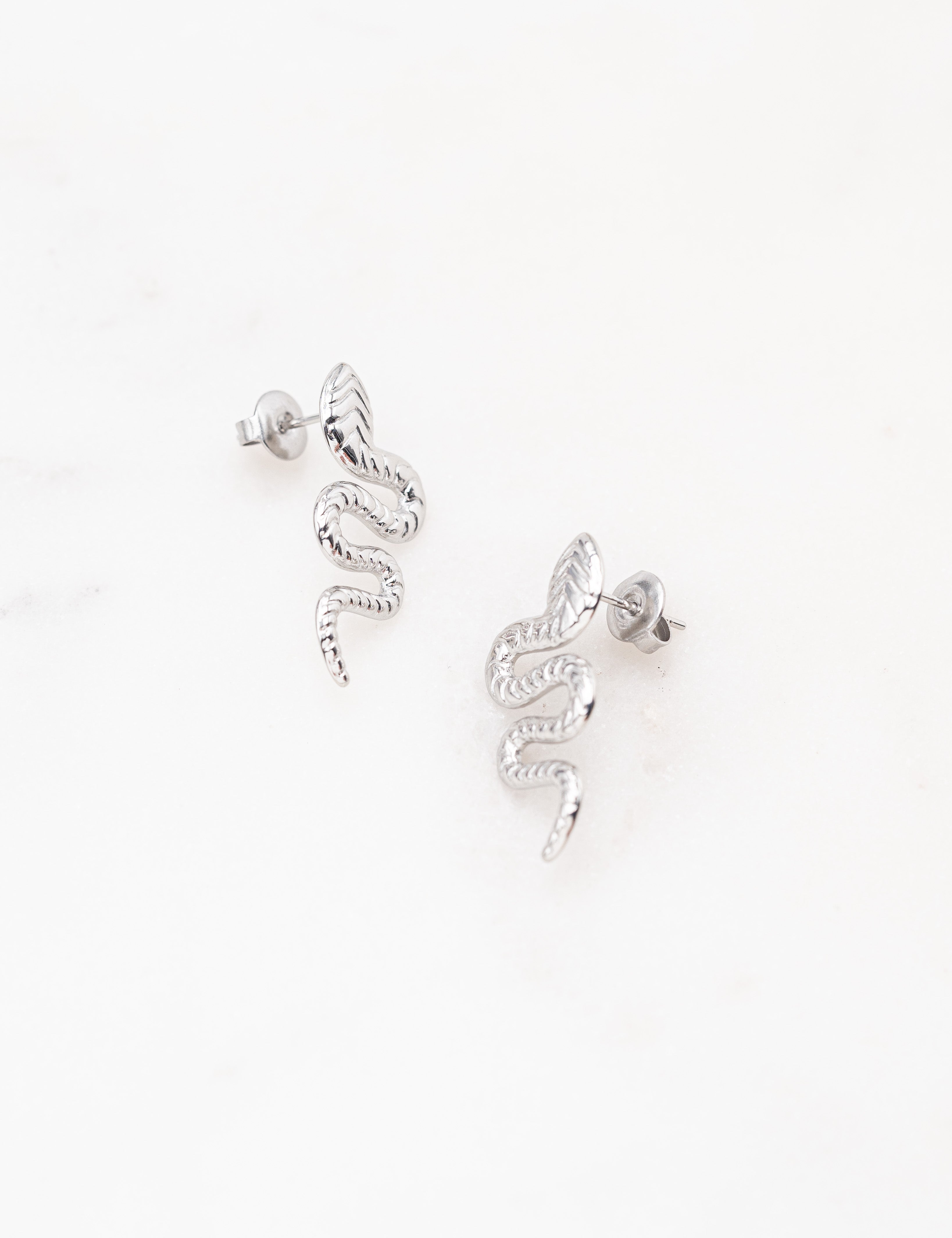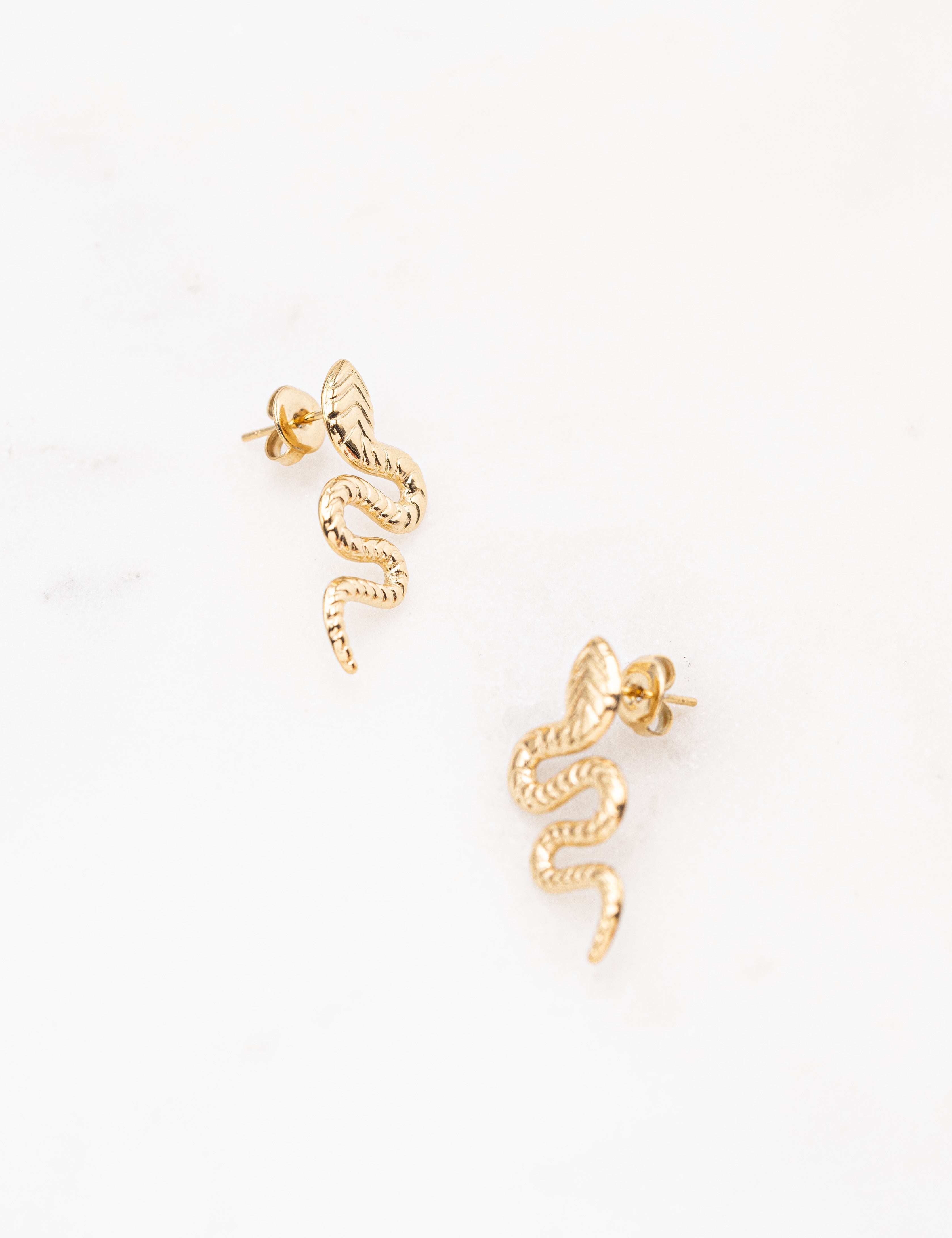 Boucles d'oreilles à puce avec motif serpent texturé . Disponible en doré et argenté. Fermoir papillon.