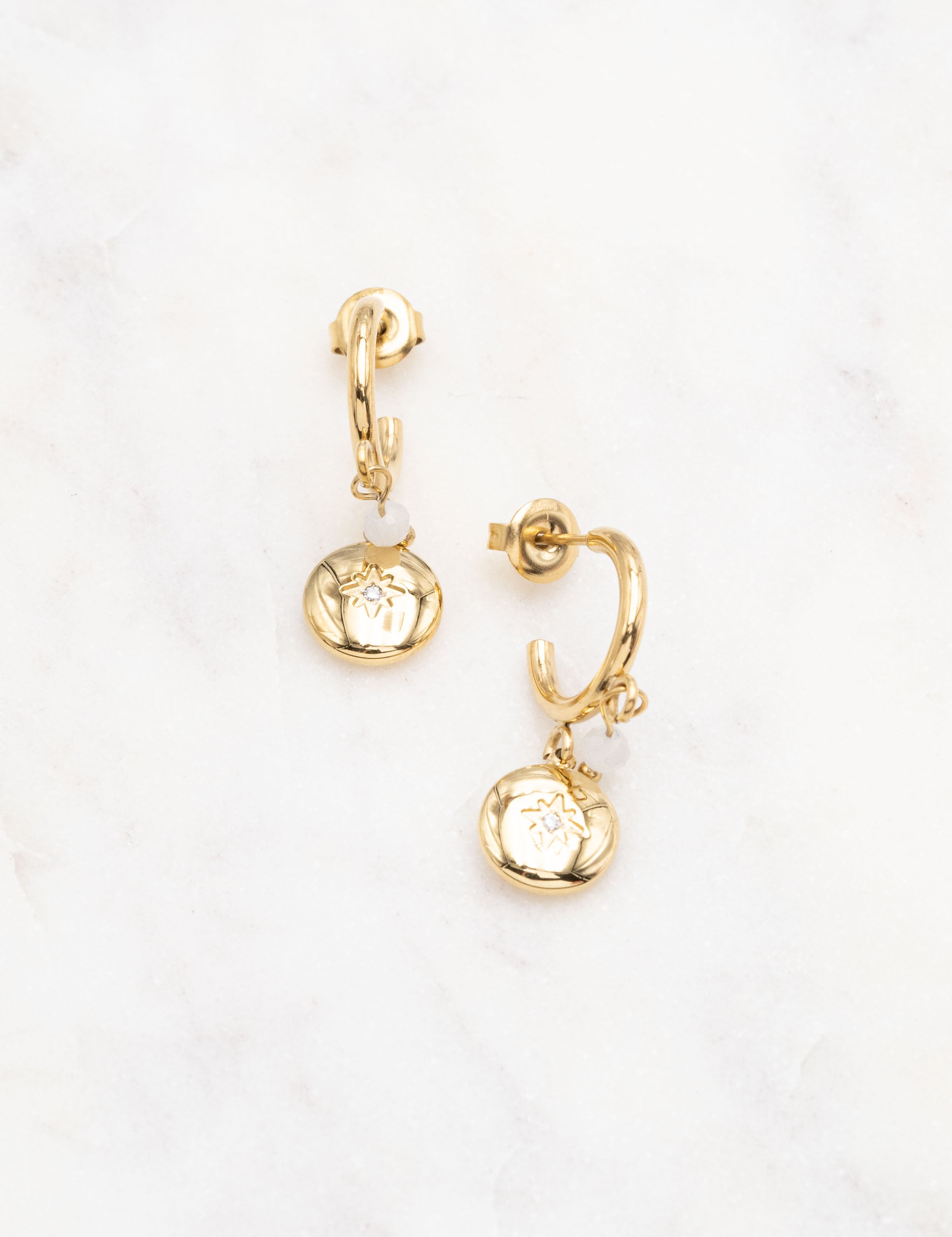 Boucles d'oreilles type créoles à puce composées d'une perle en pierres naturelles, d'une pièce ronde ornée d'une étoile gravée et d'un strass zirconium.