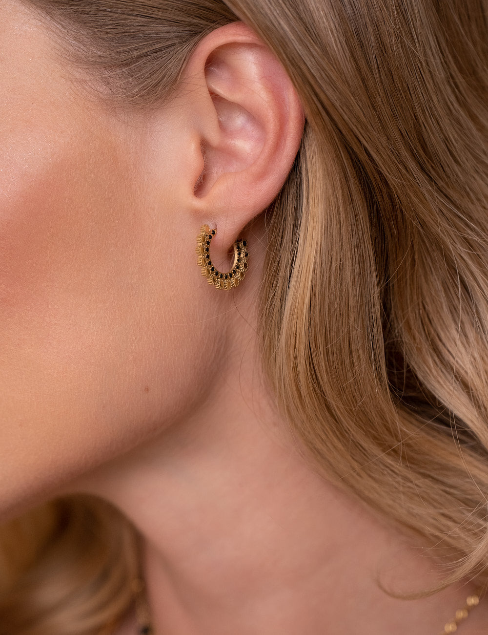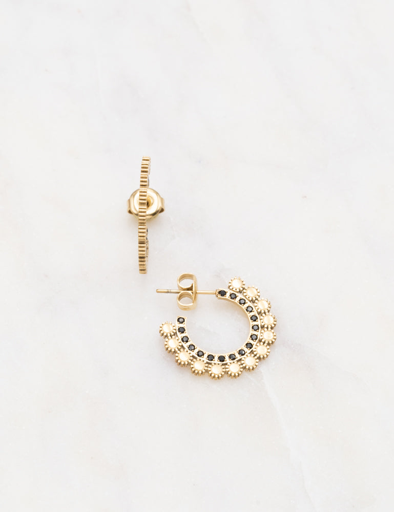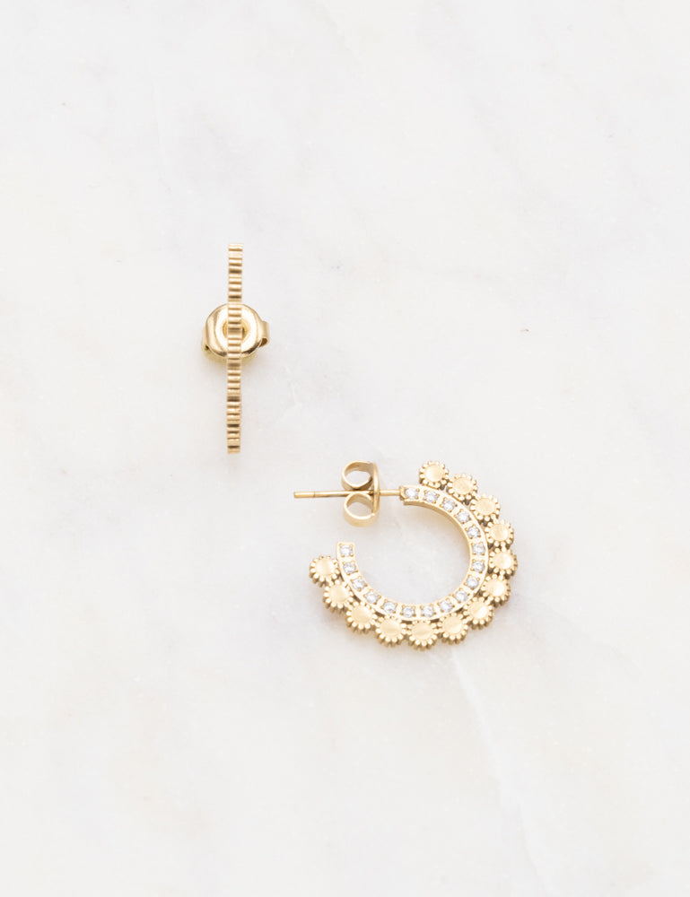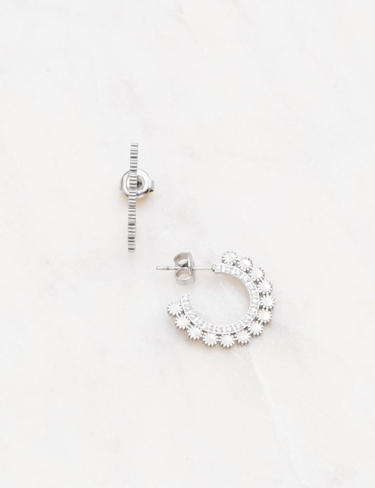 Boucles d'oreilles de type créoles à puce avec des motifs graphiques ornées de strass. (oxyde de zirconium)
