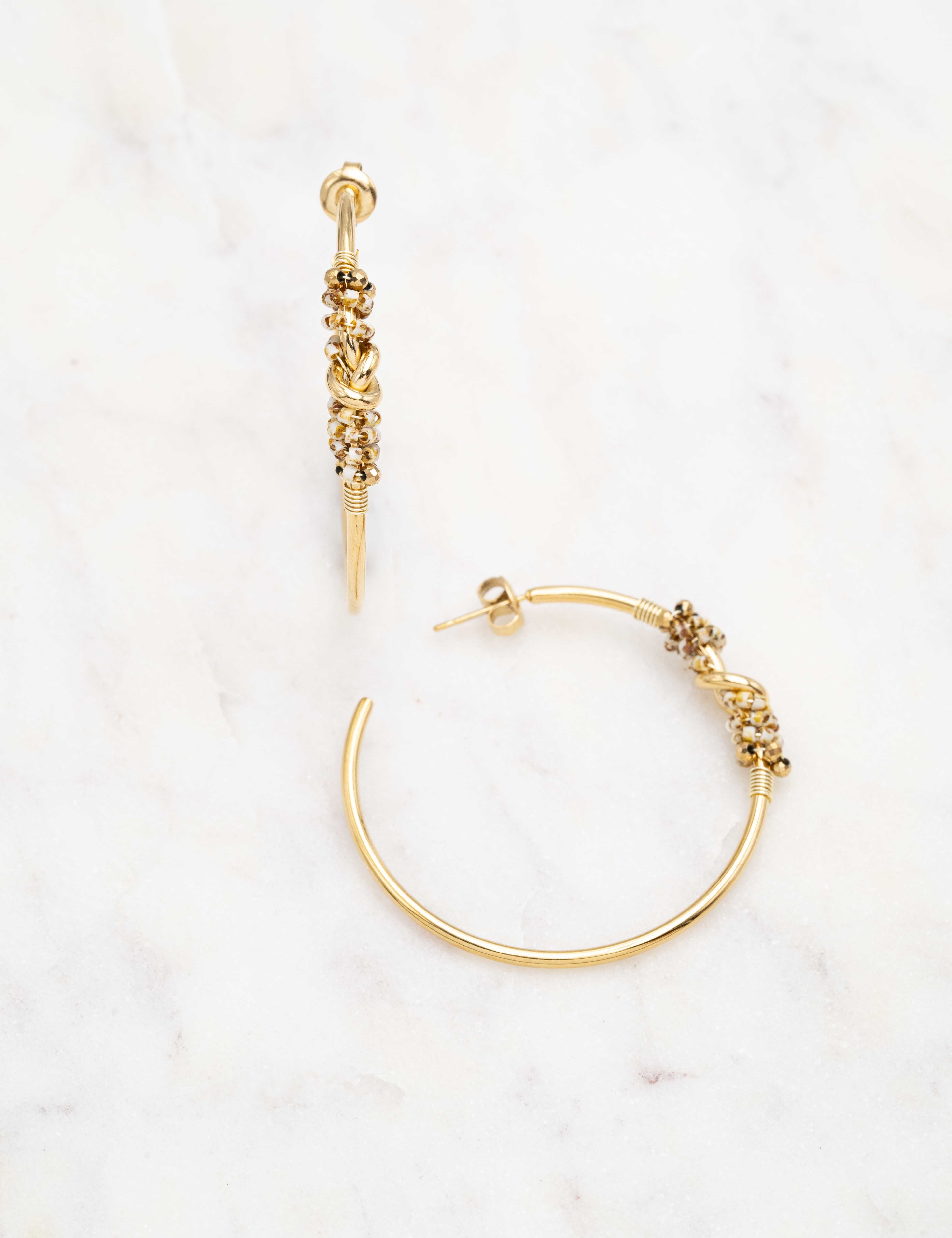 Boucles d'oreilles type créoles à puce composées d'un noeud et ornées de perles en pâte de verre type rocailles.