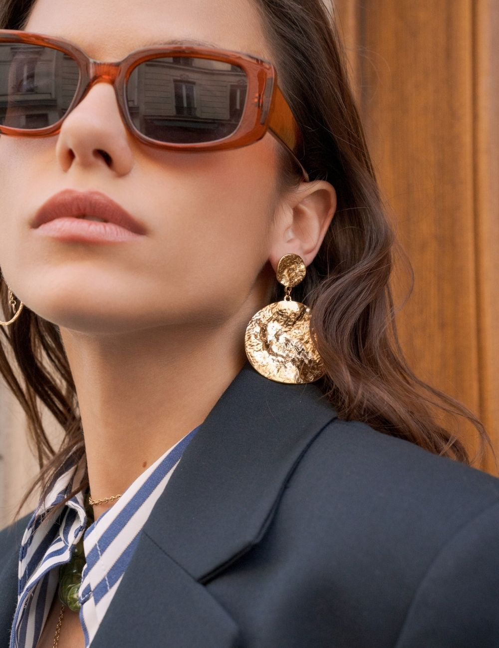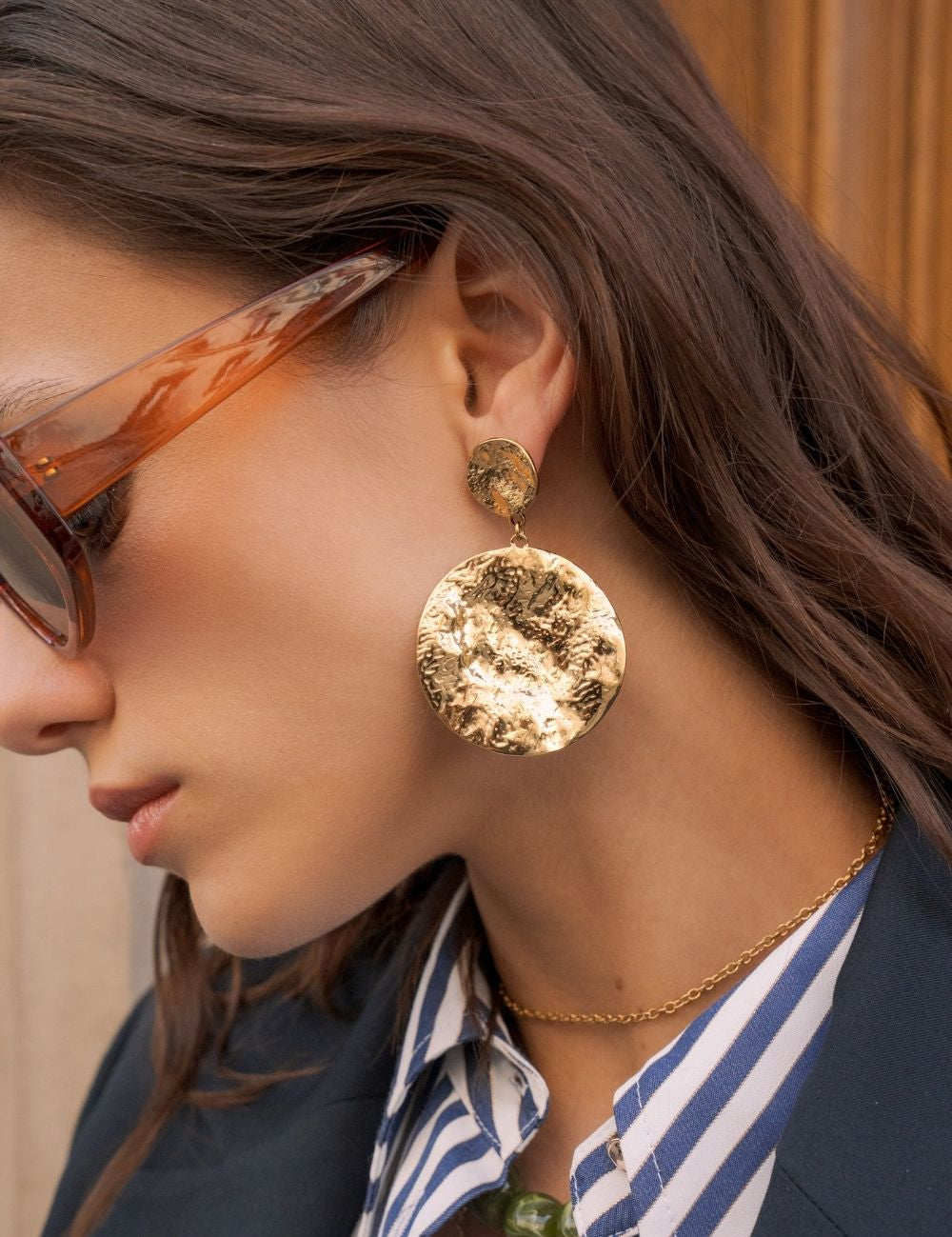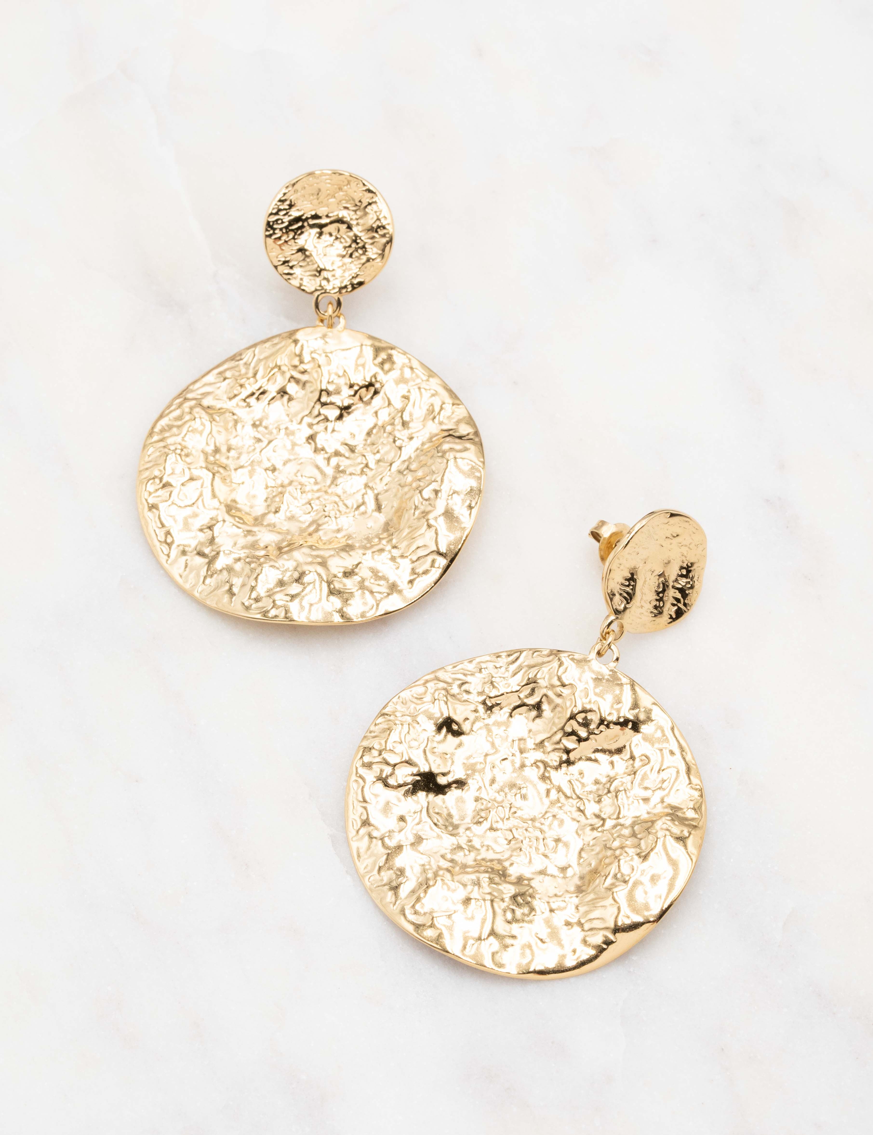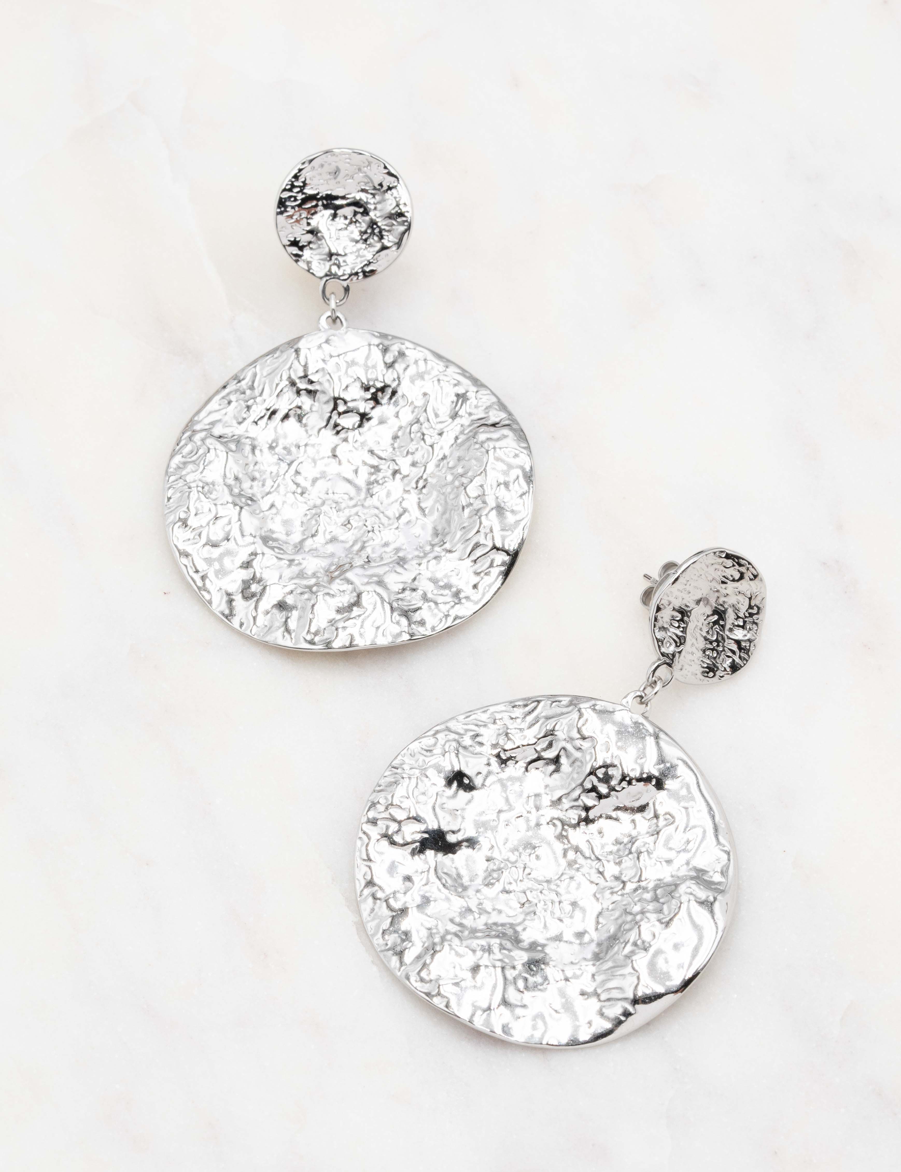 Boucles d'oreilles graphiques pendantes à puce composées de deux pièces martelées et reliefées.