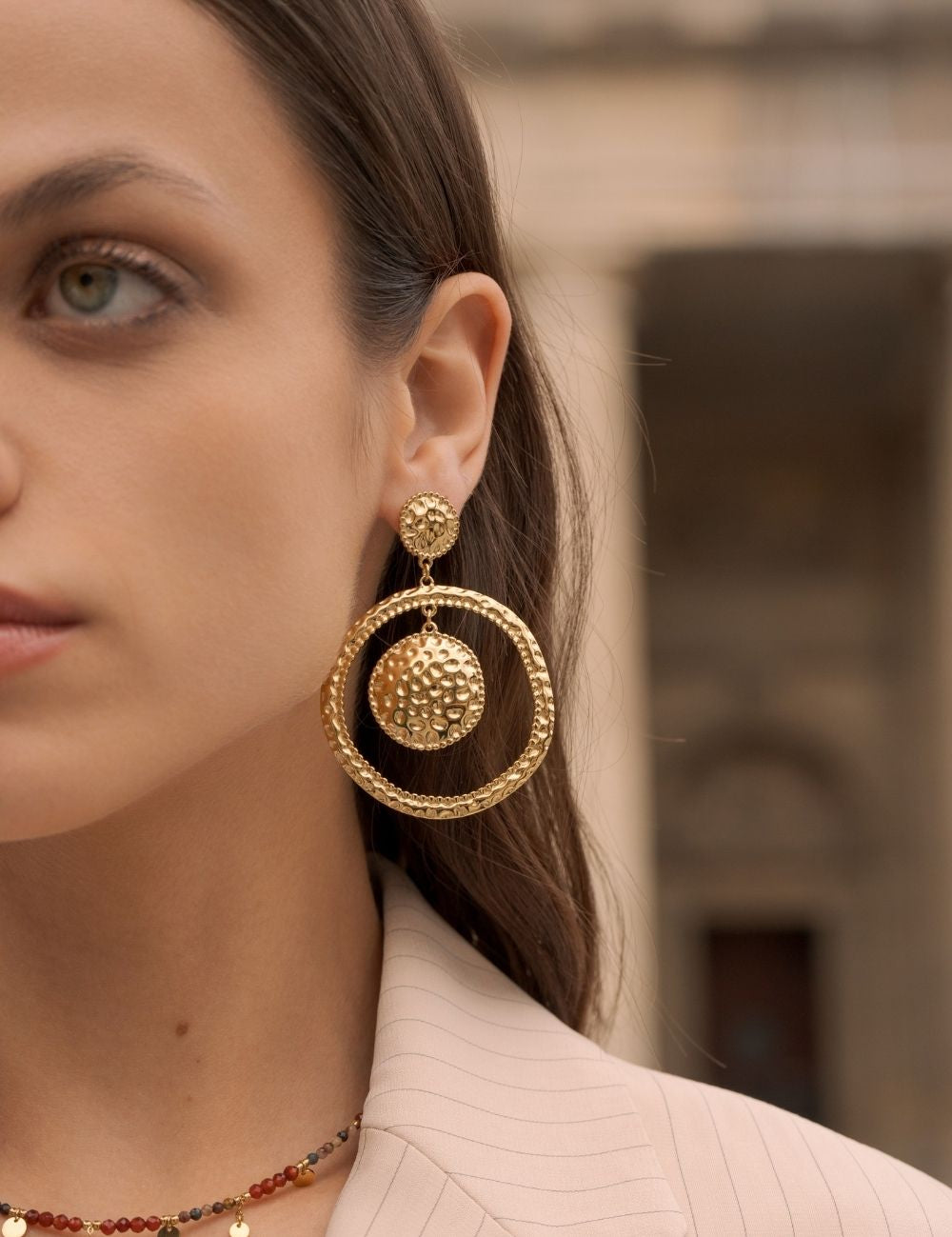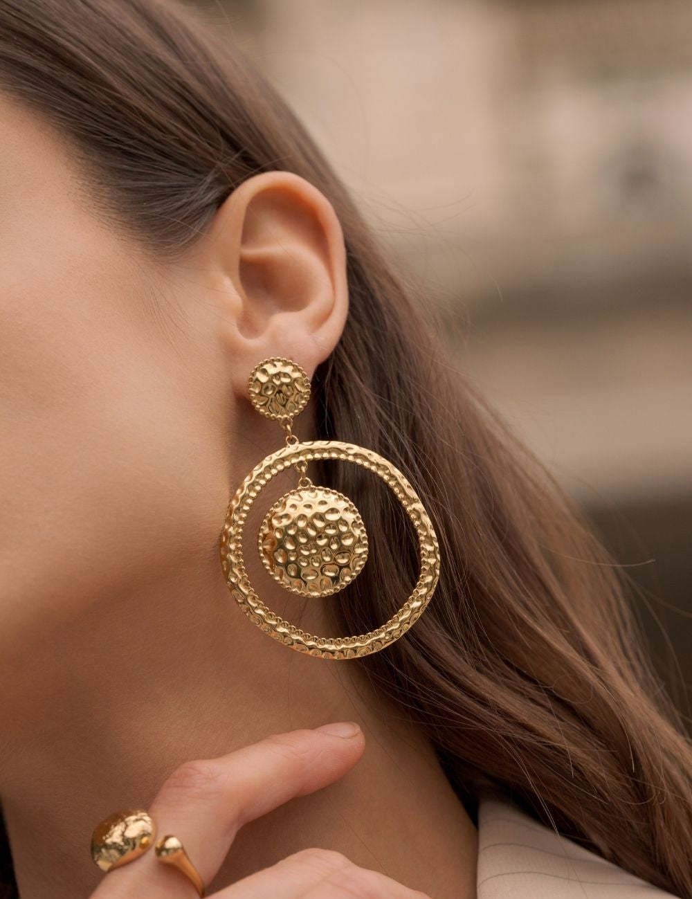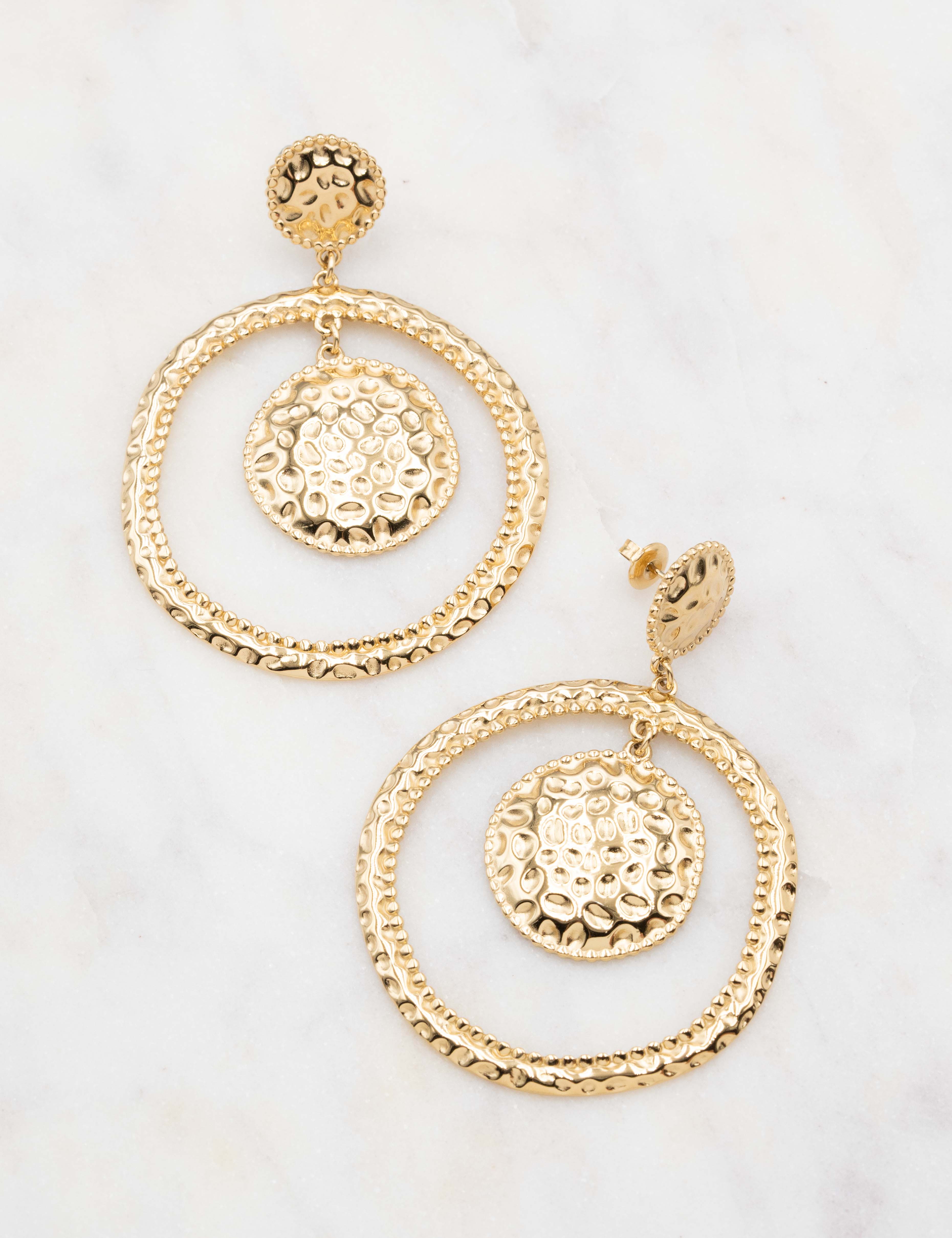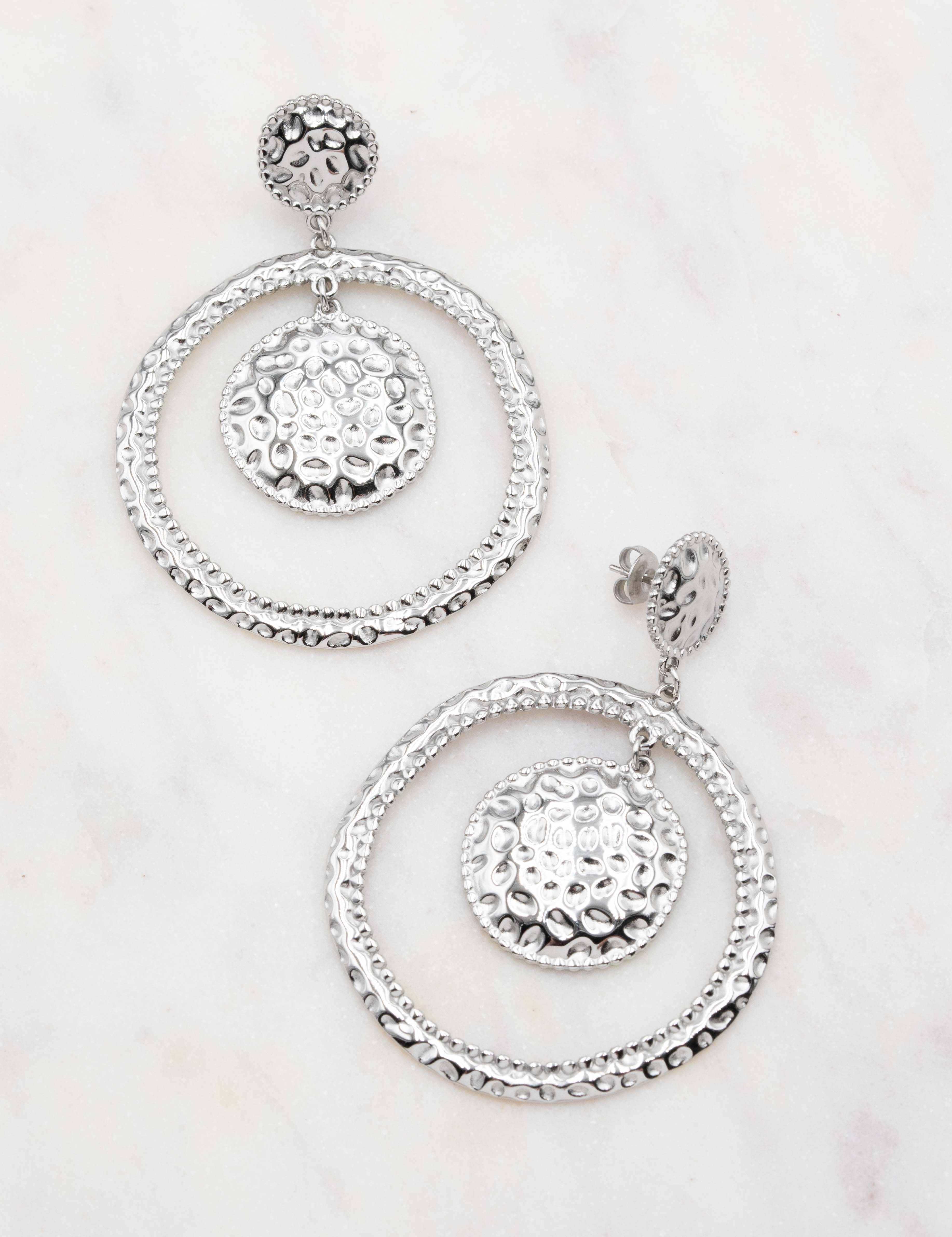 Boucles d'oreilles graphiques pendantes à puce composées d'un jeu de pièces rondes martelées et d'une pièce texturée ajourée.