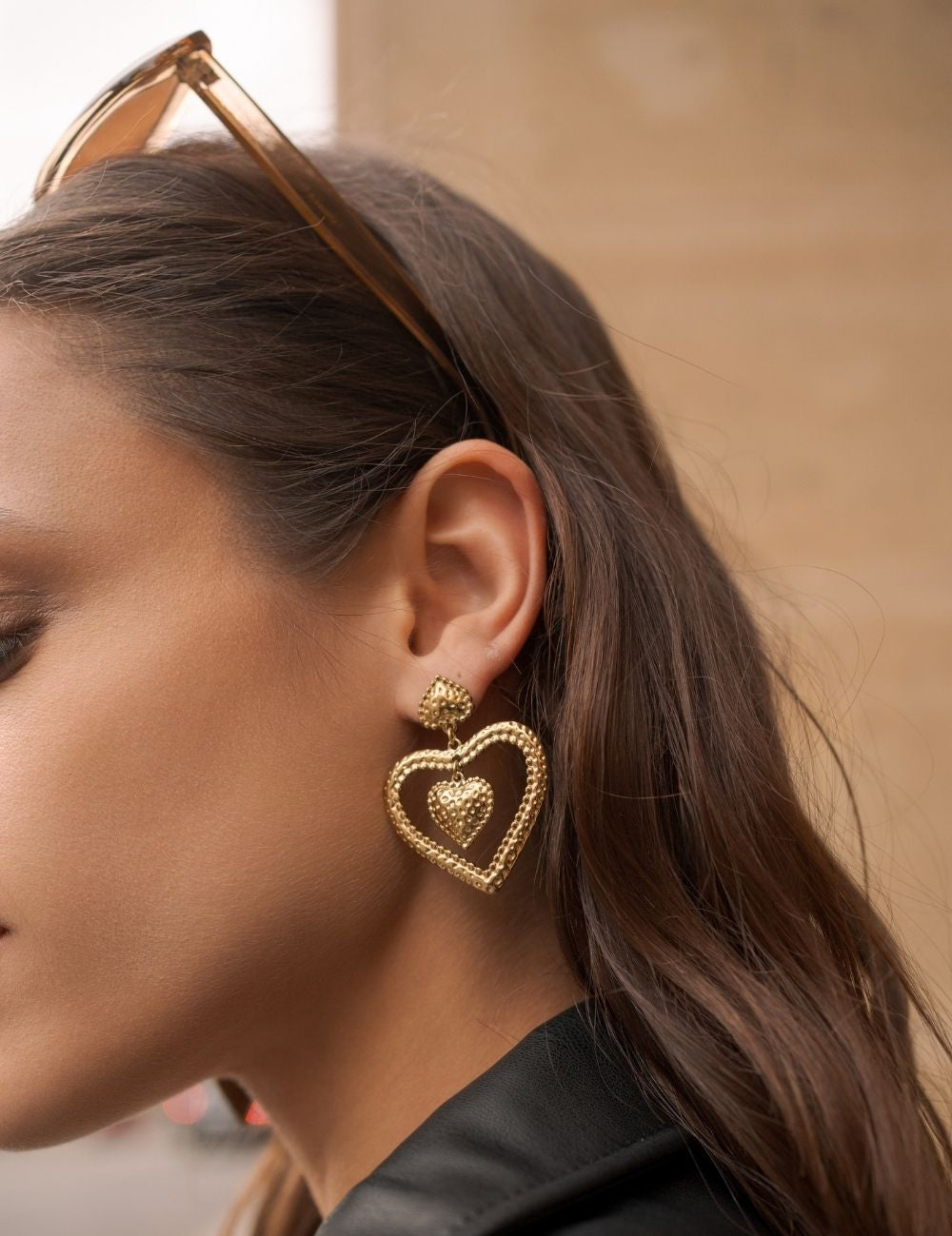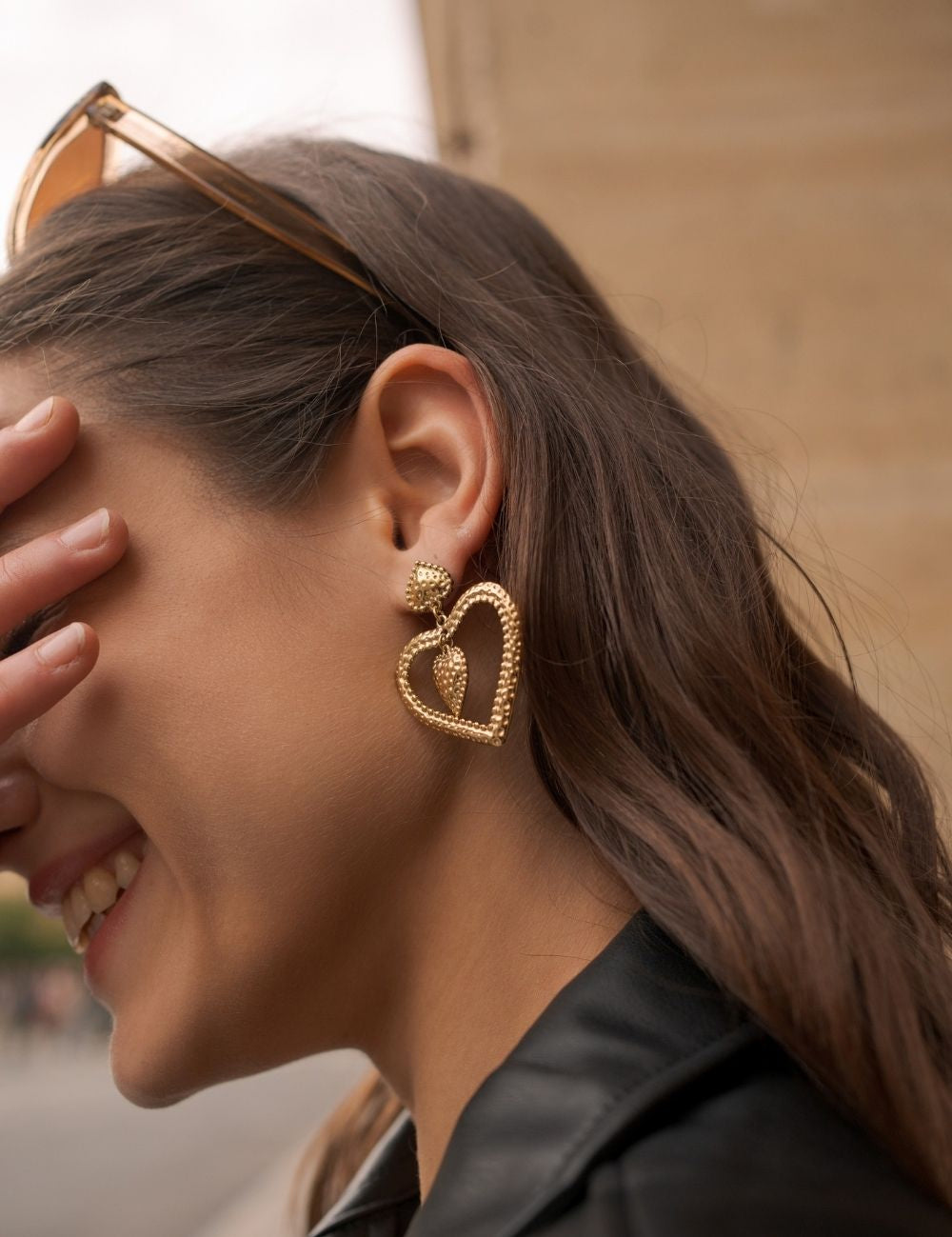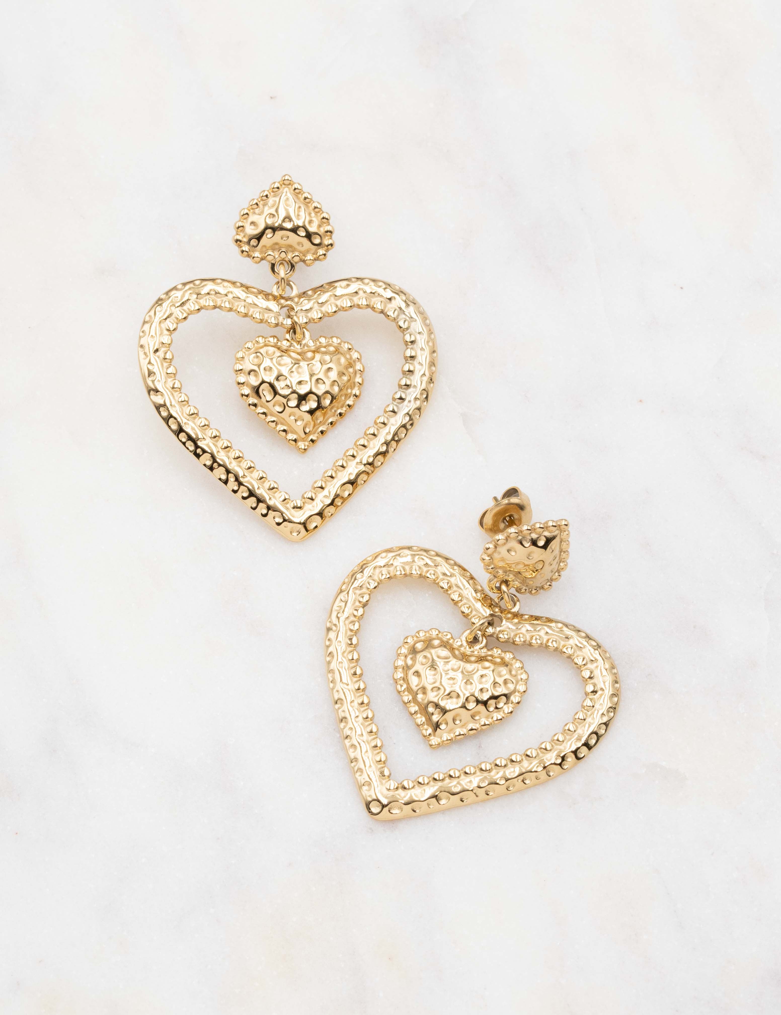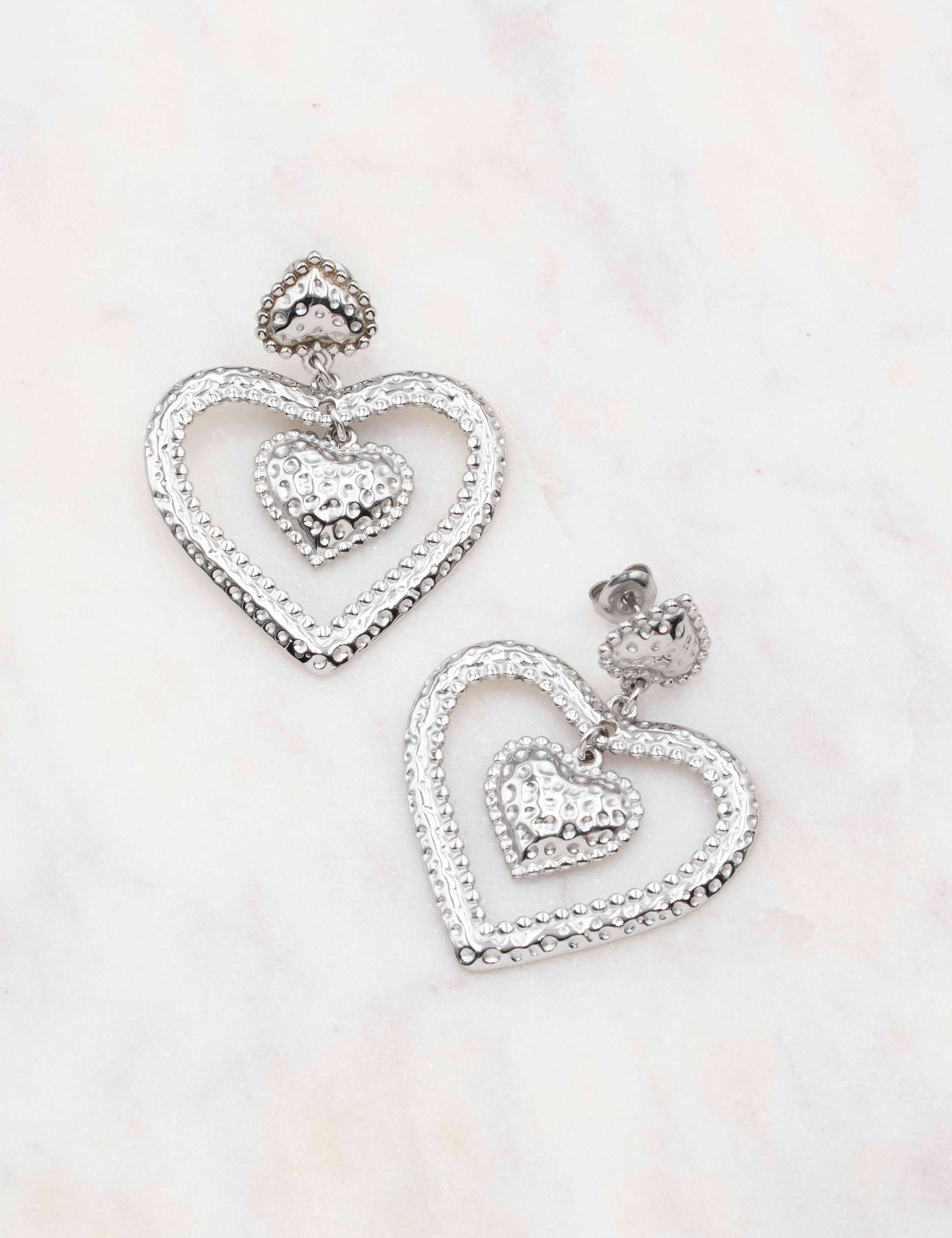 Boucles d'oreilles graphiques pendantes à puce composées d'un jeu de pièces martelées et d'une pièce texturée ajourée (forme coeur).