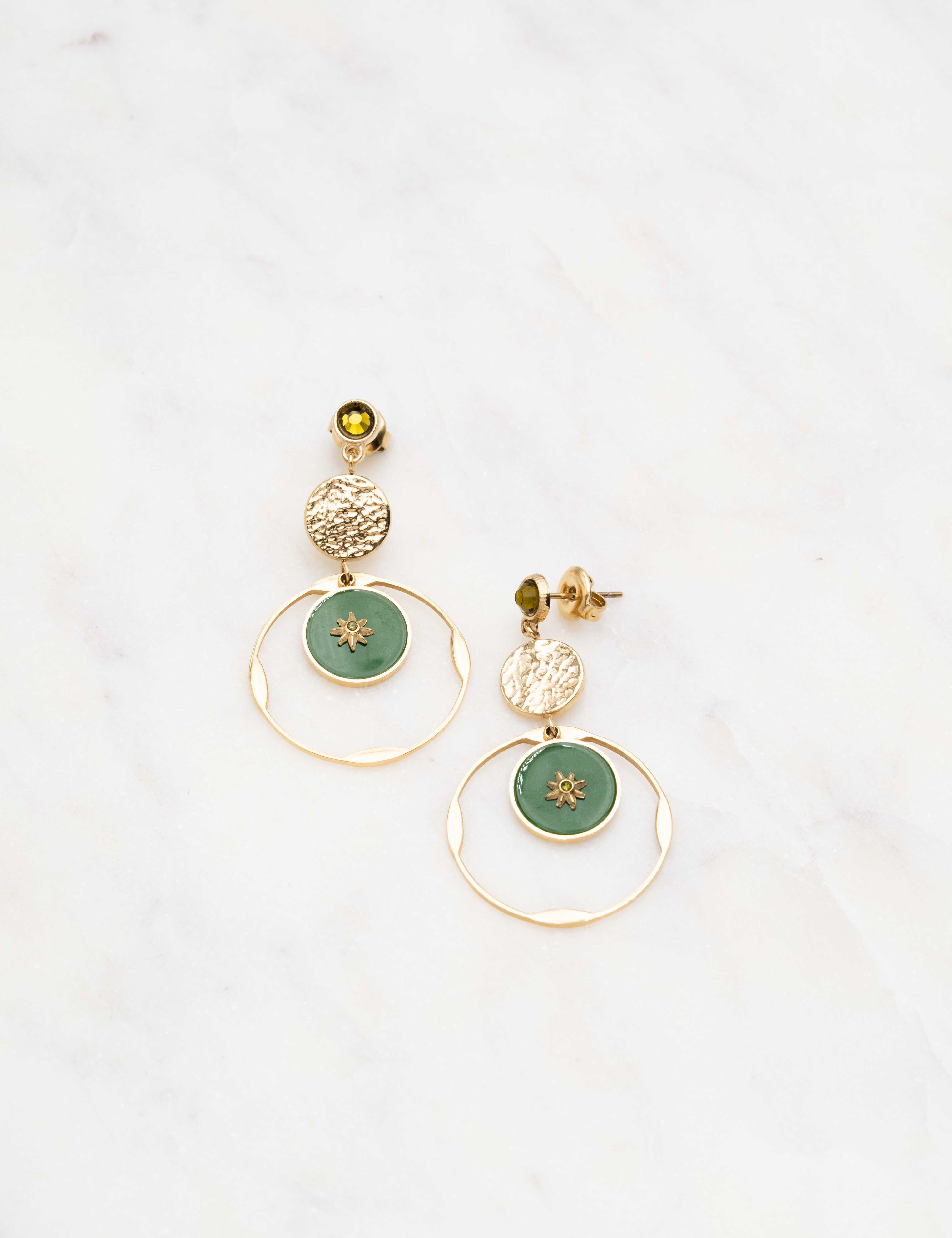 Boucles d'oreilles graphiques à puce composées d'une pièce ronde martelée, d'un anneau texturé, d'une pièce ronde émaillée colorée ornée d'une étoile et d'un strass.