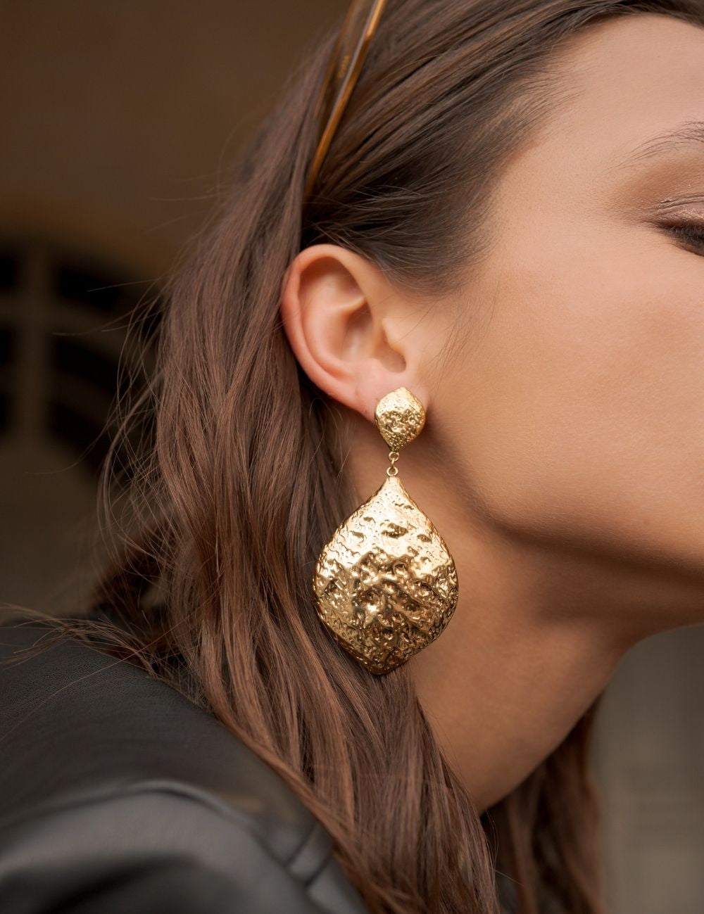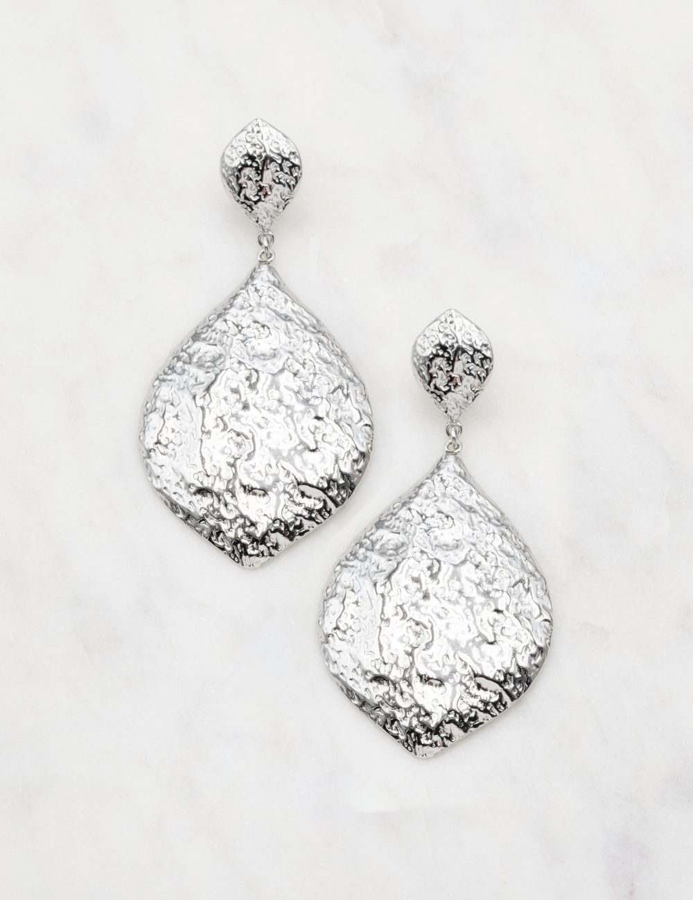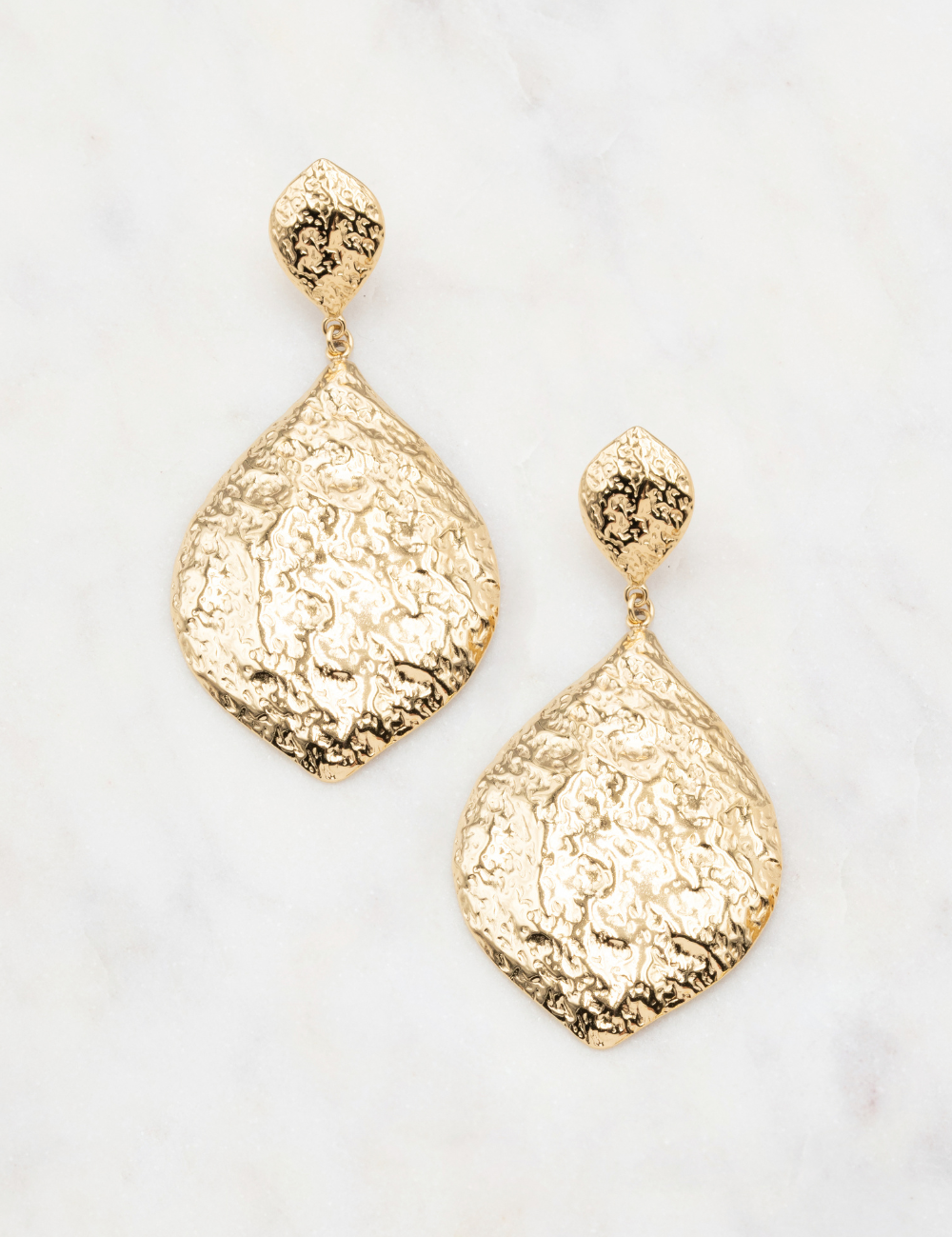 Boucles d'oreilles graphiques pendantes à puce composées de deux pièces martelées.