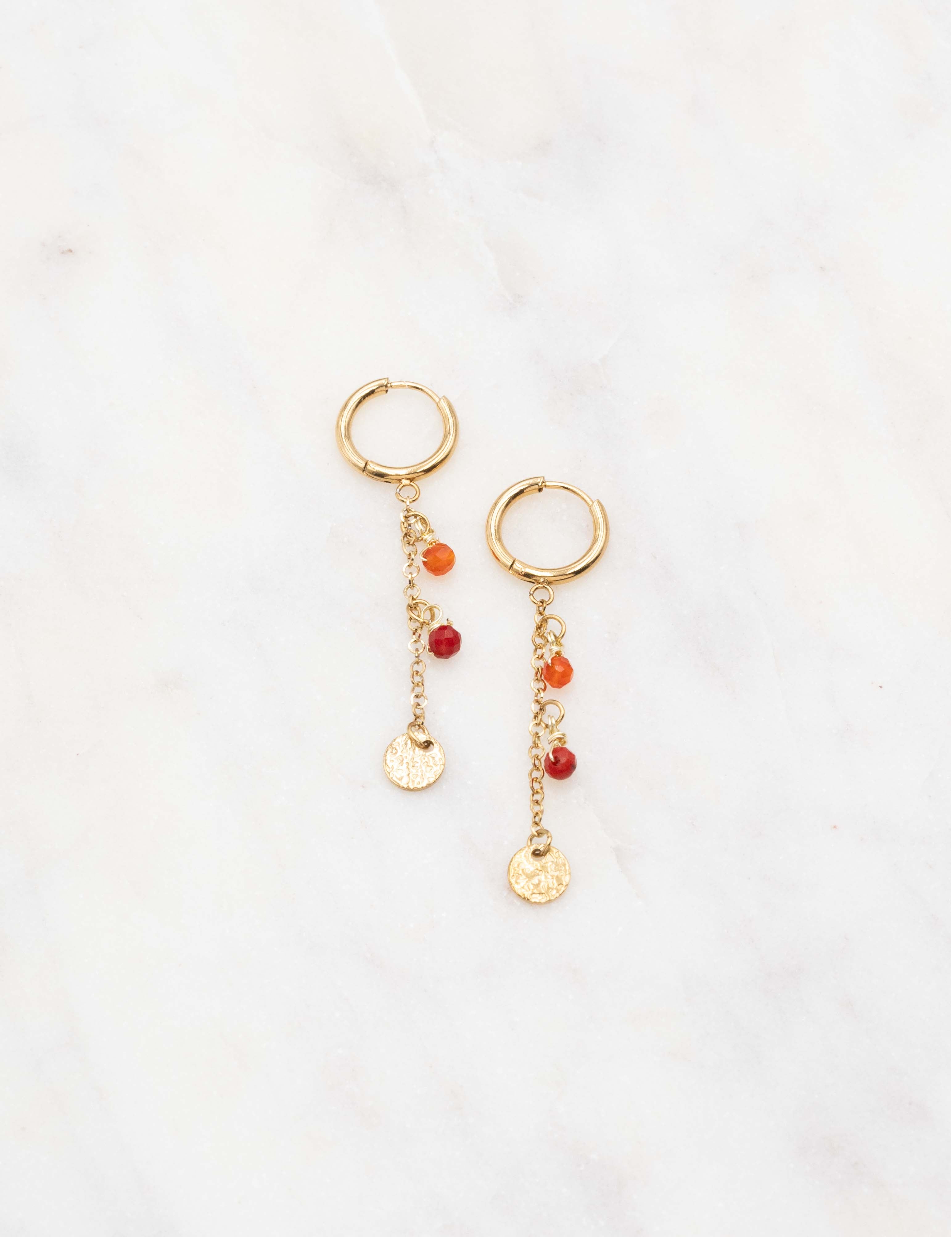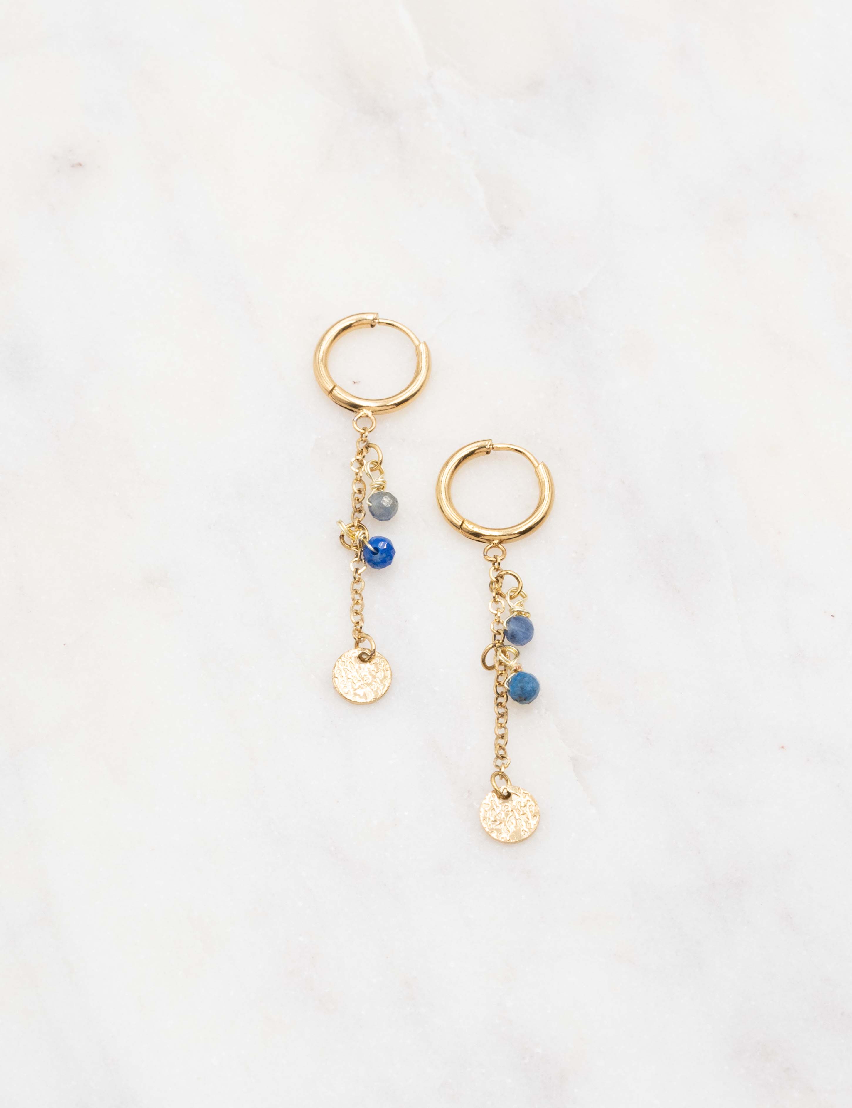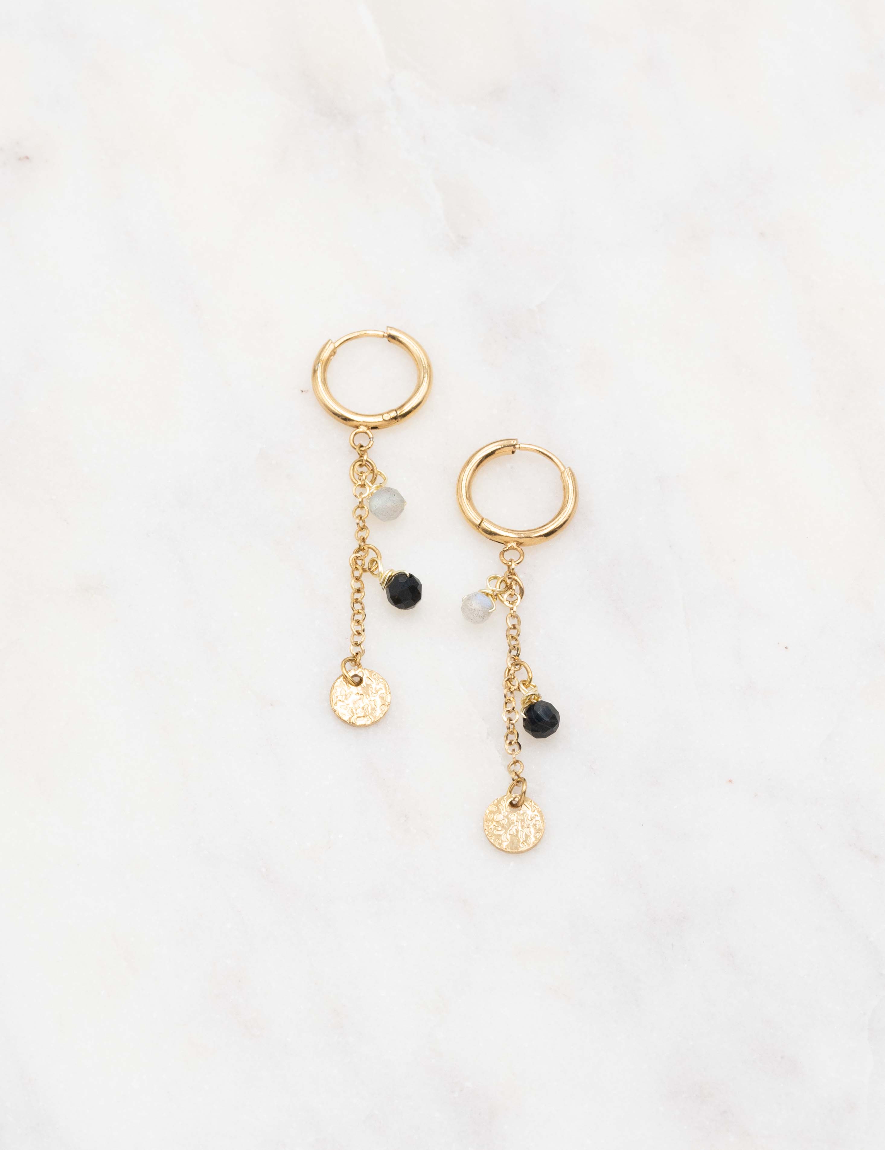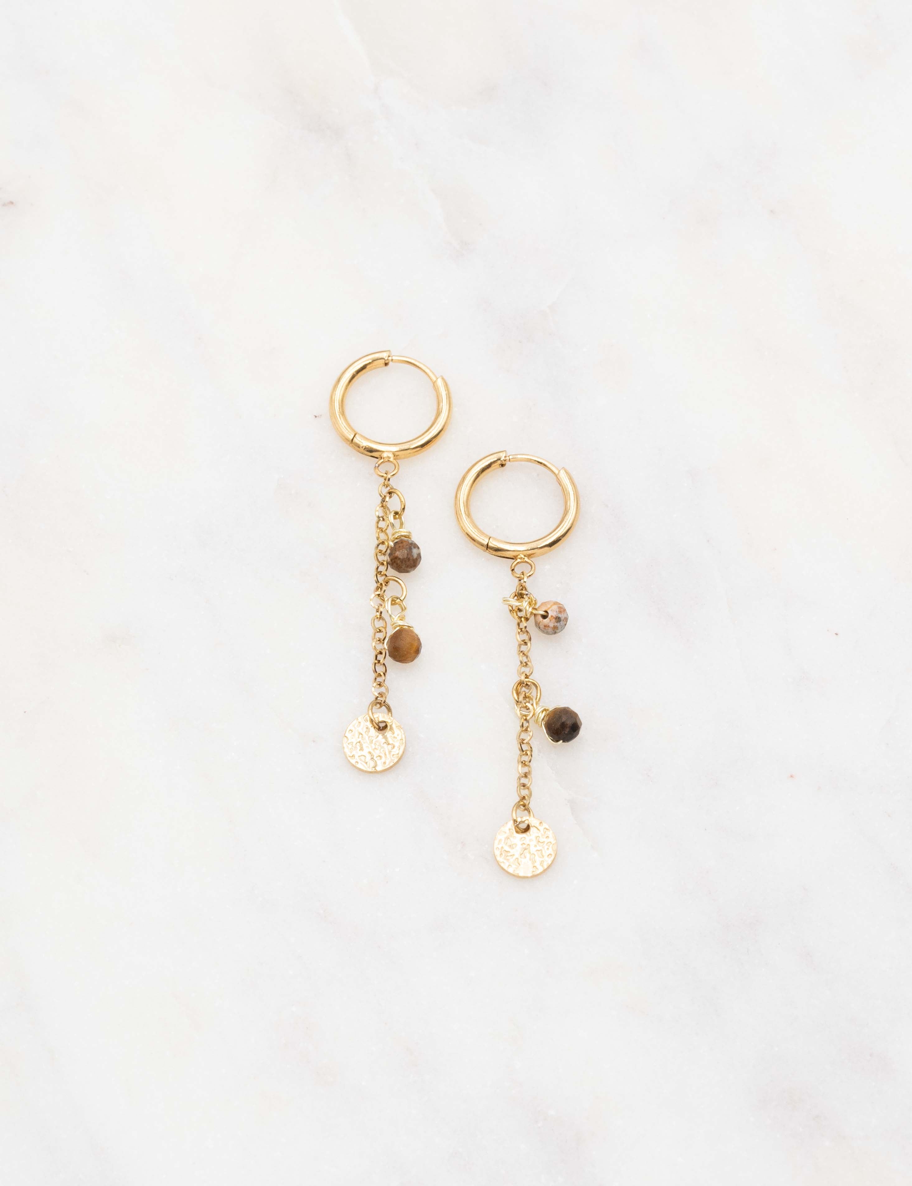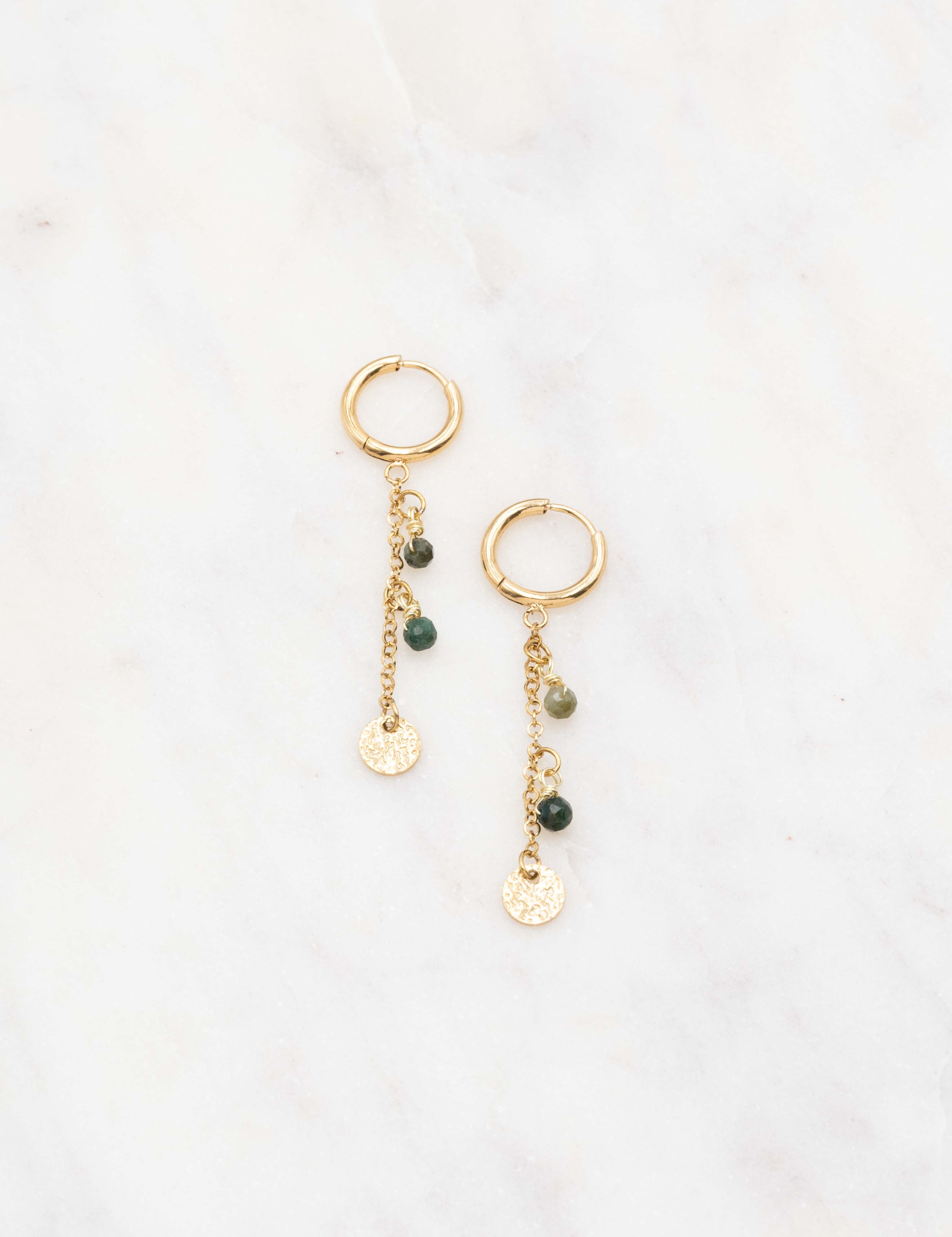 Boucles d'oreilles graphiques type créoles composées d'une chaine ornée de pierres naturelles, pate de verre et de pampilles rondes dorées martelées.