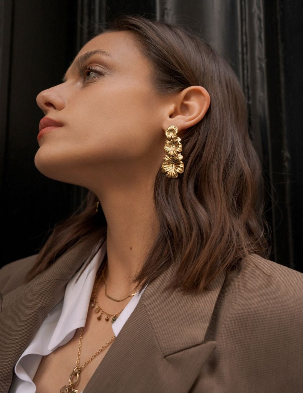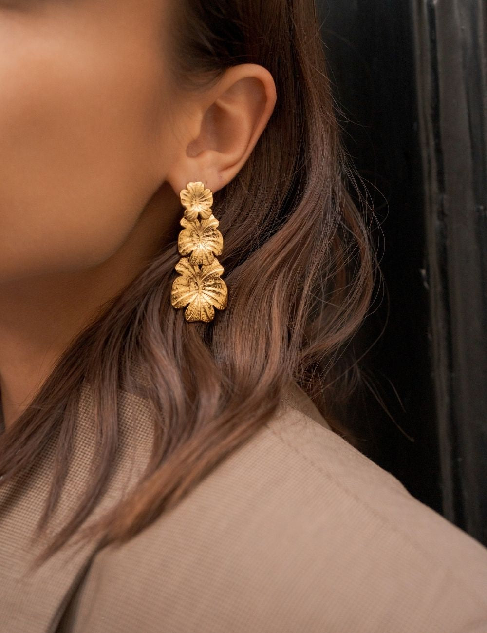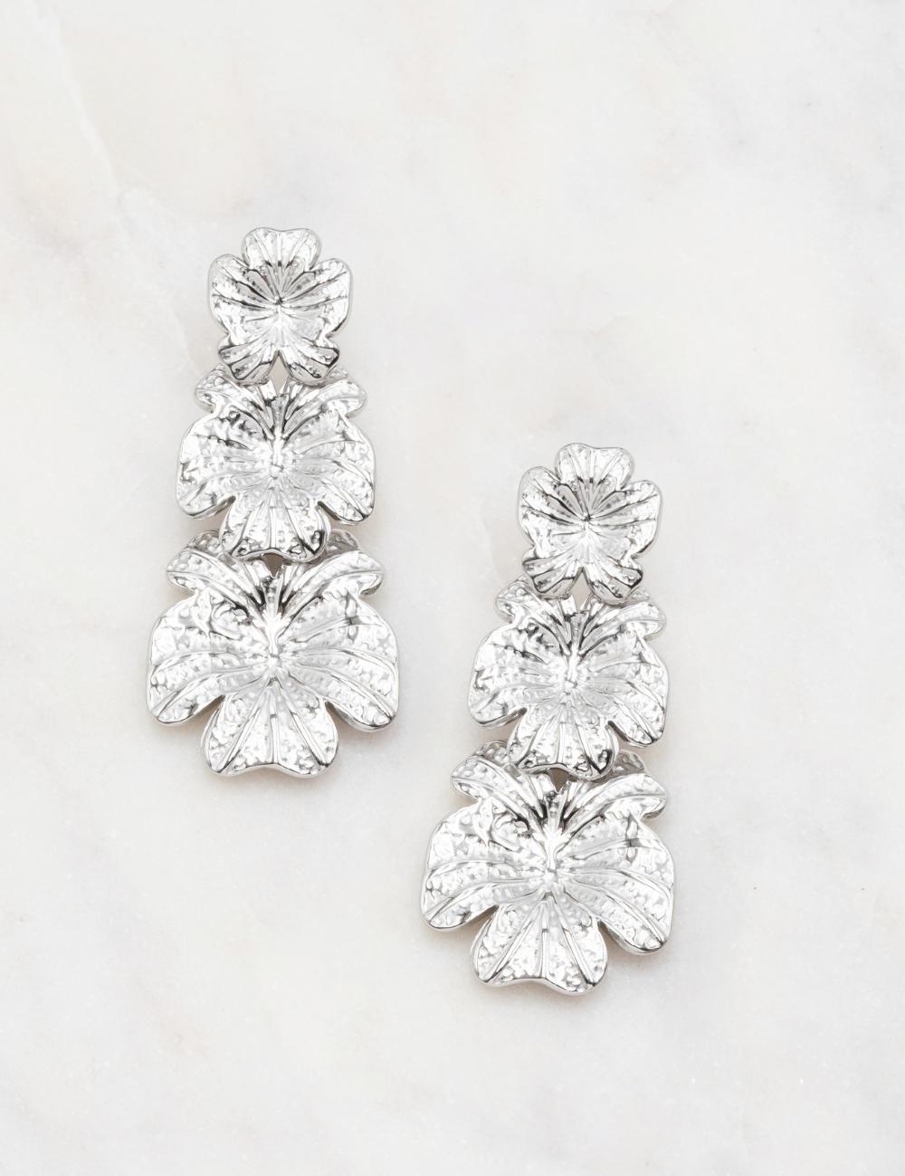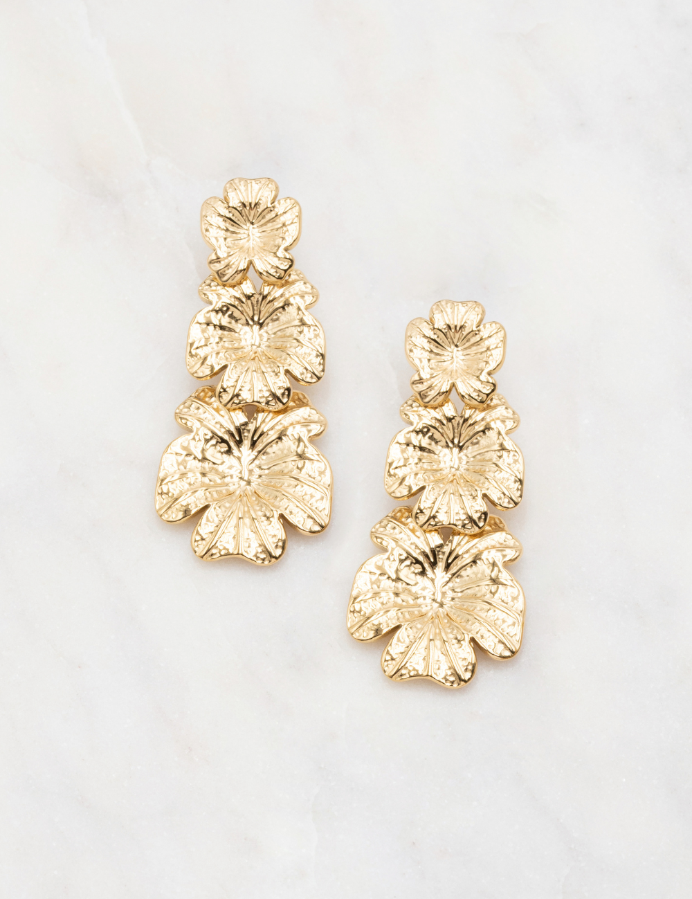 Boucles d'oreilles graphiques pendantes à puce composées de trois pièces au motif floral texturé.