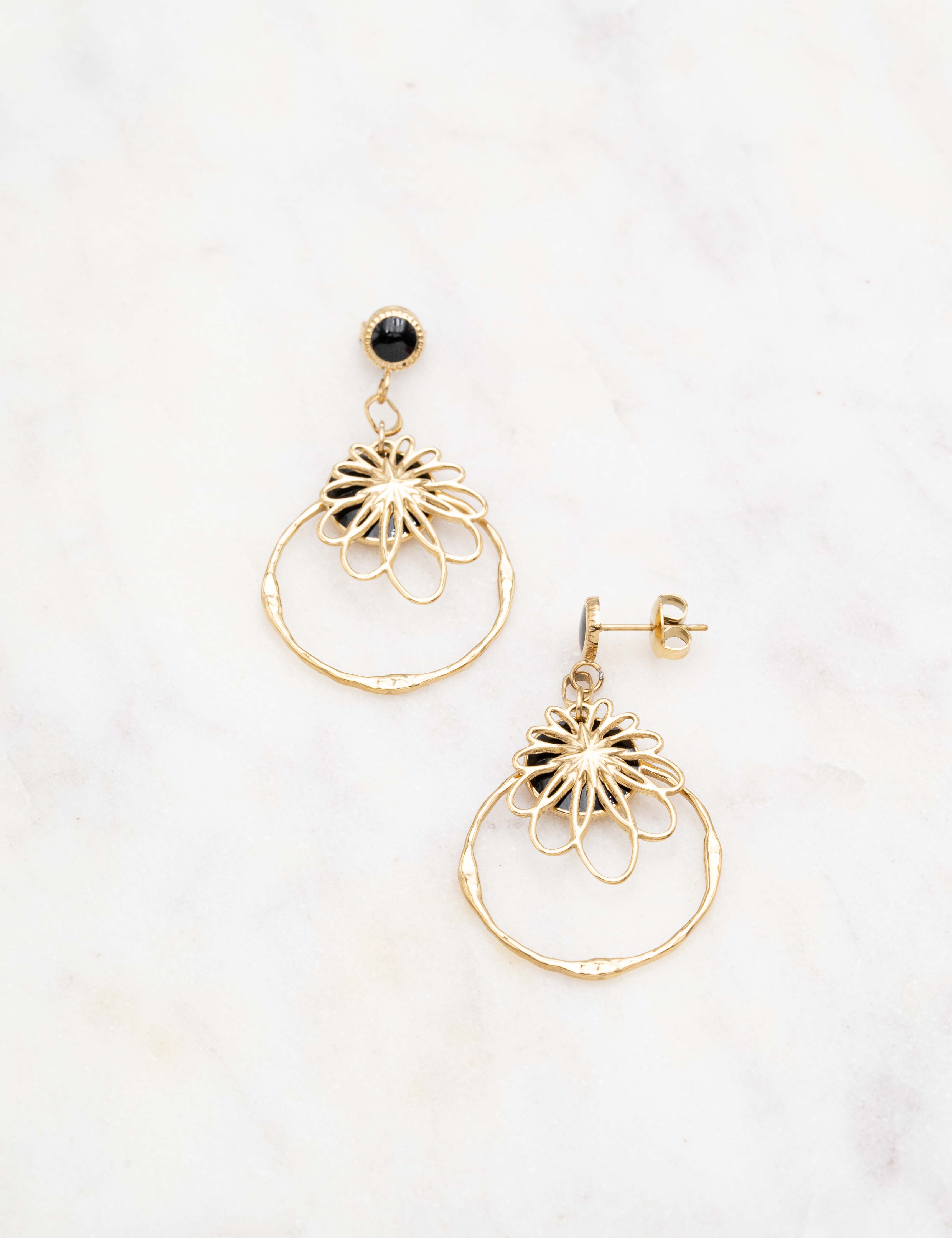 Boucles d'oreilles à puce composées d'une pièce ronde émaillée colorée et d'une pièce graphique effet floral et d'un anneau martelé.
