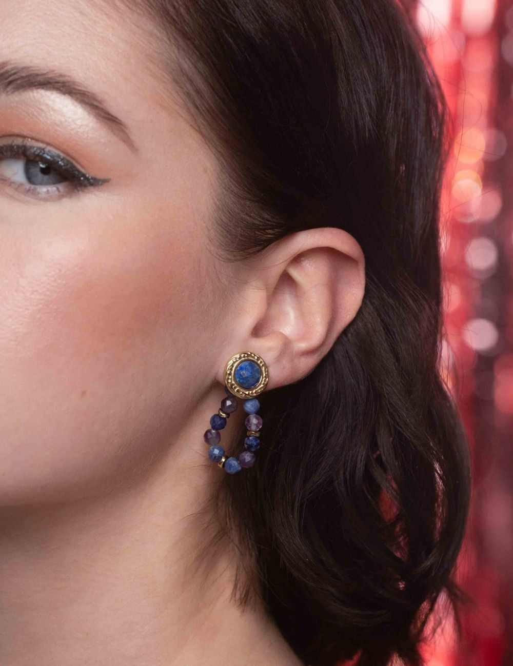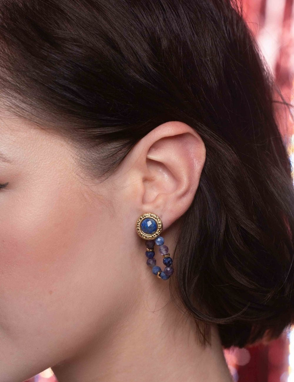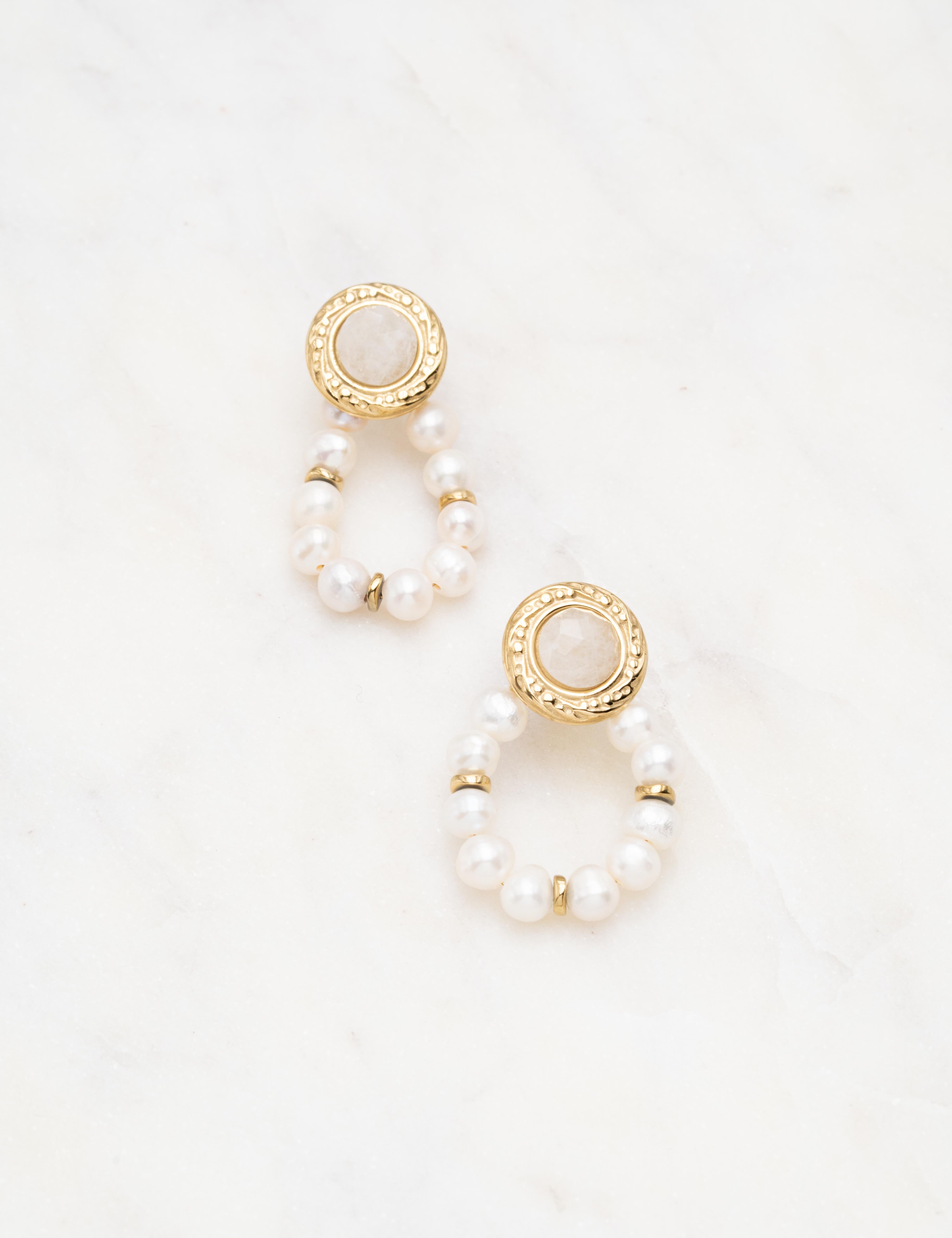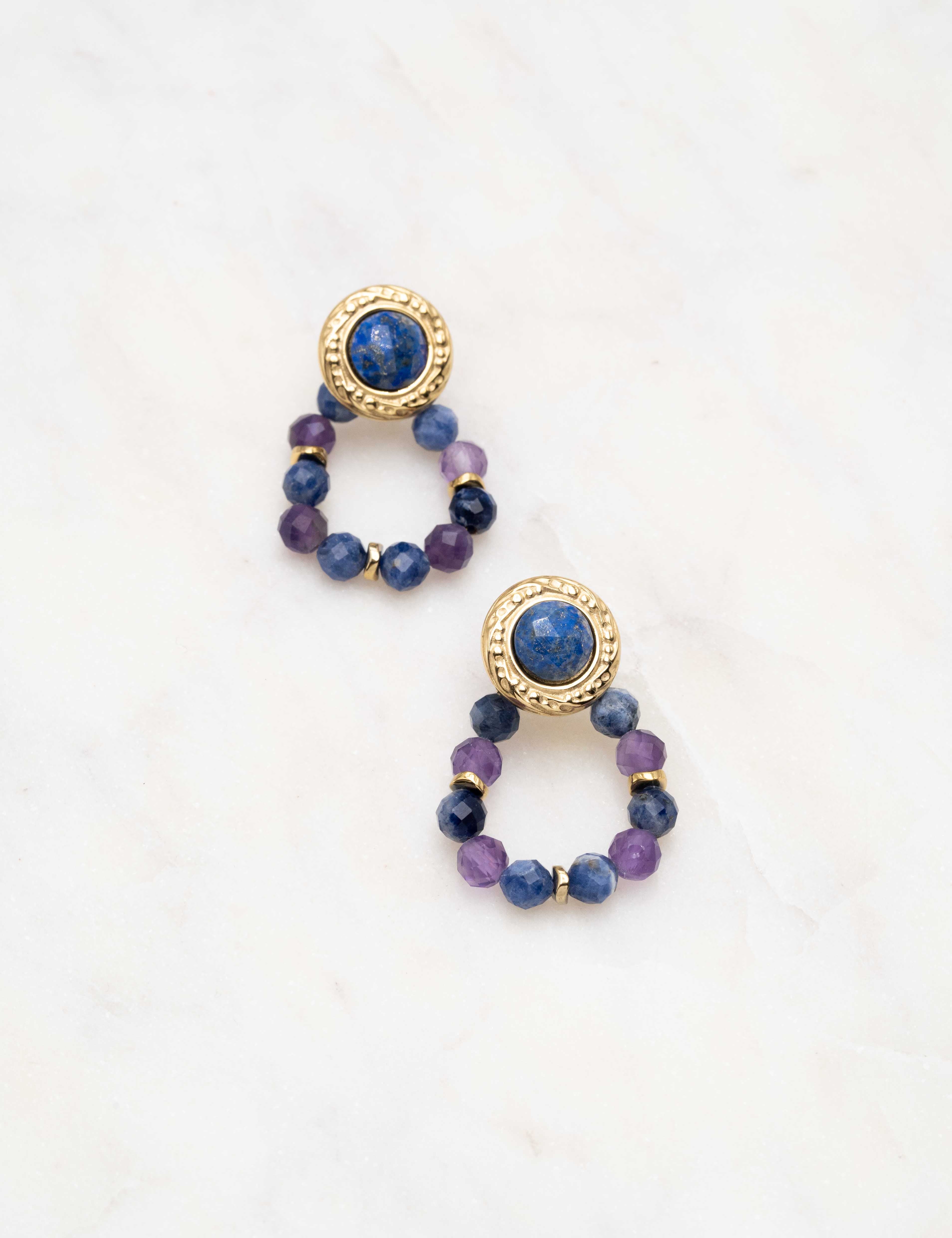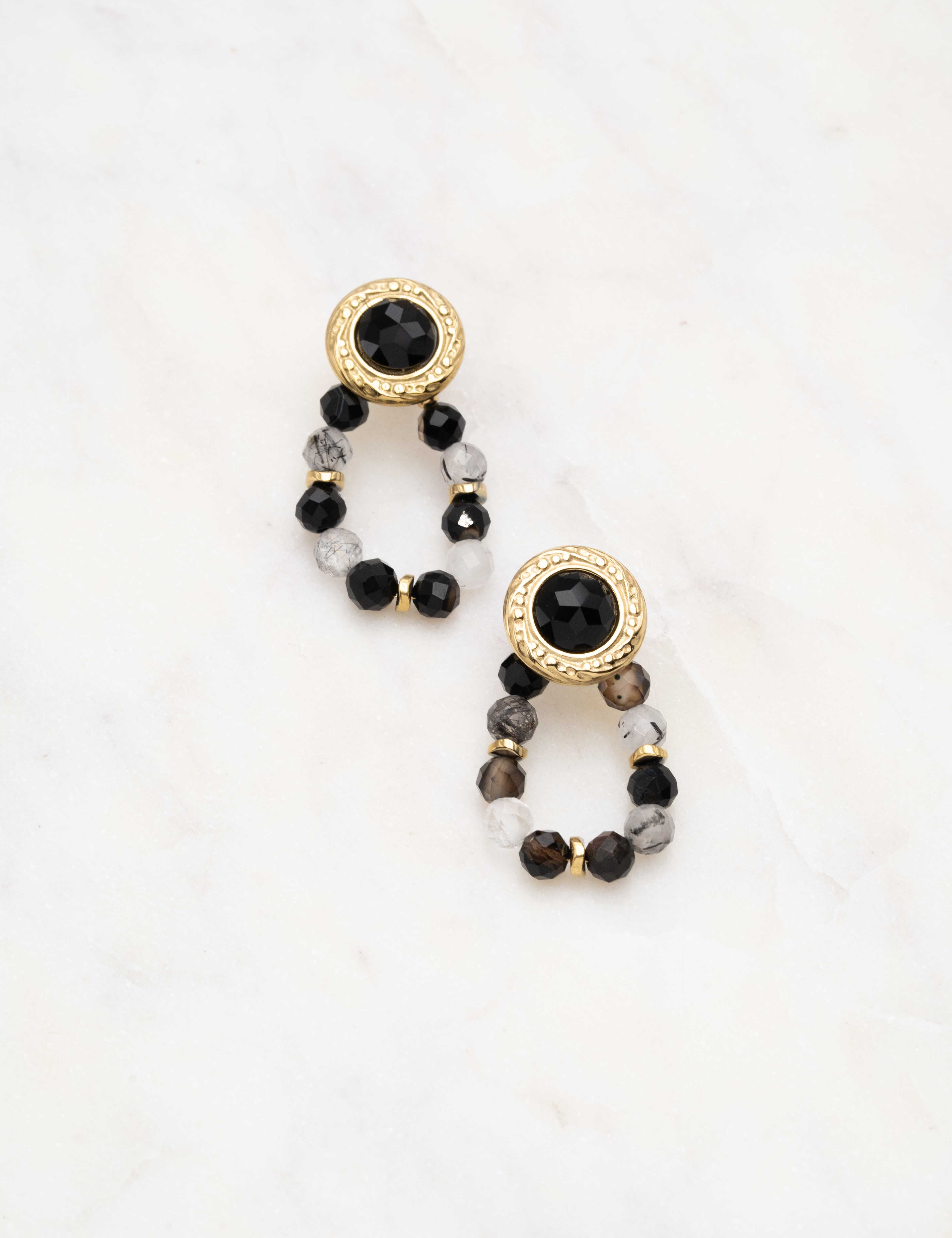 Boucles d'oreilles à puce composées d'une pièce ronde ornée d'une pierre naturelle et embellies d'un enfilage de perles en pierres naturelles.