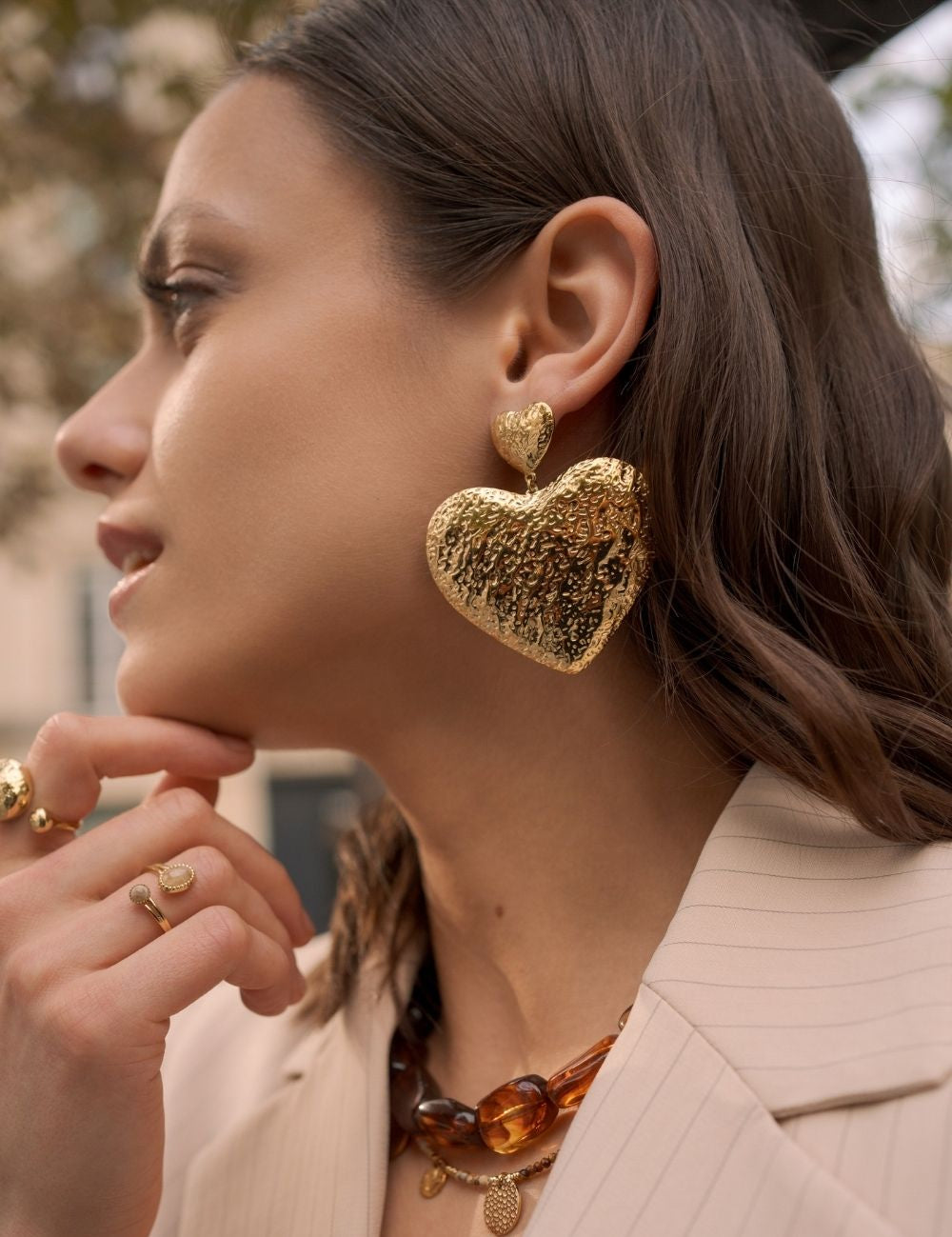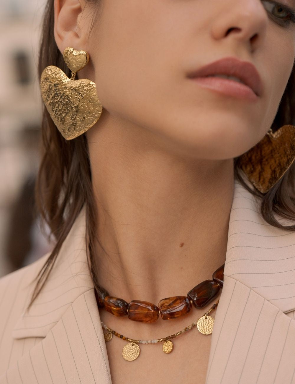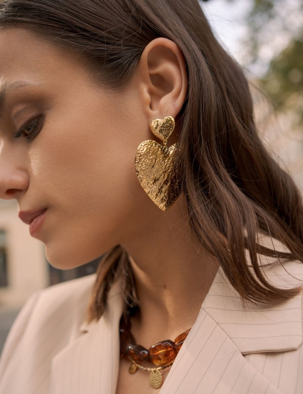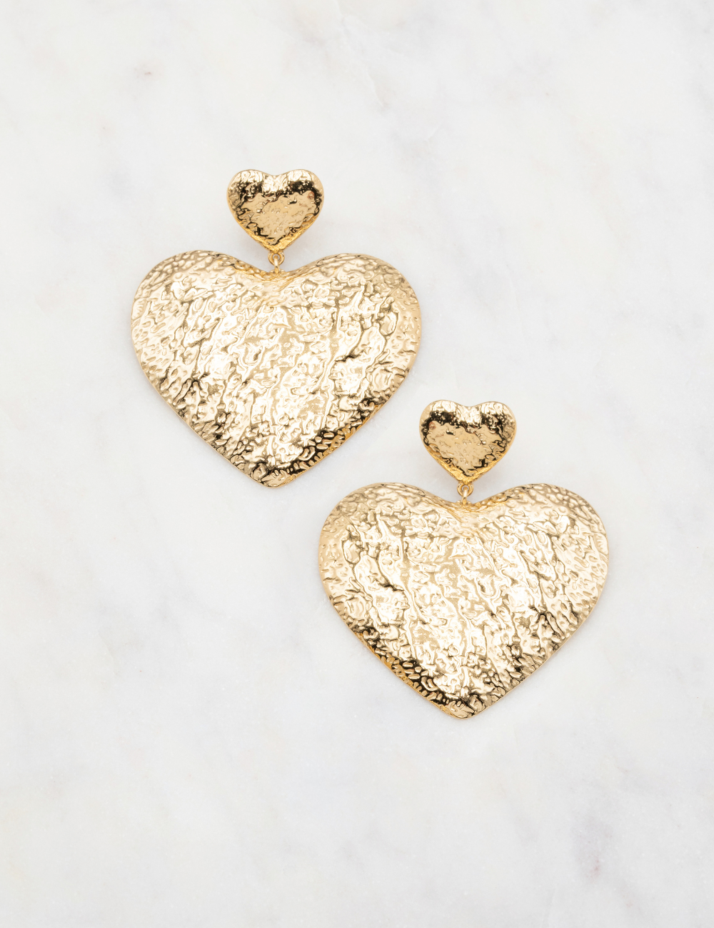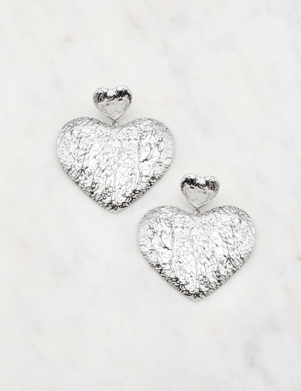 Boucles d'oreilles graphiques pendantes à puce composées de deux pièces martelées (forme coeur).