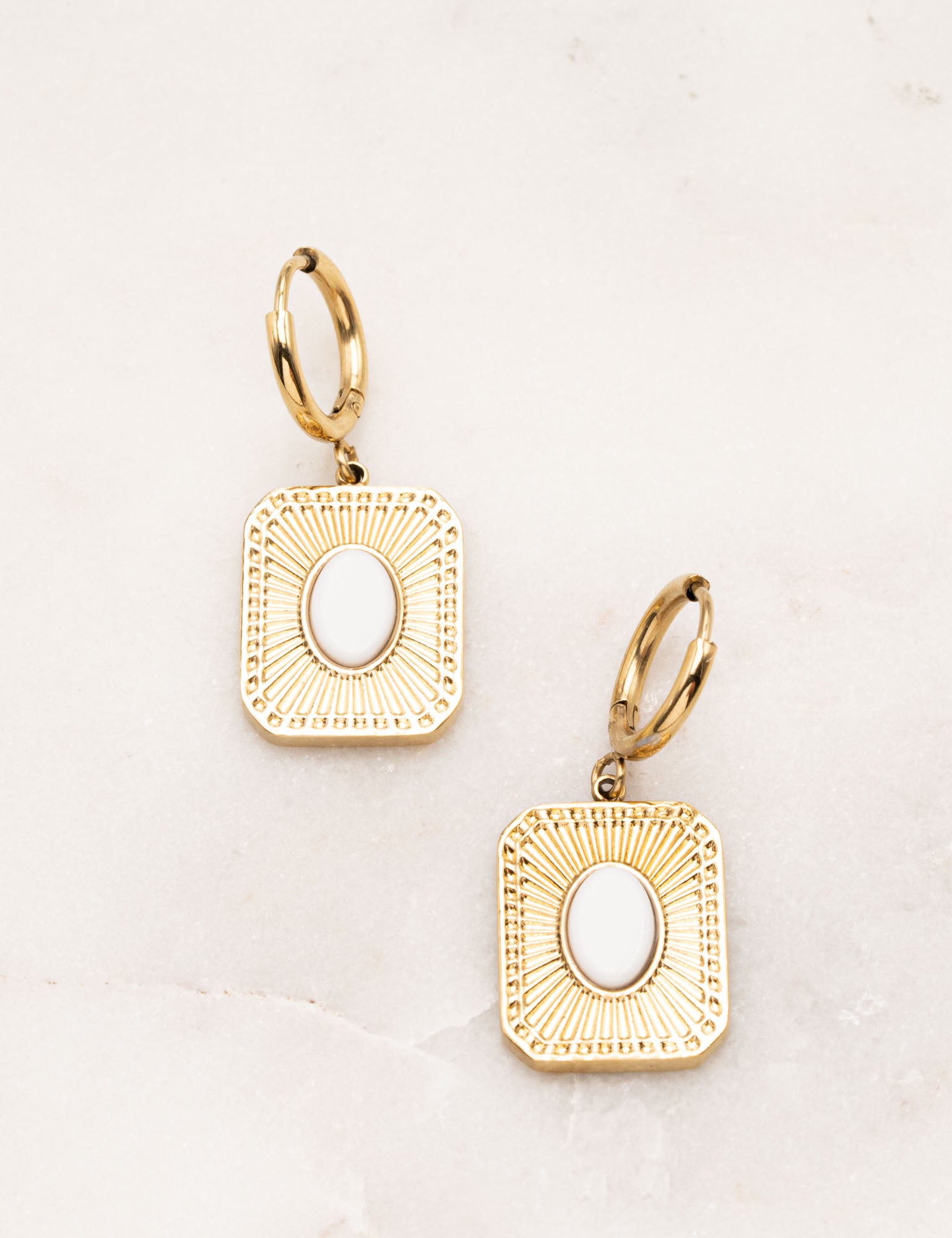 Boucles d'oreilles type créoles composées d'une pièce texturée, ornée d'une pierre naturelle. Fermoir charnière.