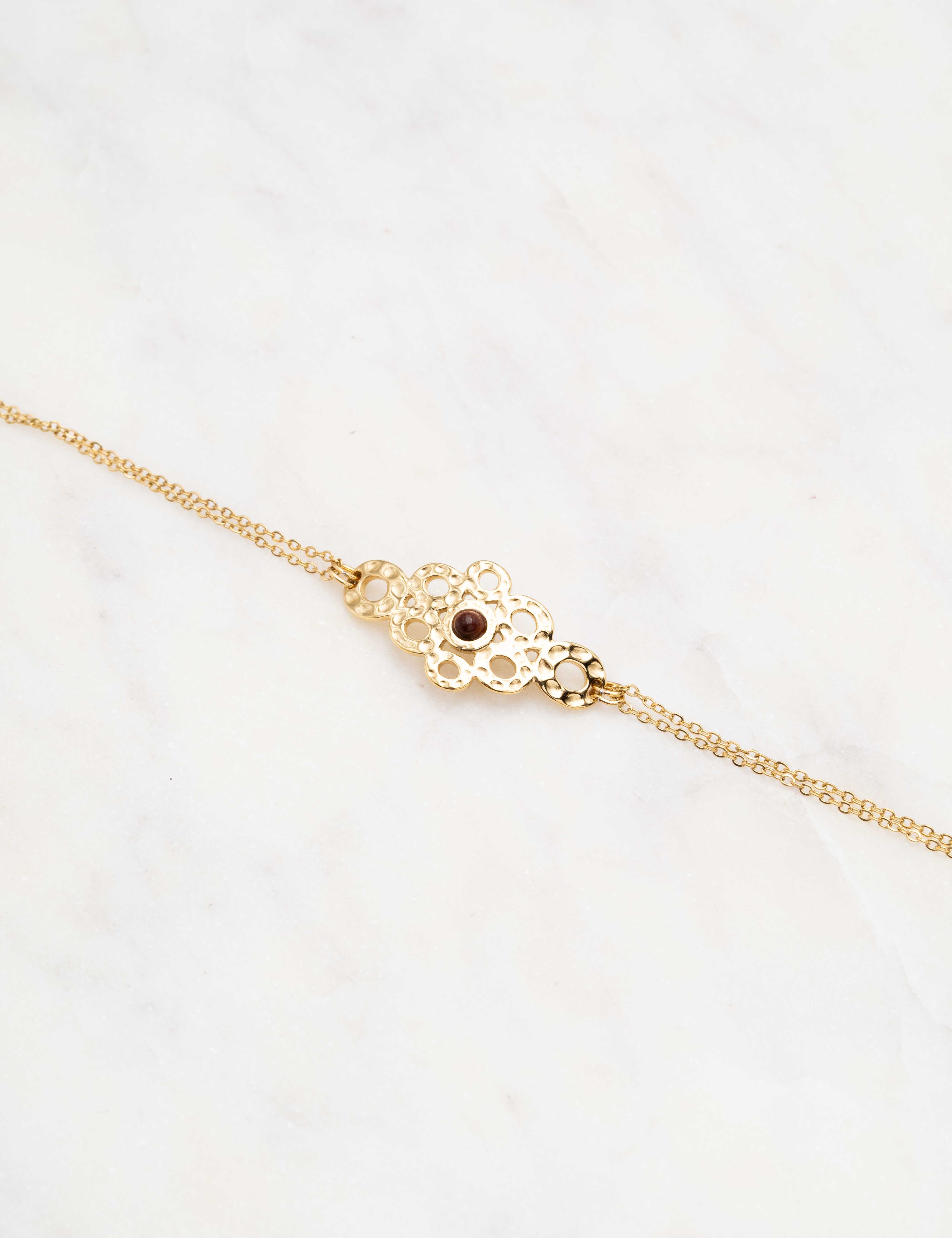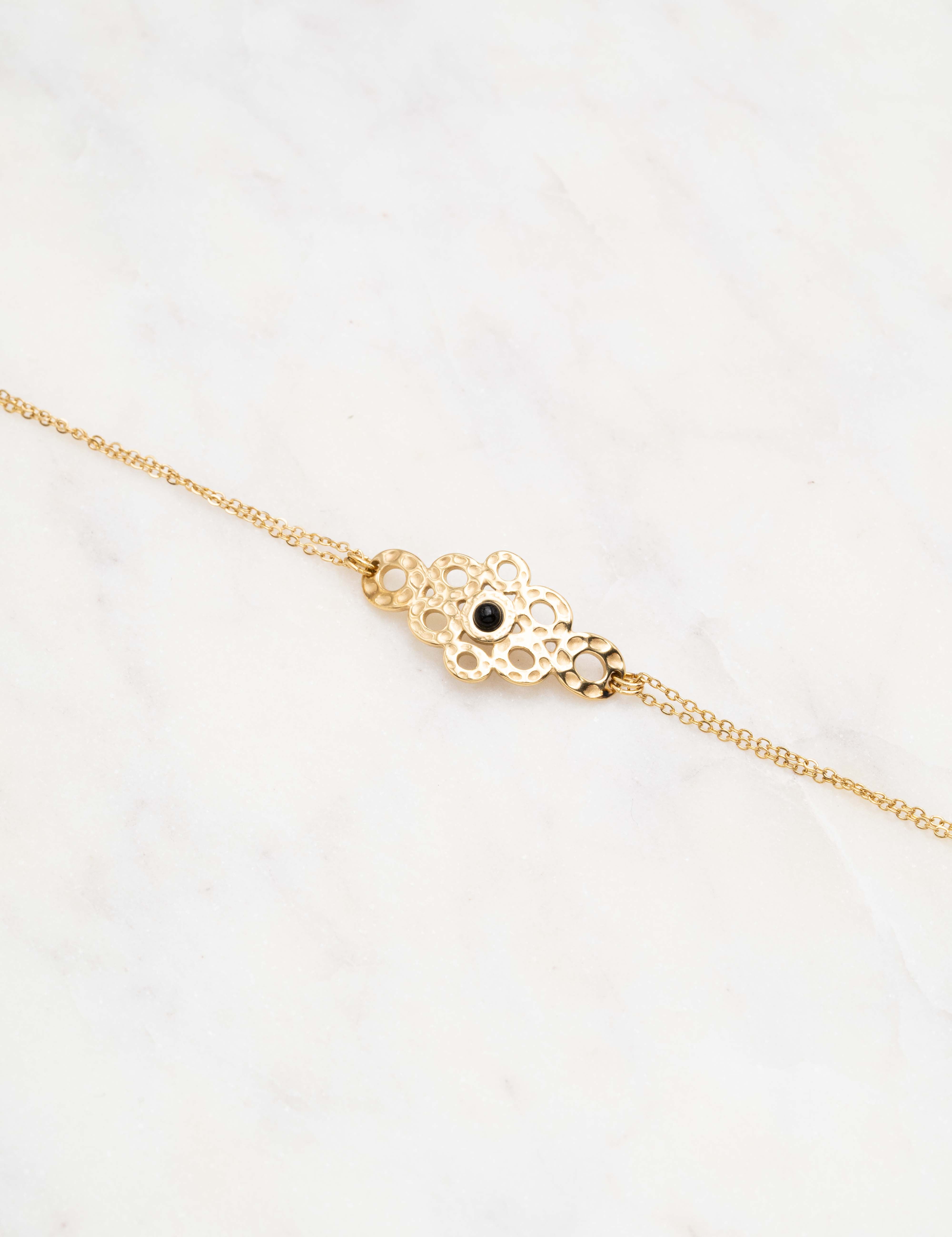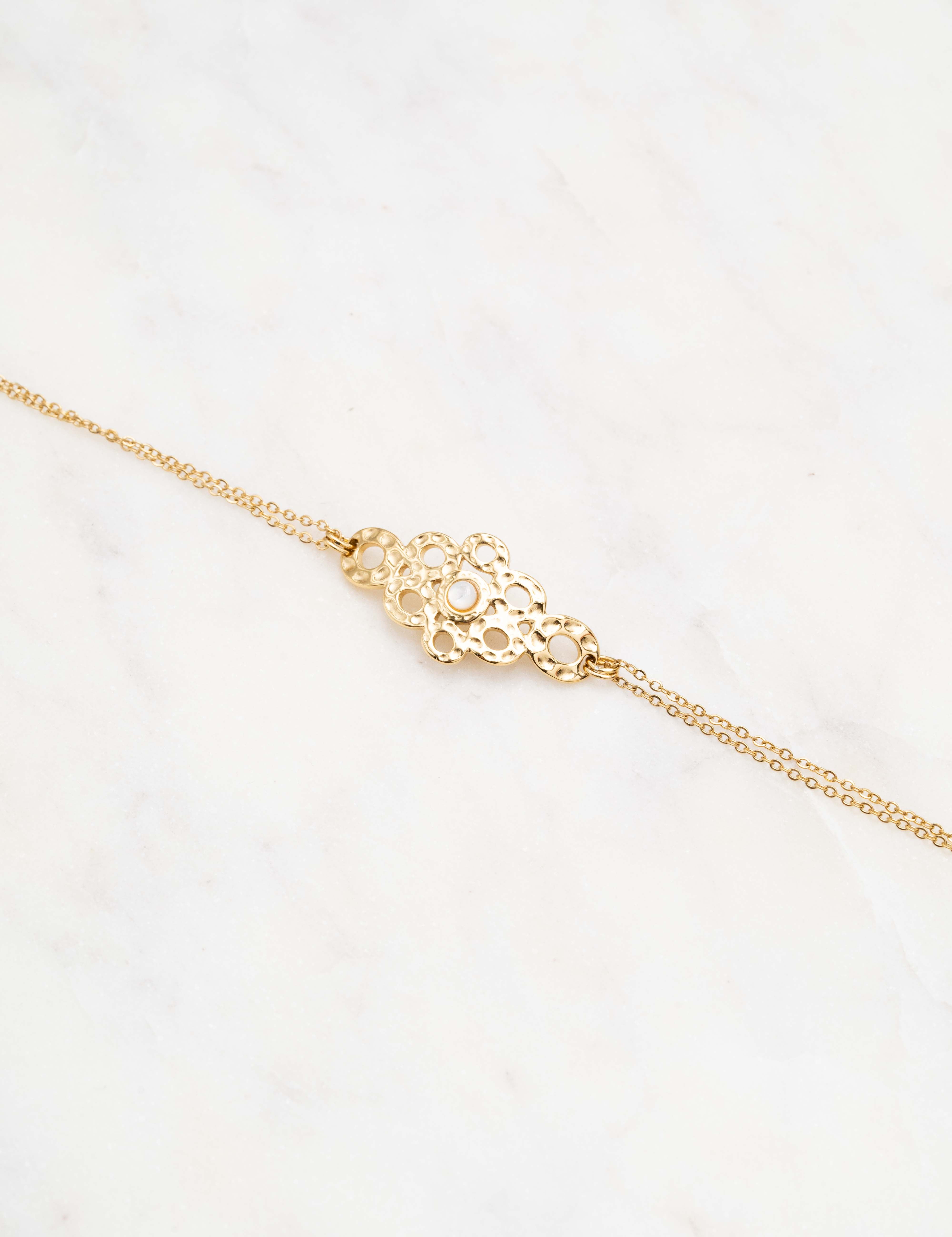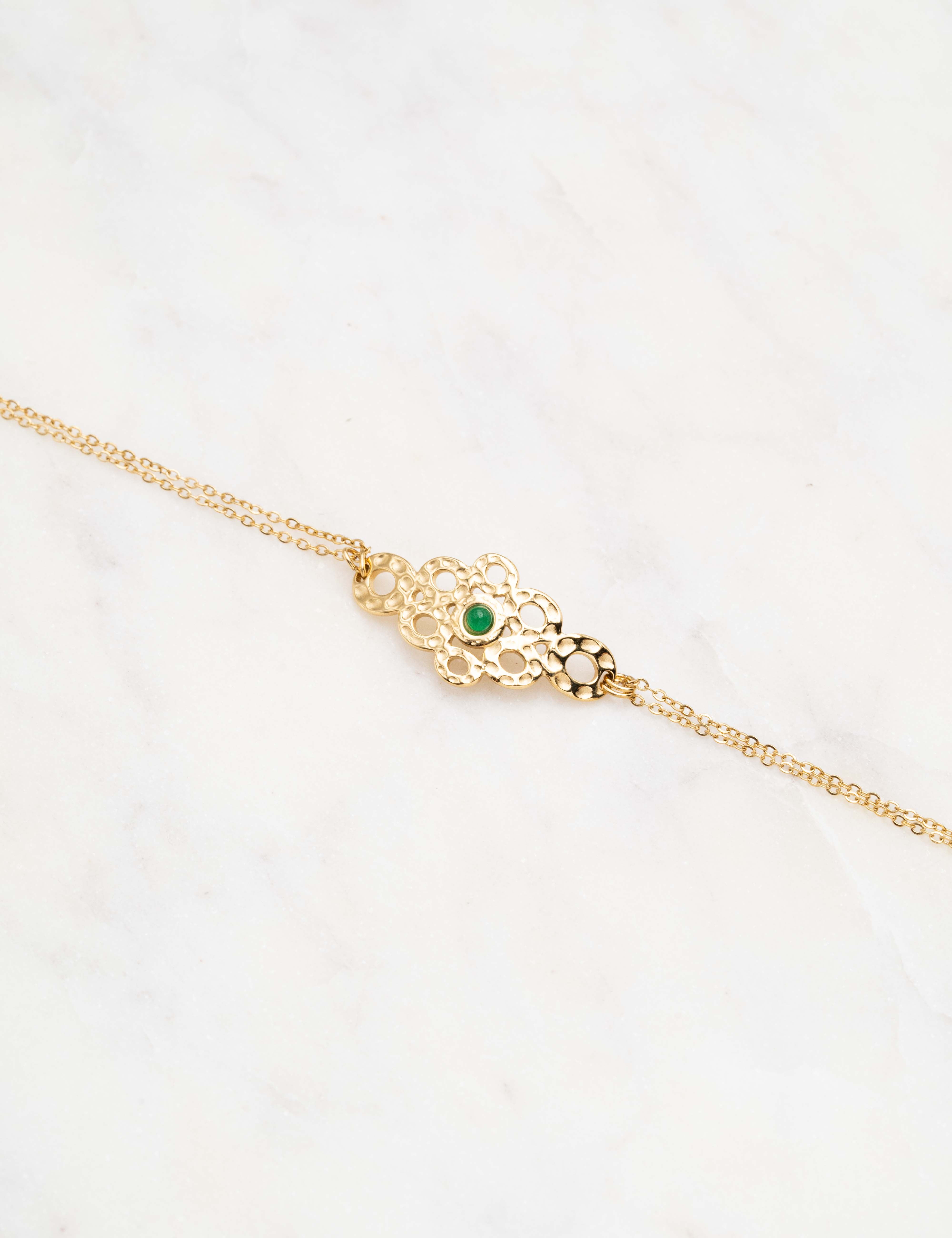 Bracelet réglable sur chaîne composé d'une pièce avec de multi-ronds ajourés et ornée d'une pierre naturelle.
