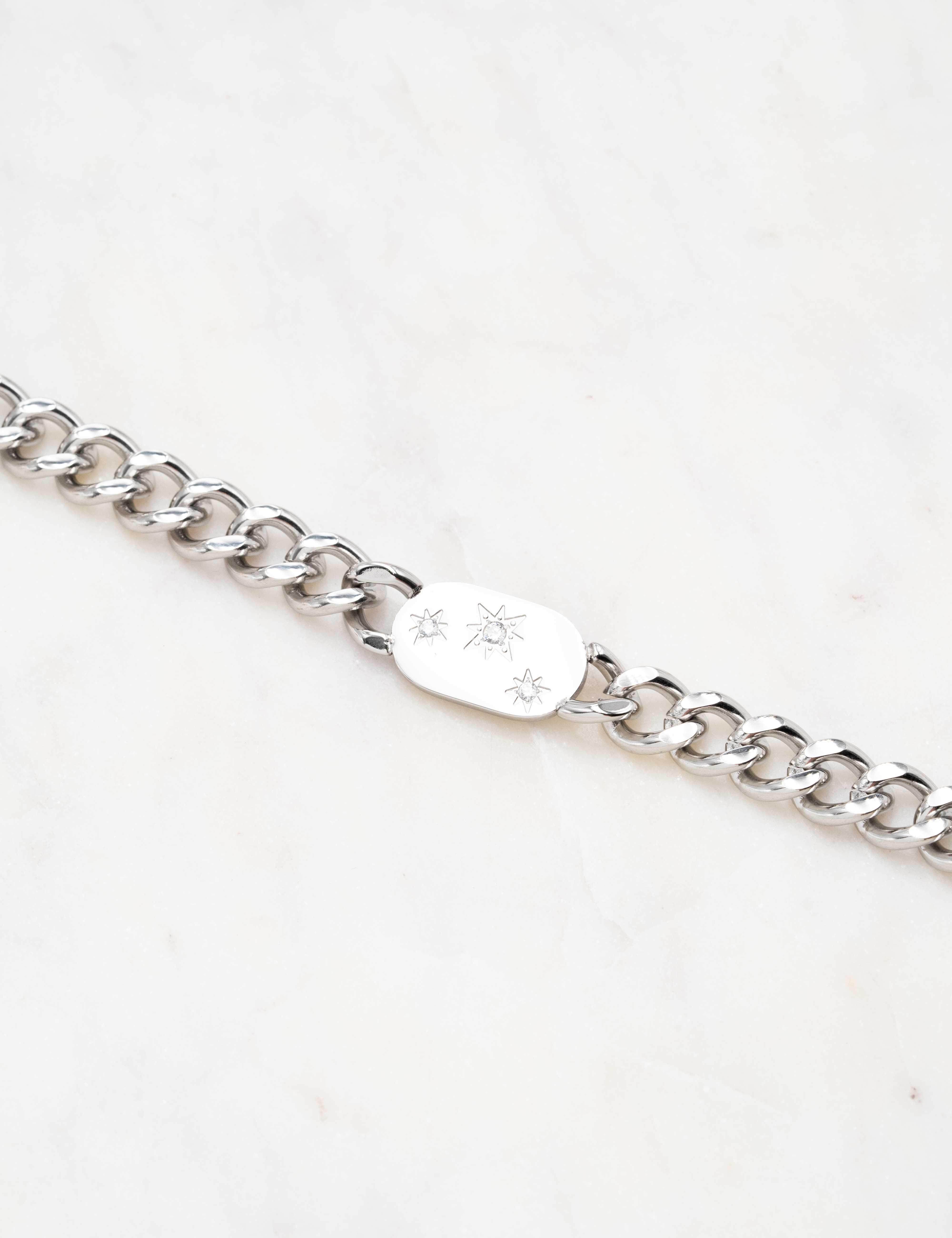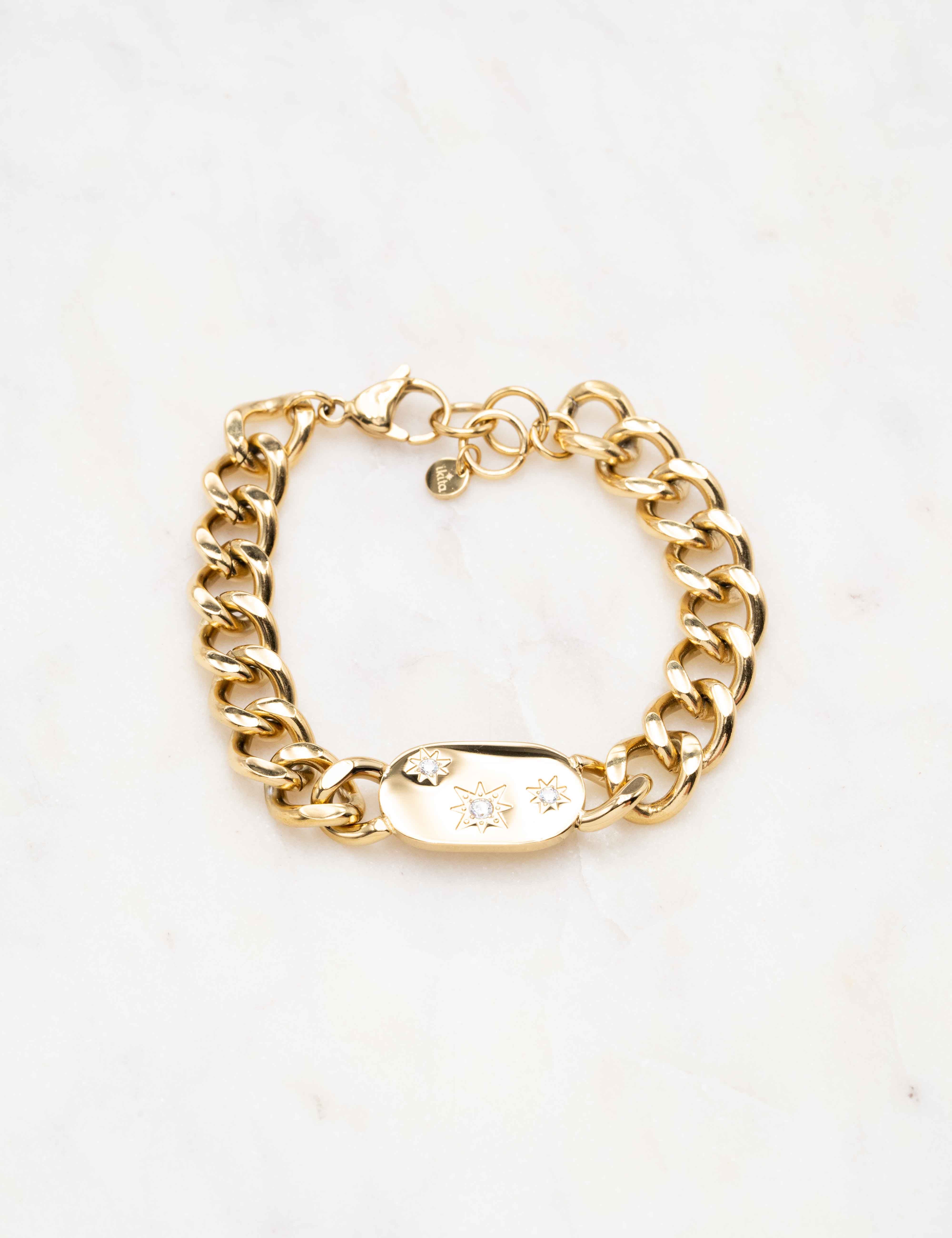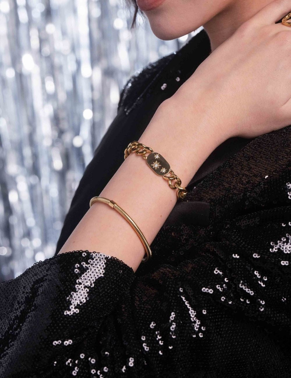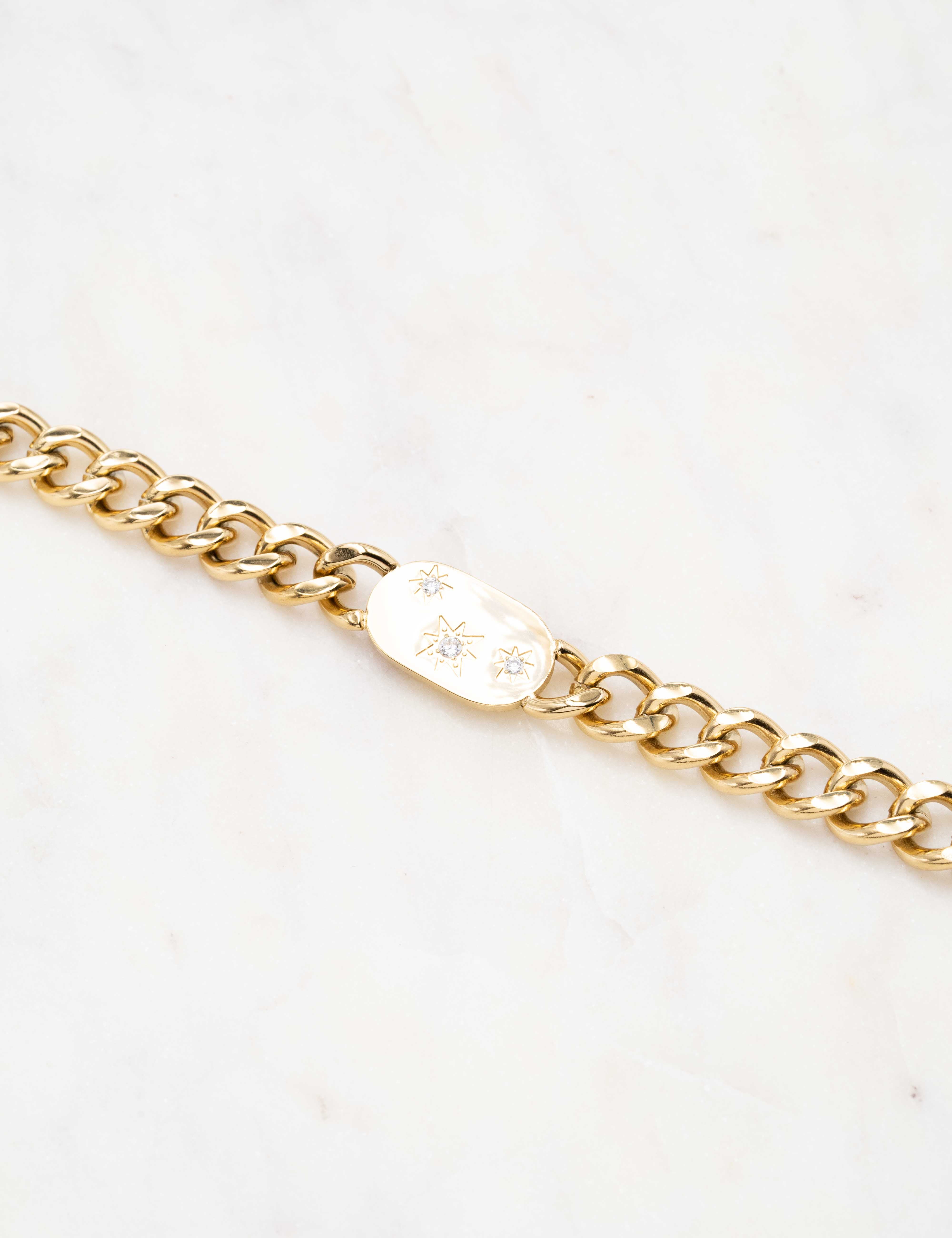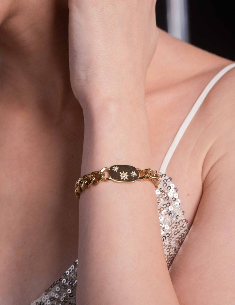 Bracelet sur chaine réglable à maillons avec une pièce ornée de motifs étoilés strassés.