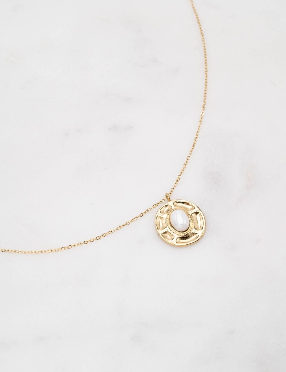 Collier réglable sur chaine composé d'un pendant martelé et serti d'une nacre. Fermoir mousqueton et chainette de réglage.