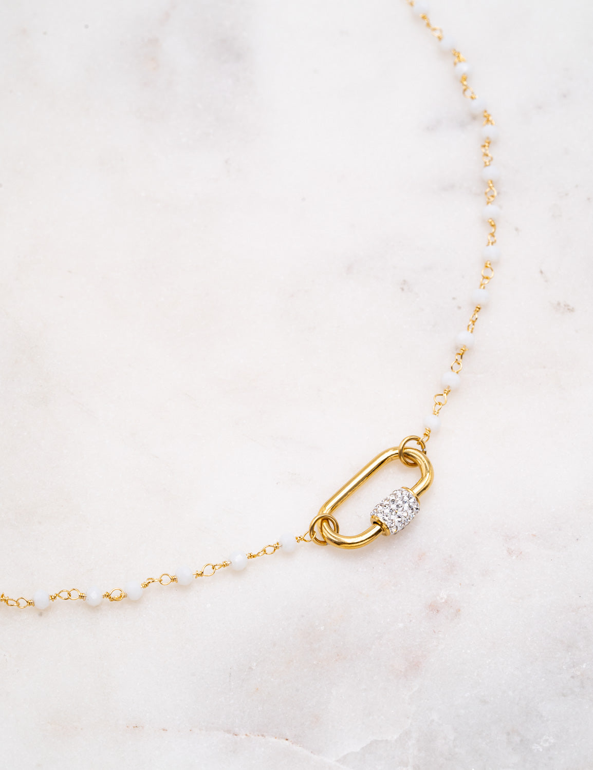 Collier réglable sur chaine composé de petites perles en pate de verre et d'une pièce centrale effet lock serti de strass (oxydes de zirconium). Fermoir mousqueton et chaînette de réglage.