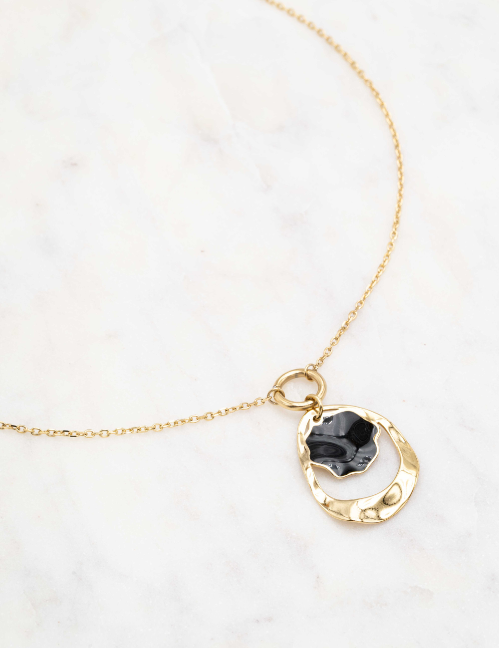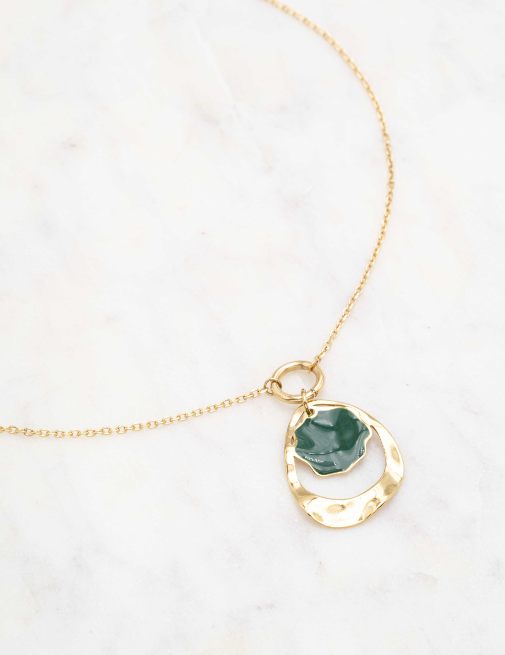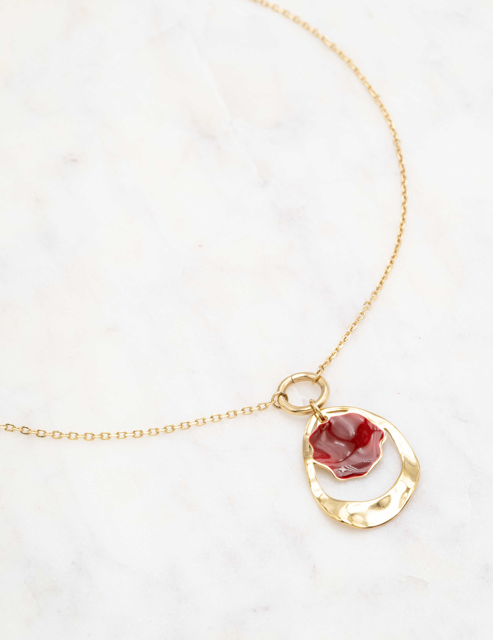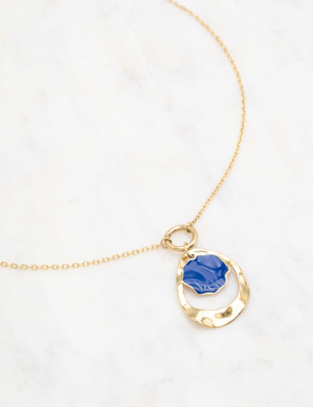 Collier réglable sur chaîne type sautoir composé d'un pendentif graphique ajouré martelé et émaillé coloré.