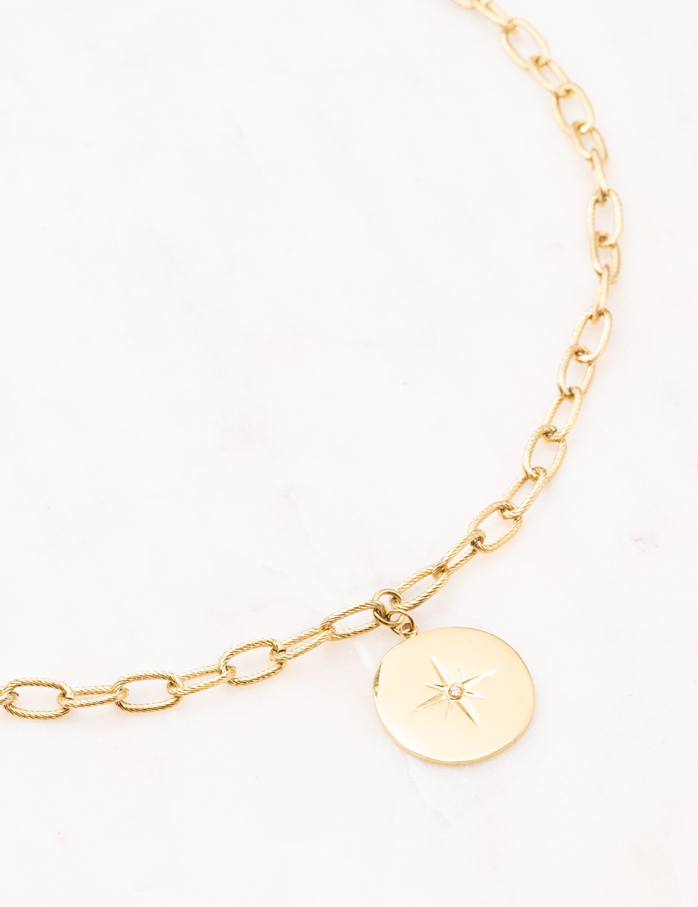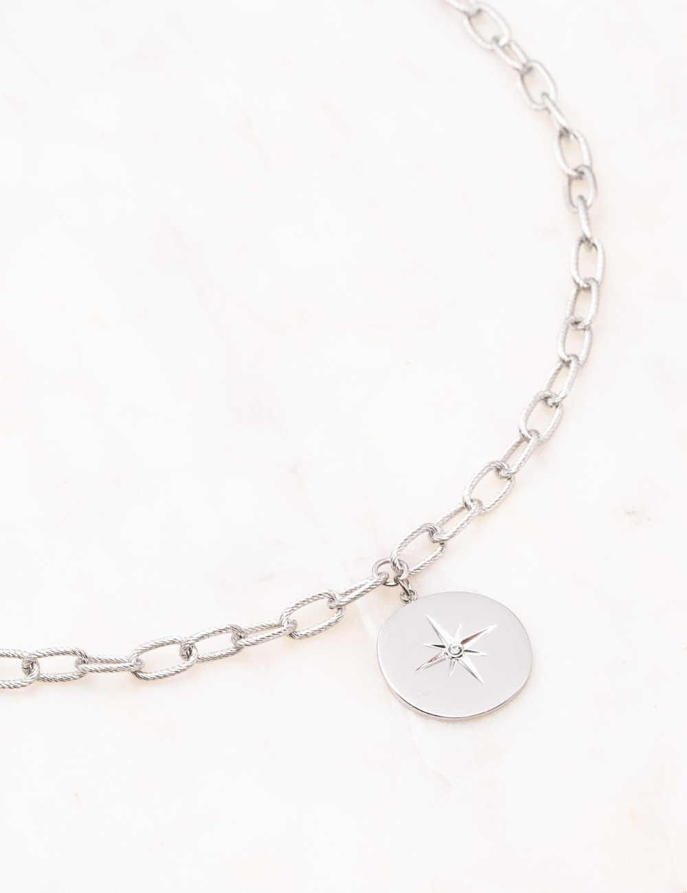 Collier réglable sur chaine composé de maillons texturés et d'une pampille étoilée ornée d'un petit strass zirconium.