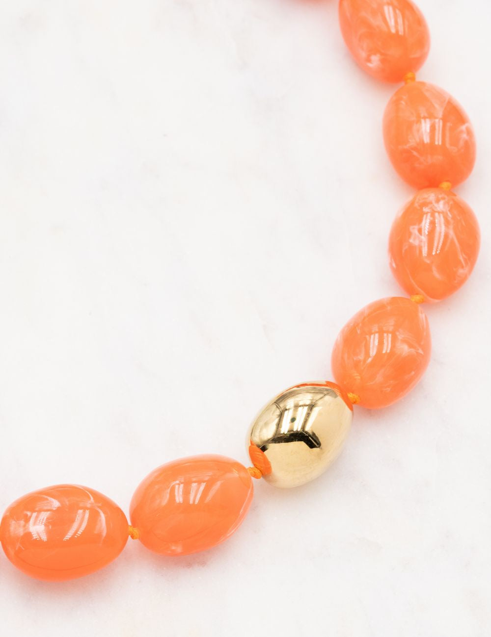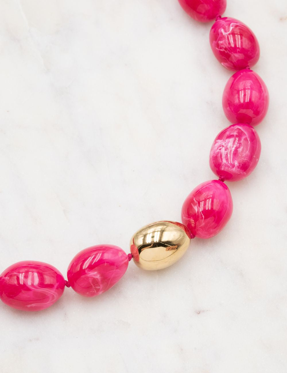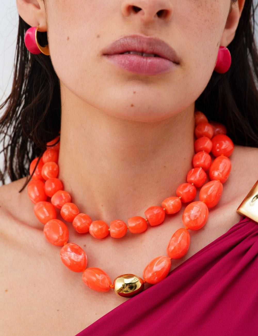 Collier réglable composé d'un enfilage de perles en résine colorée.