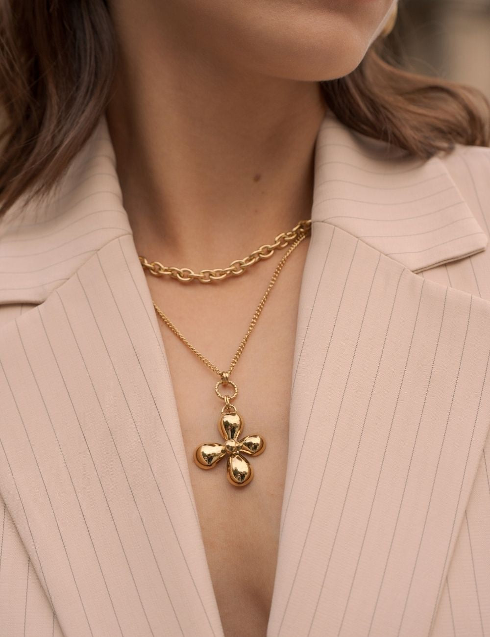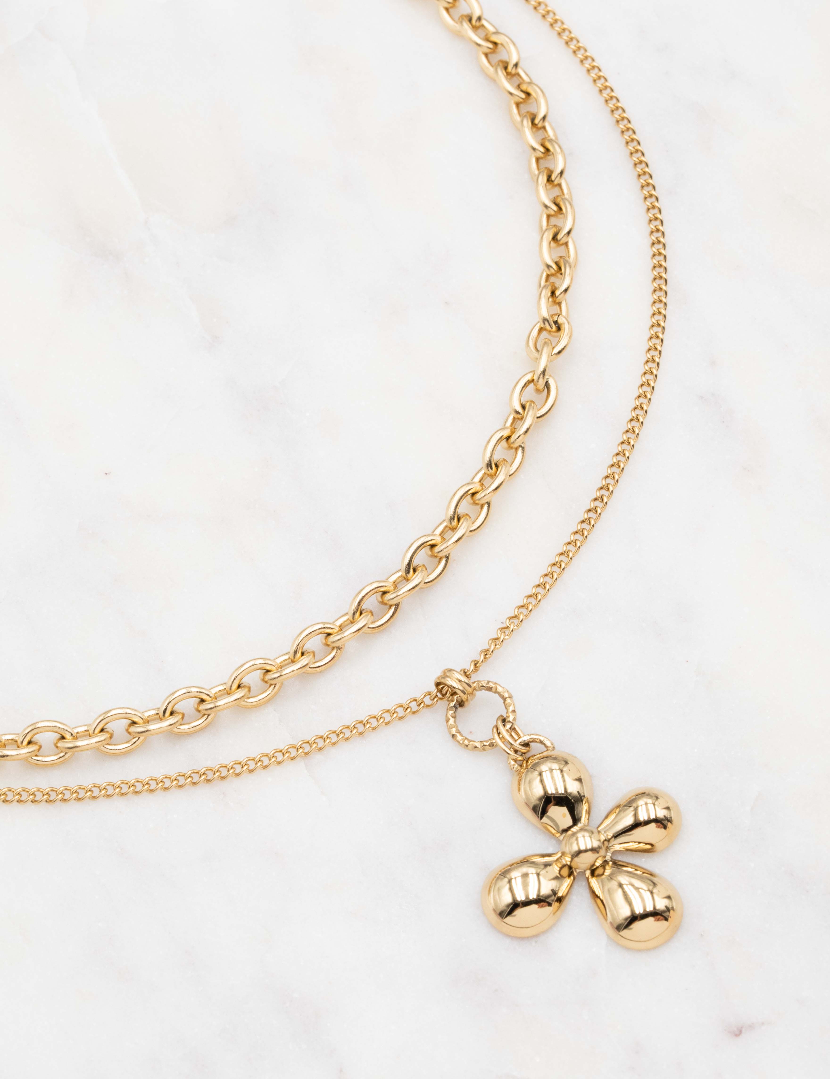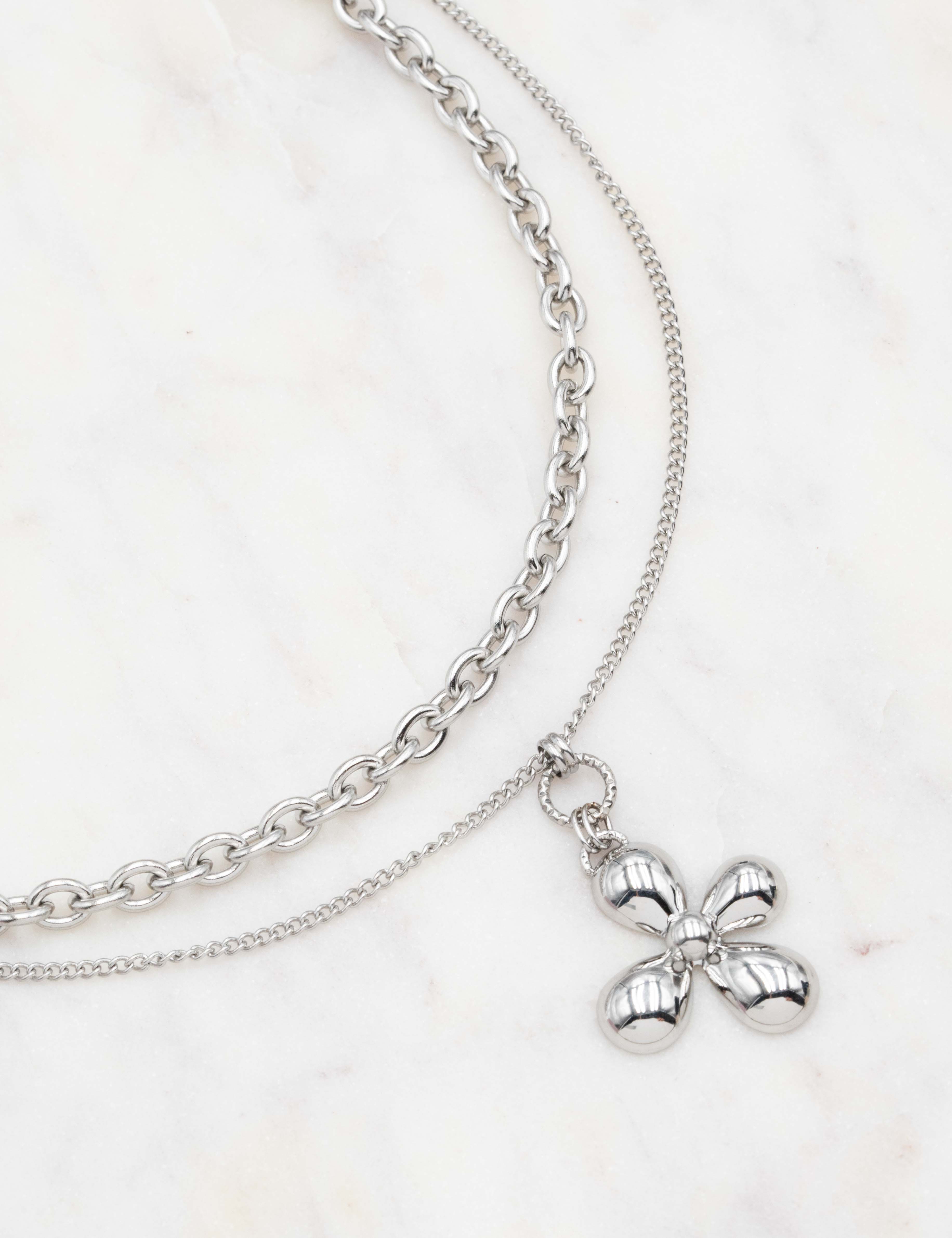 Collier réglable sur chaîne double rangs composé d'un anneau texturé orné d'un pendant esprit floral.