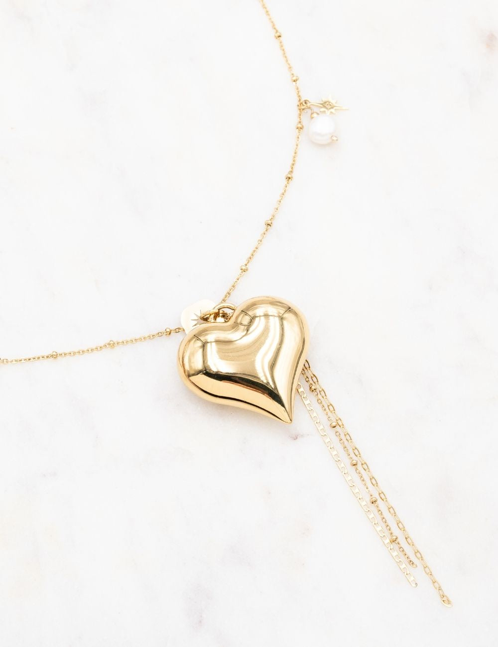 Collier type sautoir composé d'un pendentif cœur lisse, bombé, avec un effet miroir orné d'une pampille ajourée étoilée et de trois chaînes tombantes.