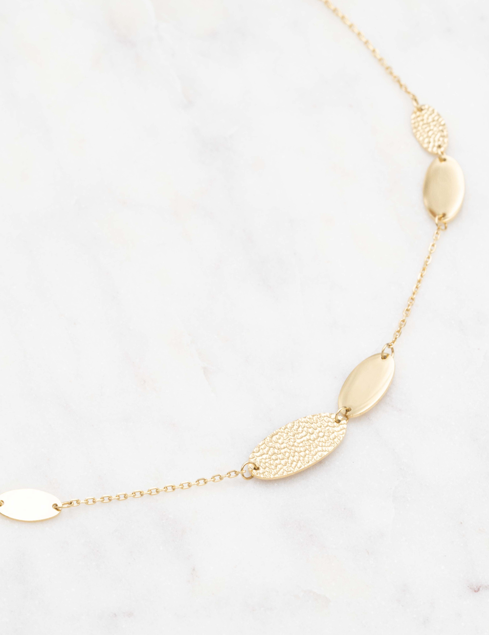 Collier réglable sur chaîne composé de 5 pièces ovales : 3 lisses et 2 martelées.