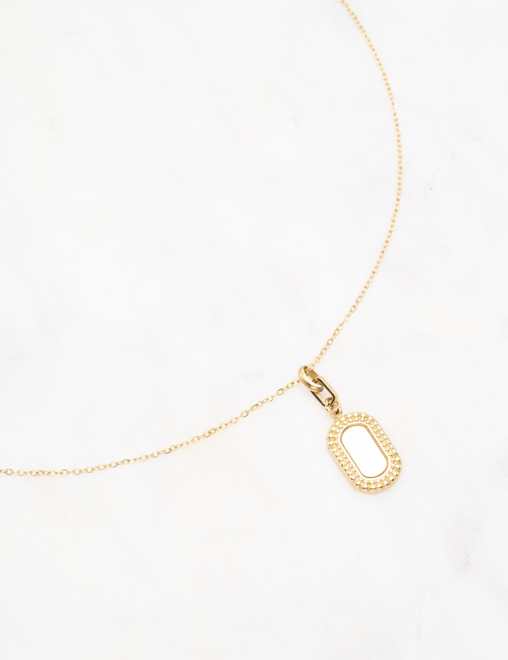 Collier réglable sur chaîne composé d'un anneau rectangulaire et d'un pendentif rectangulaire sertie d'une pierre naturelle.