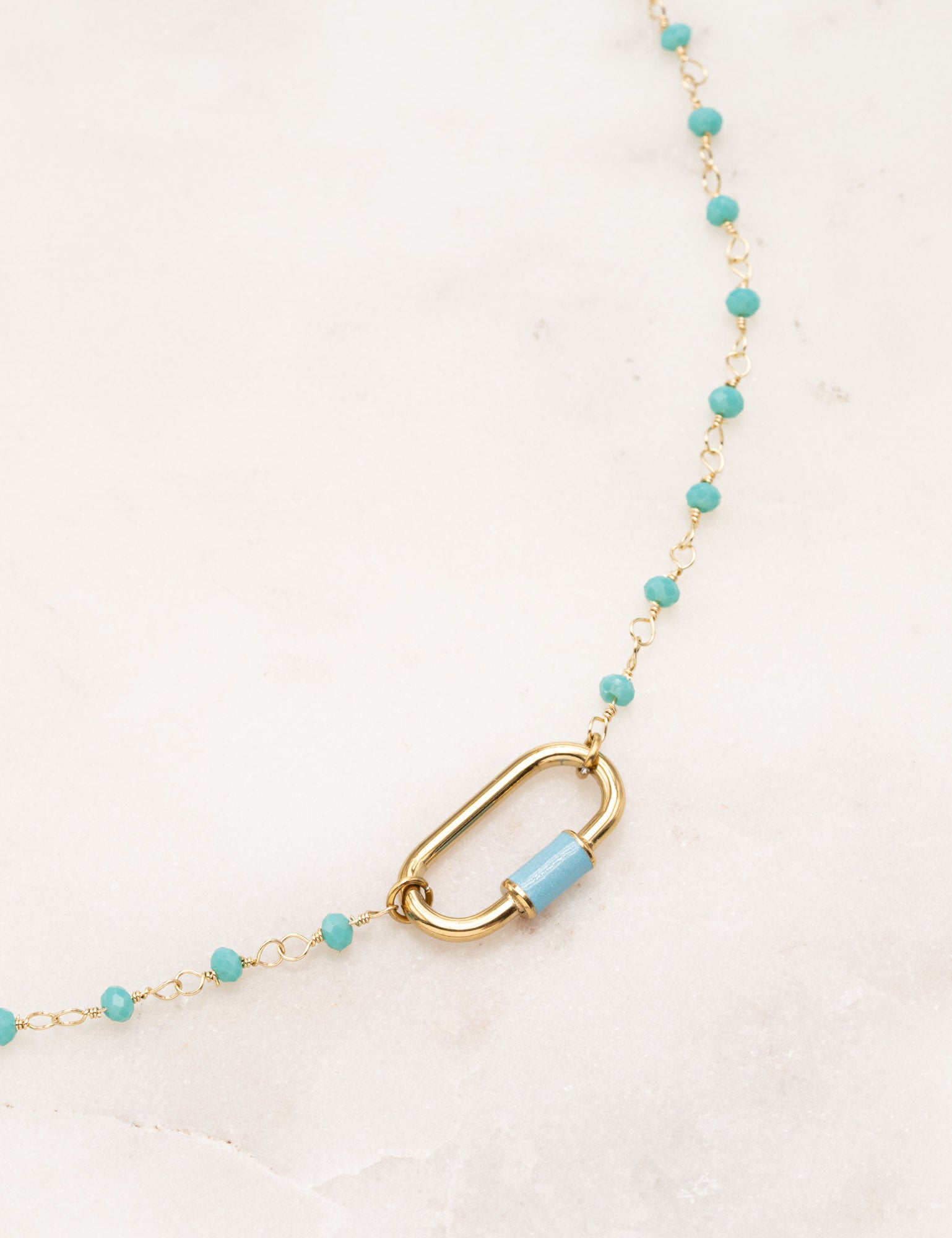 Collier doré avec perles en pâtes de verre et un pendentif en anneau de forme ovale embelli d'une pièce émaillée. Fermoir mousqueton et chaînette de réglable.
