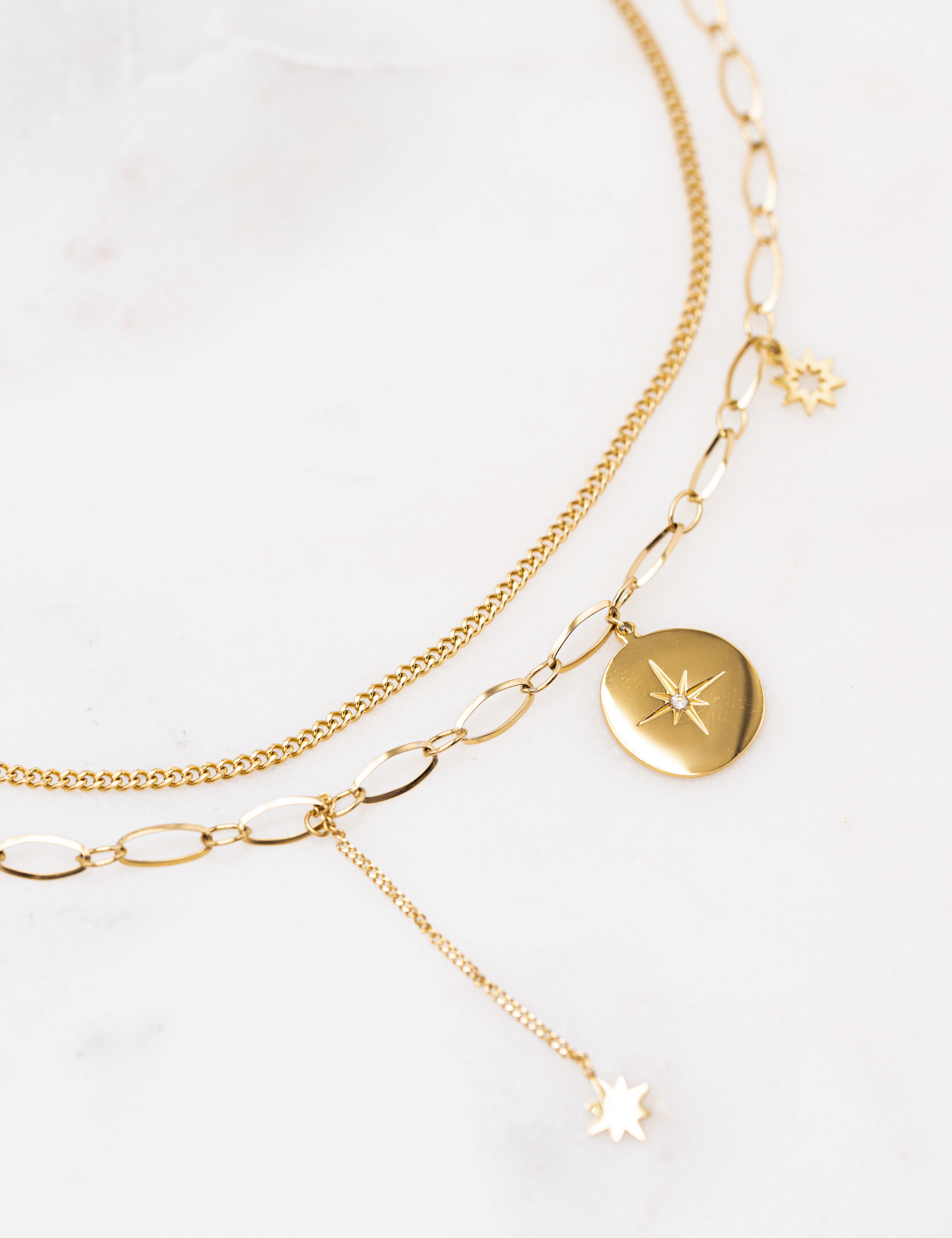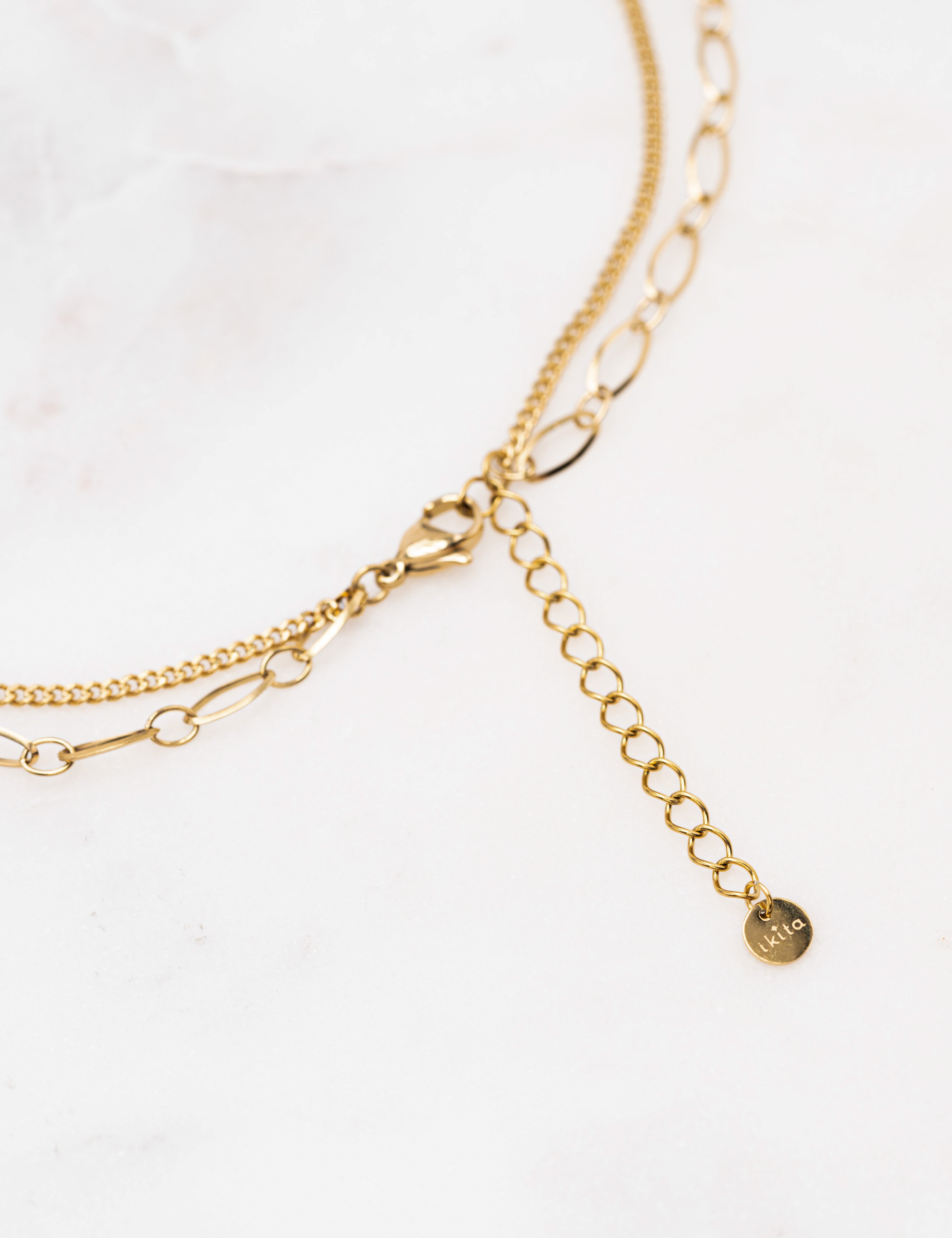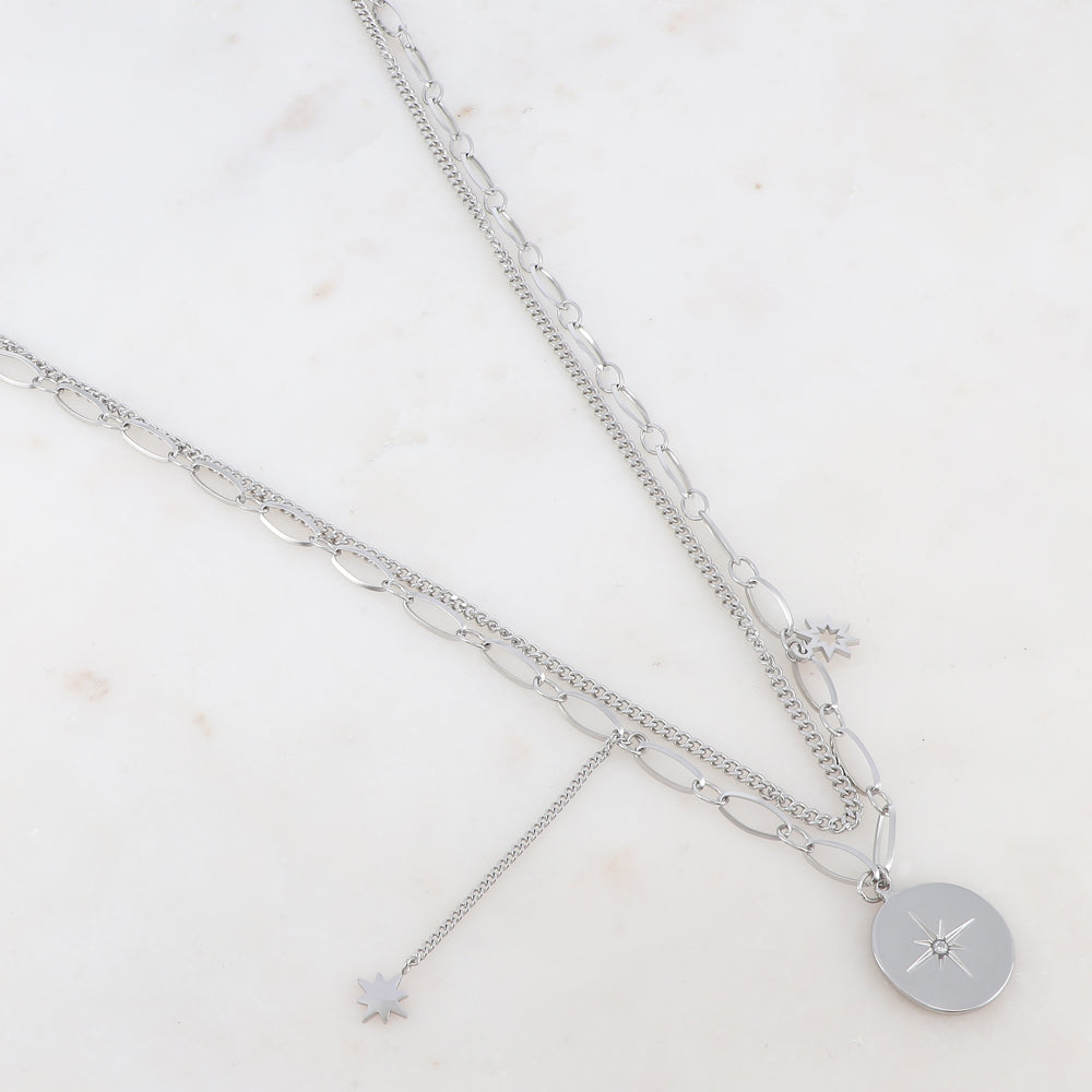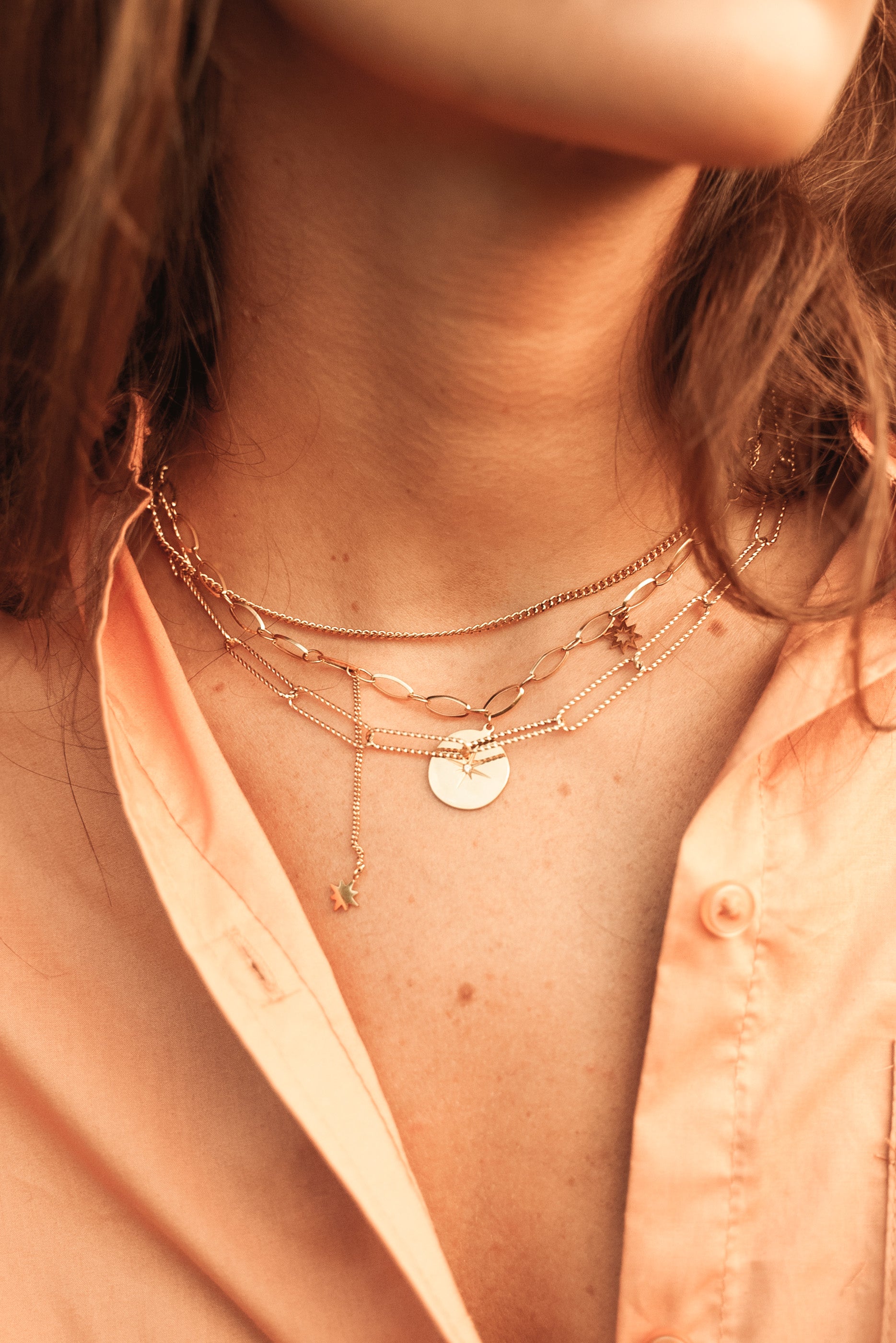 Collier sur chaine réglable 2 rangs avec un jeu de mailles . Fermoir mousqueton et chainette de réglage.