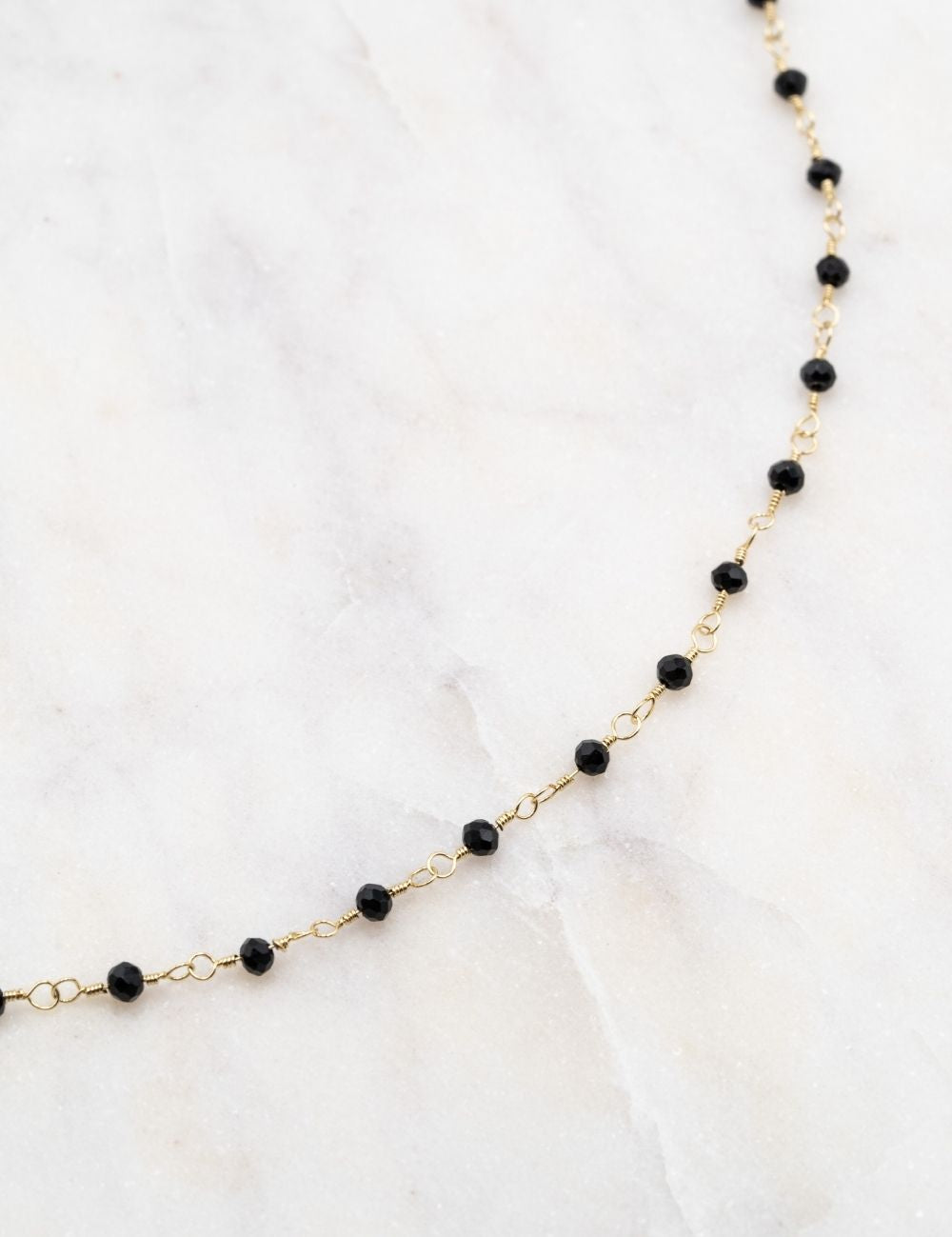 Collier sur chaîne avec fermoir mousqueton et chaînette réglable. Composé de multiples perles.