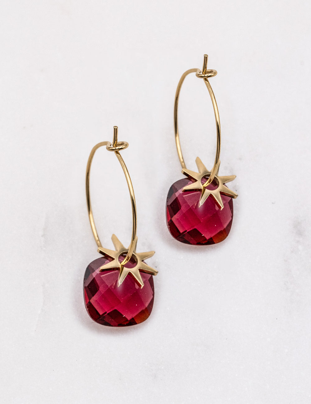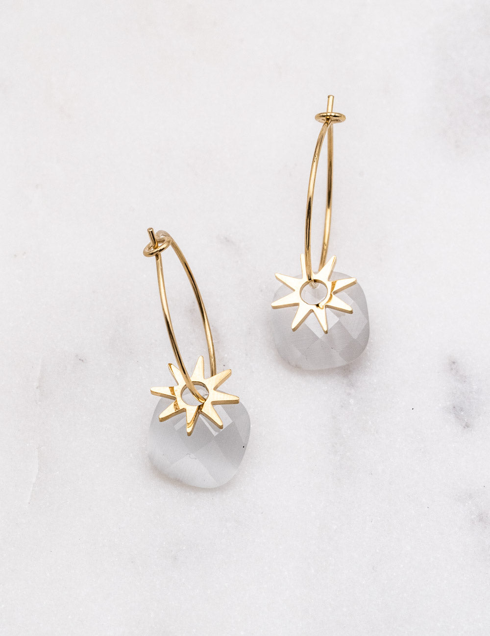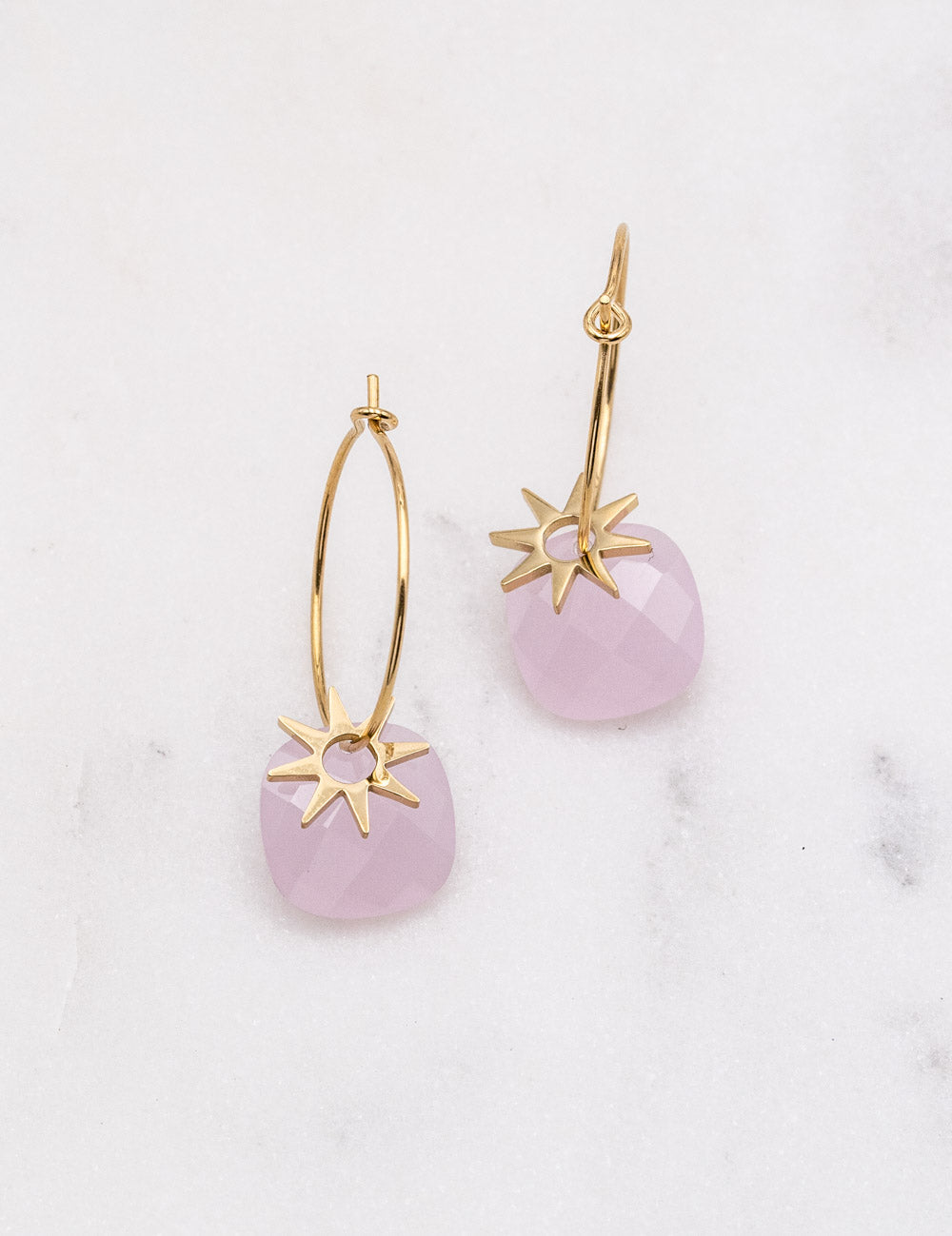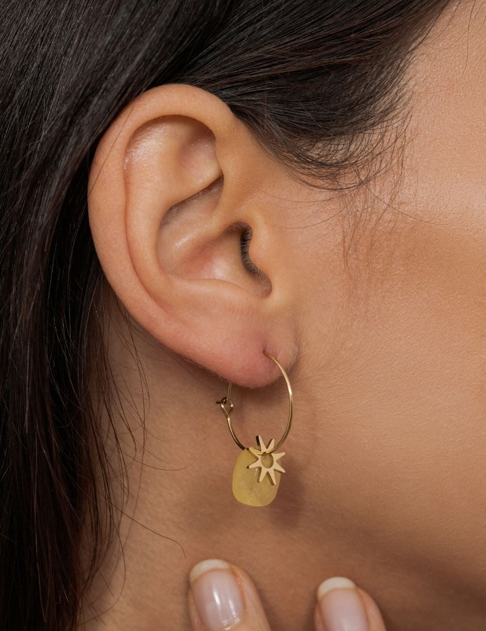 Boucles d'oreilles type créoles. Composées d'une délicate pierre naturelle et son petit soleil doré.