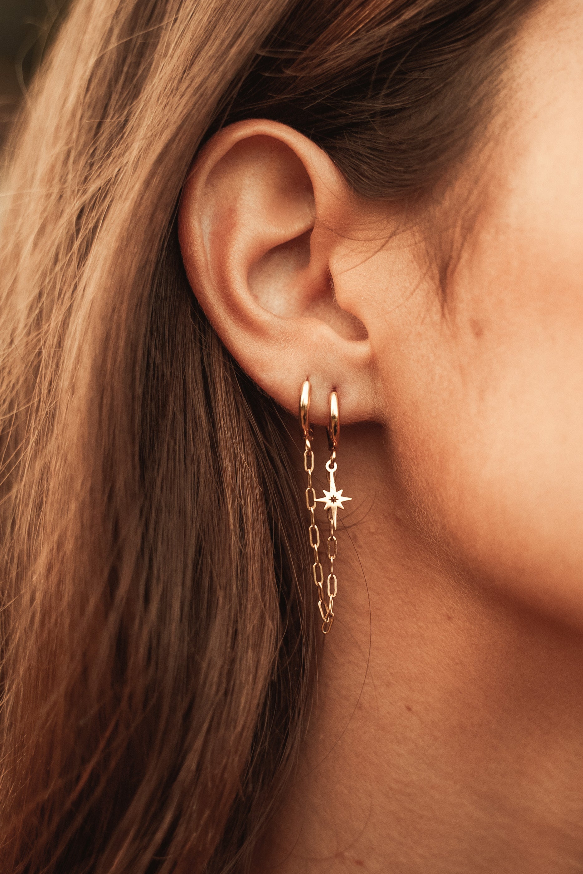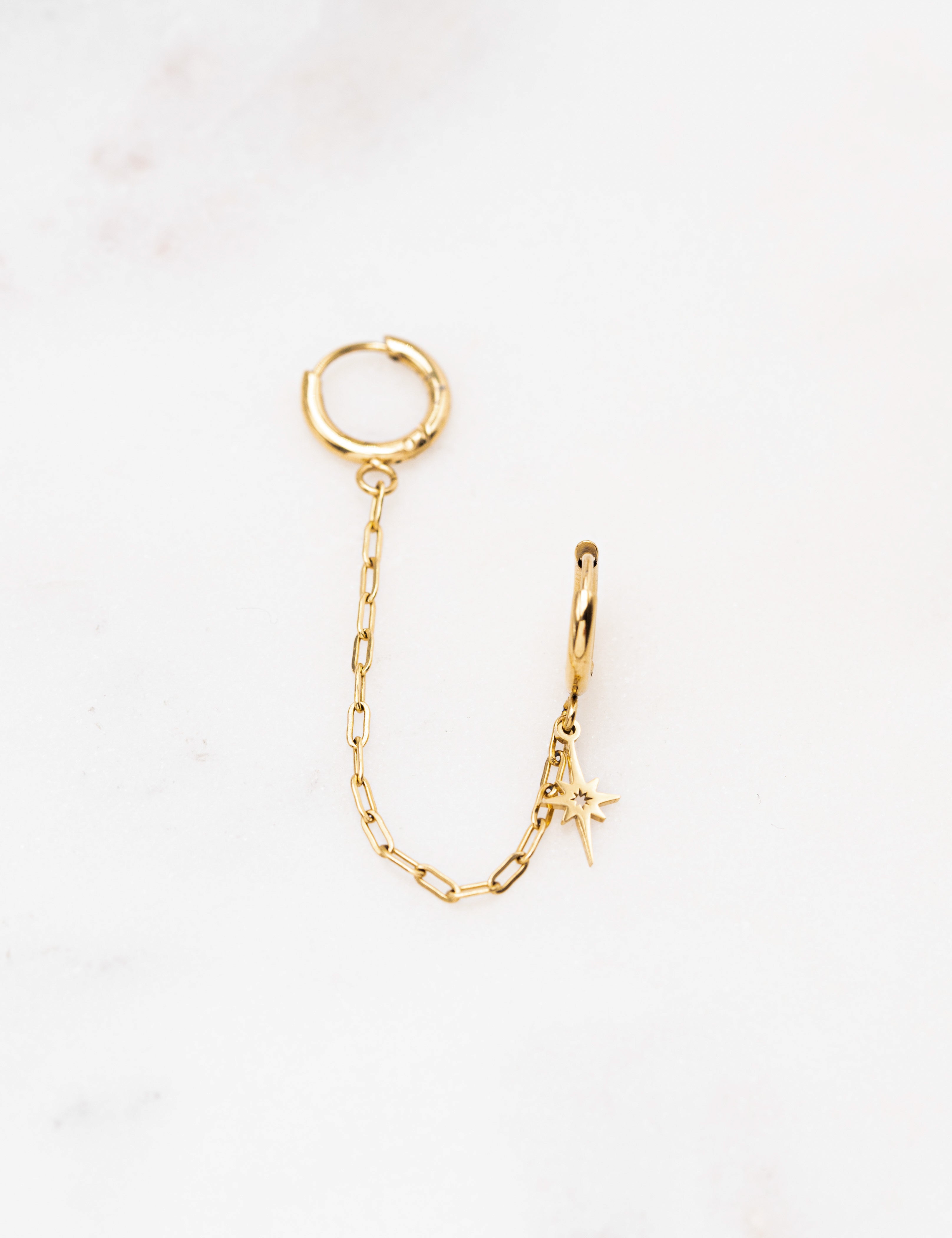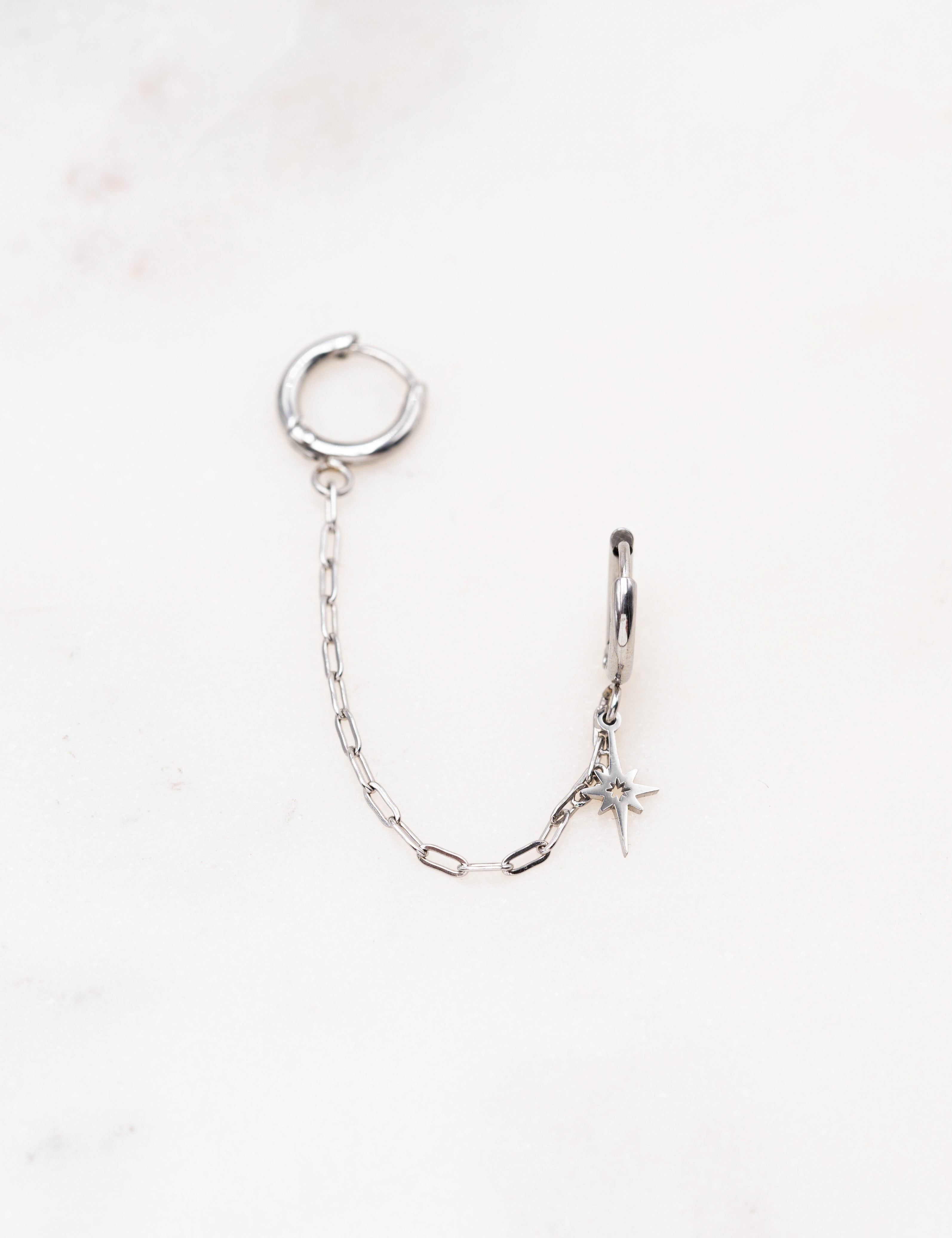 Mono boucle d'oreille type créole à fermoir charnière avec chaine et pampille étoilée et ajourée. Disponibles en doré et argenté. Il s'agit d'une mono boucle (adaptée pour une oreille à deux trous). Note importante: VENDU A L'UNITE et non par paire.