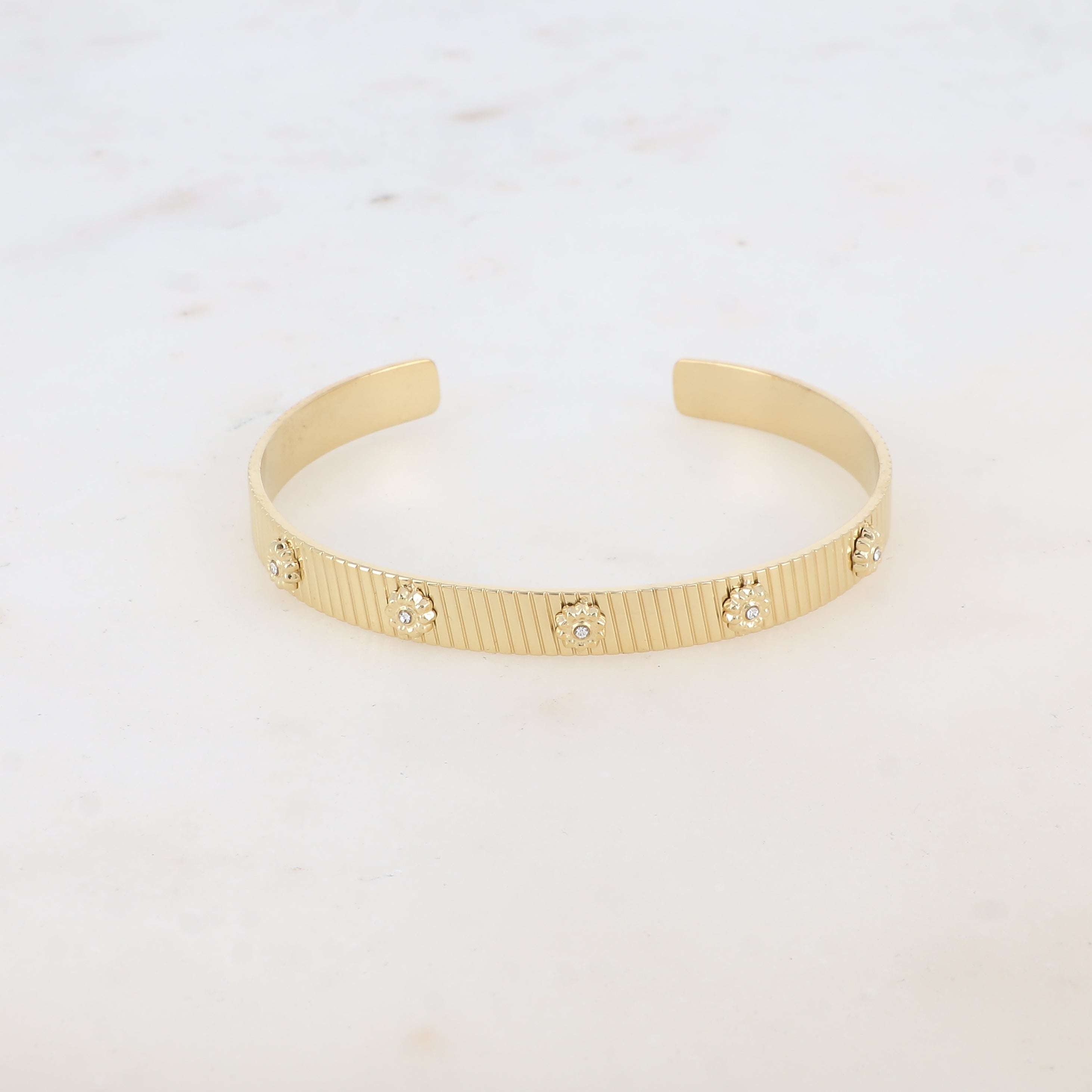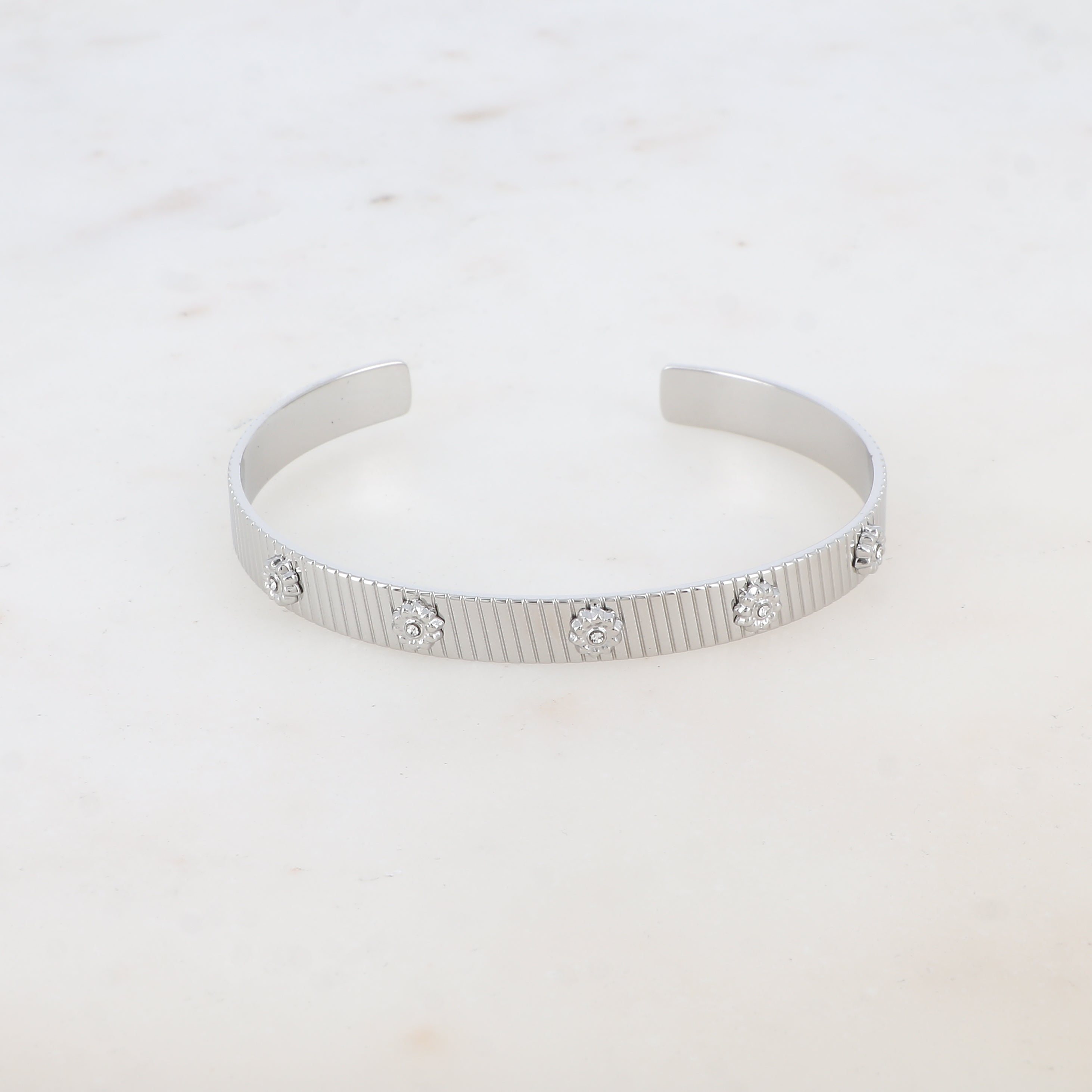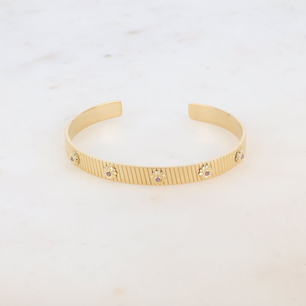 Bracelet type jonc malléable texturé, embelli de motifs floraux ornés de strass.