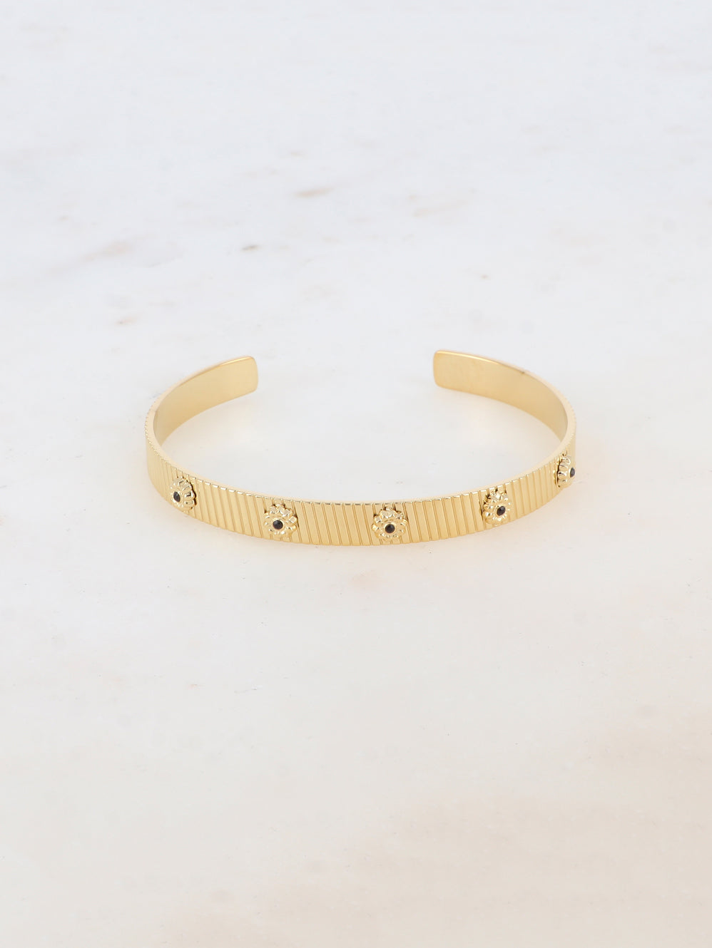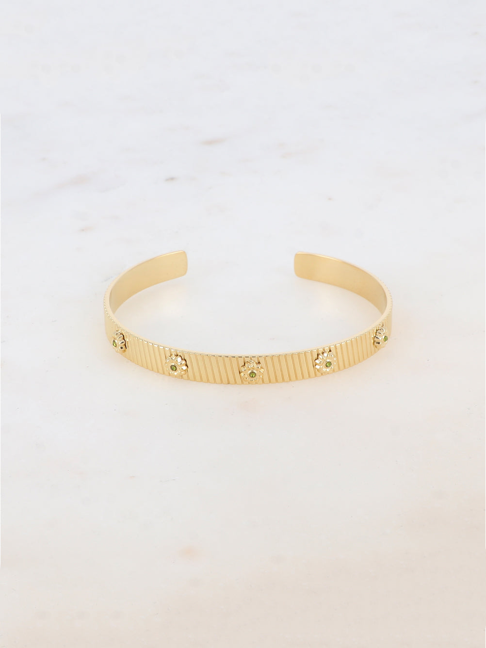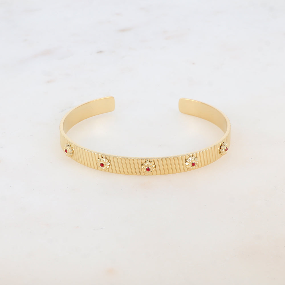 Bracelet type jonc malléable texturé, embelli de motifs floraux ornés de strass.