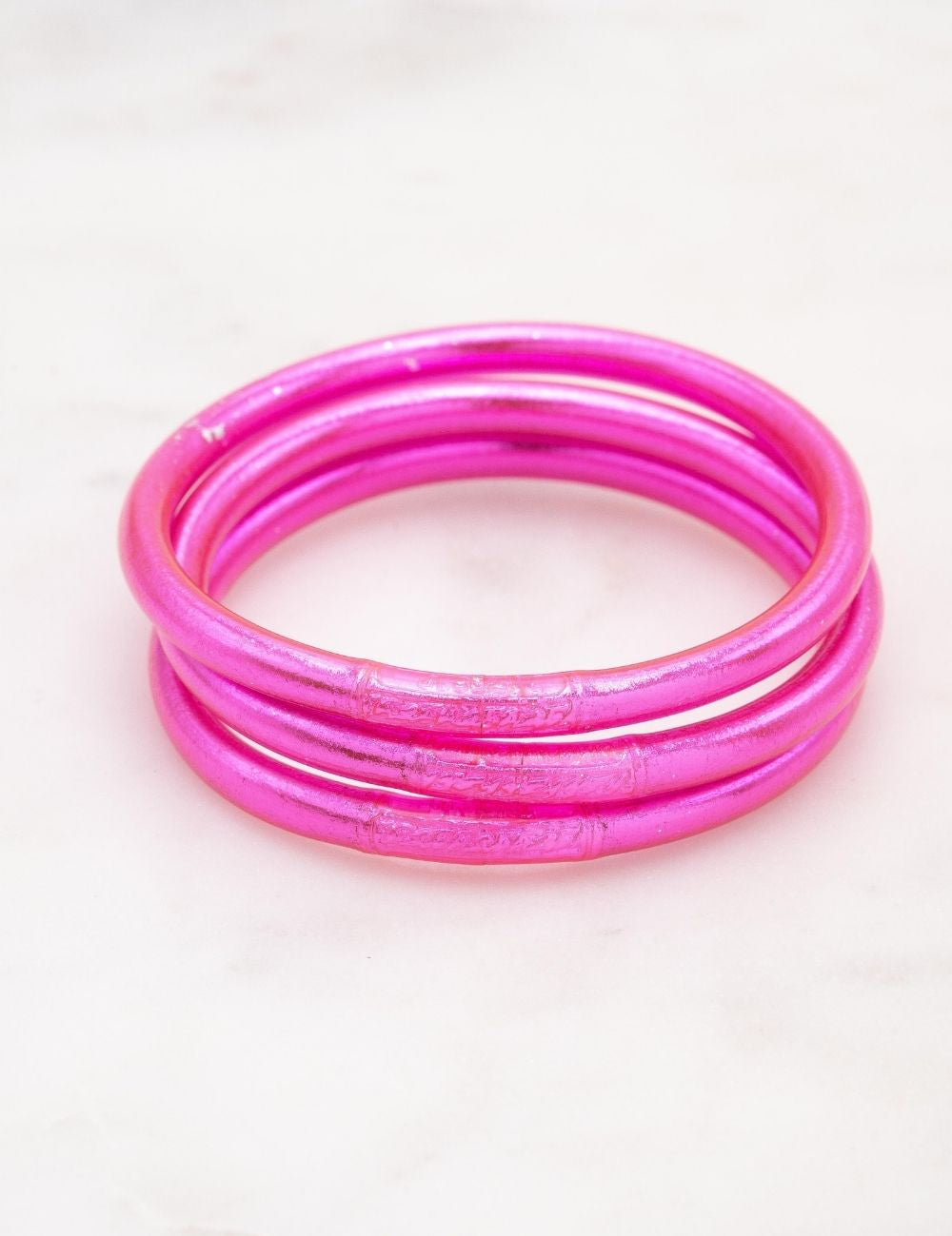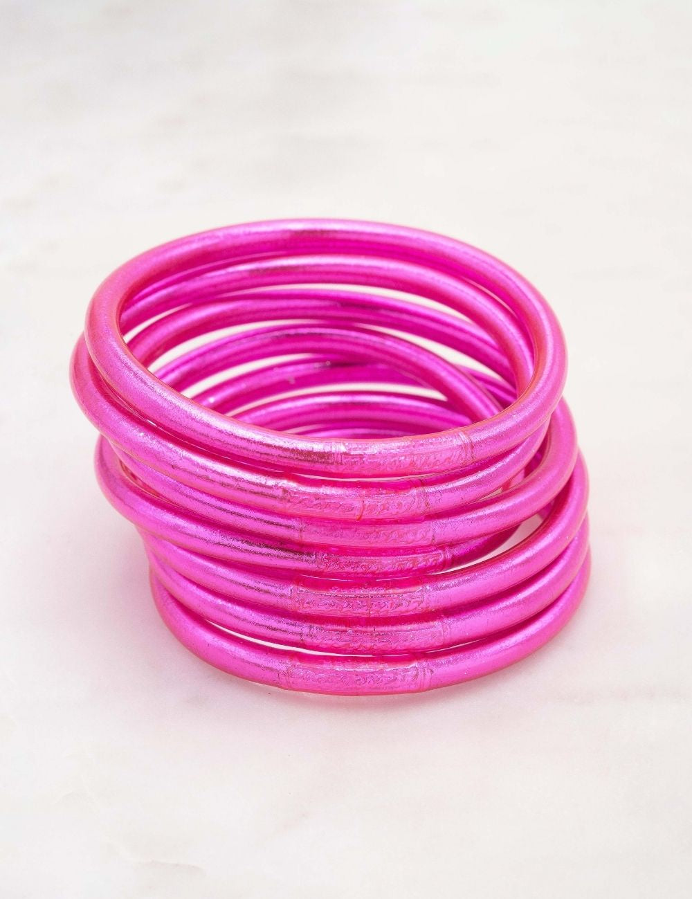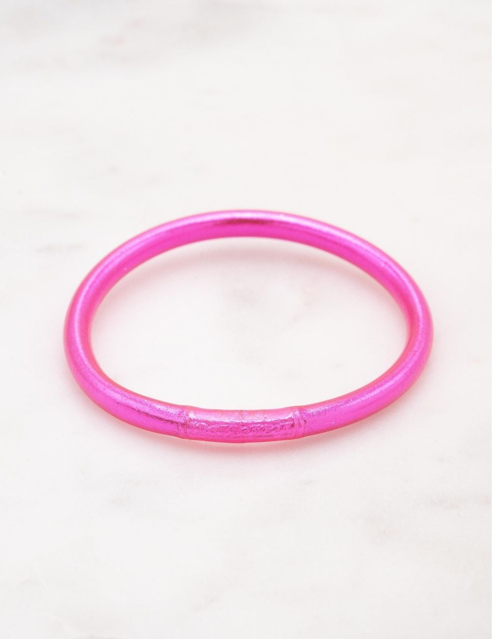 Jonc souple transparent rempli de feuilles argentées décoratives, scellé avec un mantra gravé "Bonheur, Chance, Fortune et Amour" en thaïlandais