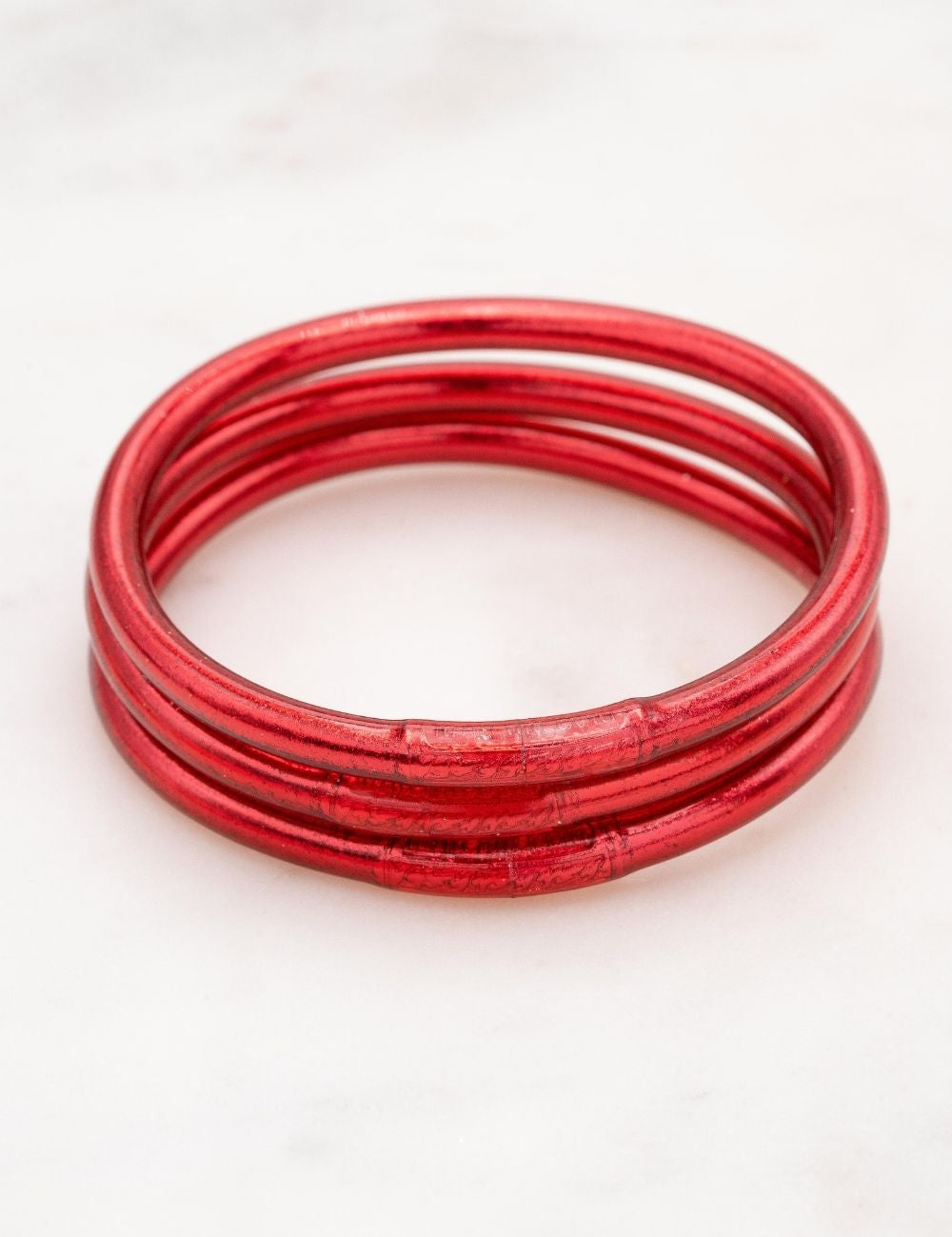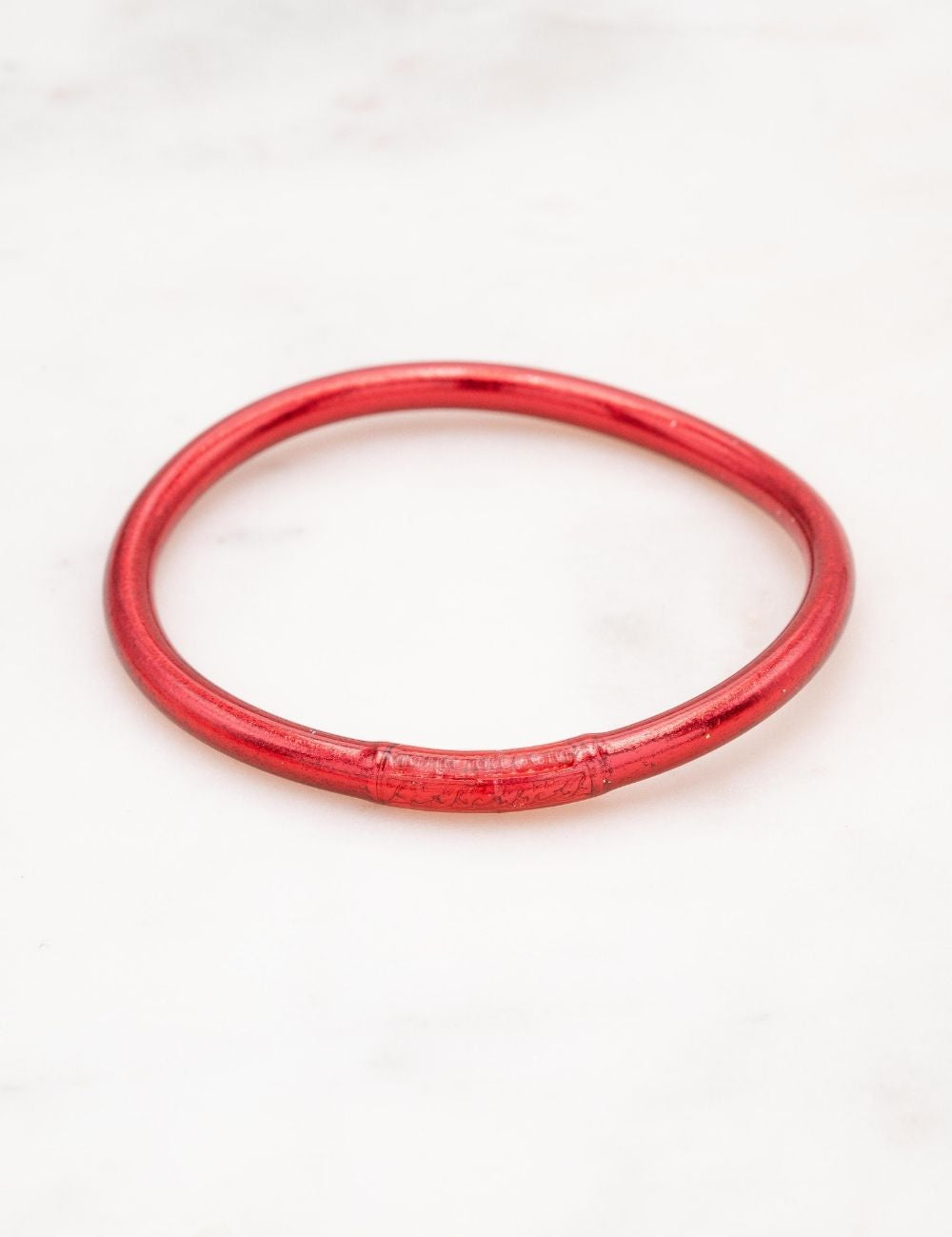 Jonc souple transparent rempli de feuilles argentées décoratives, scellé avec un mantra gravé "Bonheur, Chance, Fortune et Amour" en thaïlandais