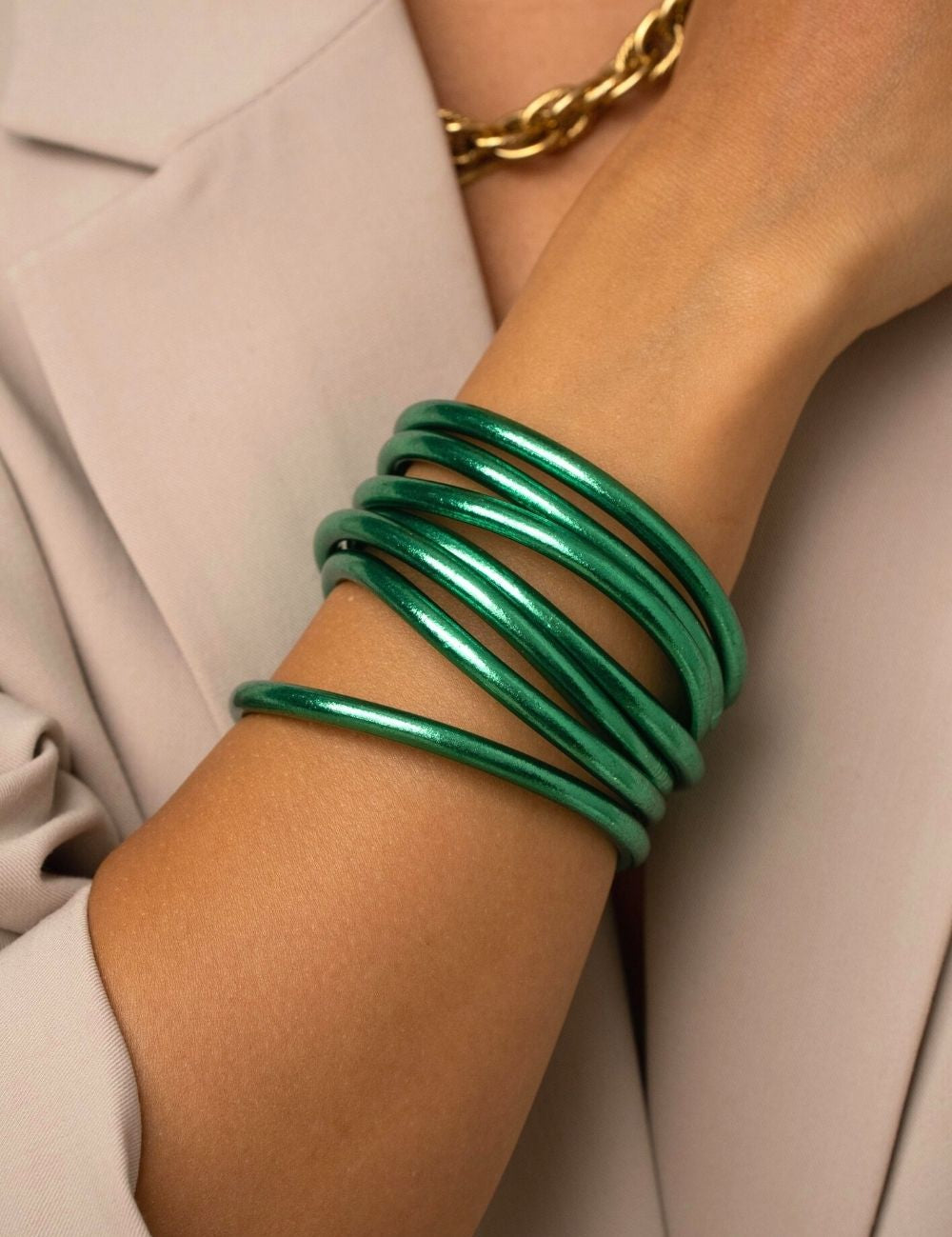 Matière: Bracelet souple en PVC rempli de feuilles dorées ou argentées décoratives et d'un connecteur en laiton.