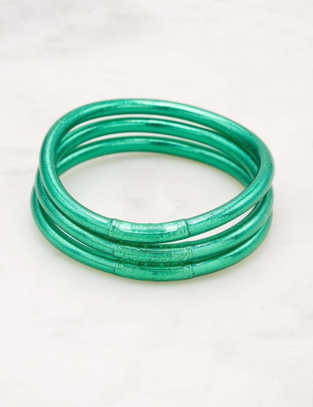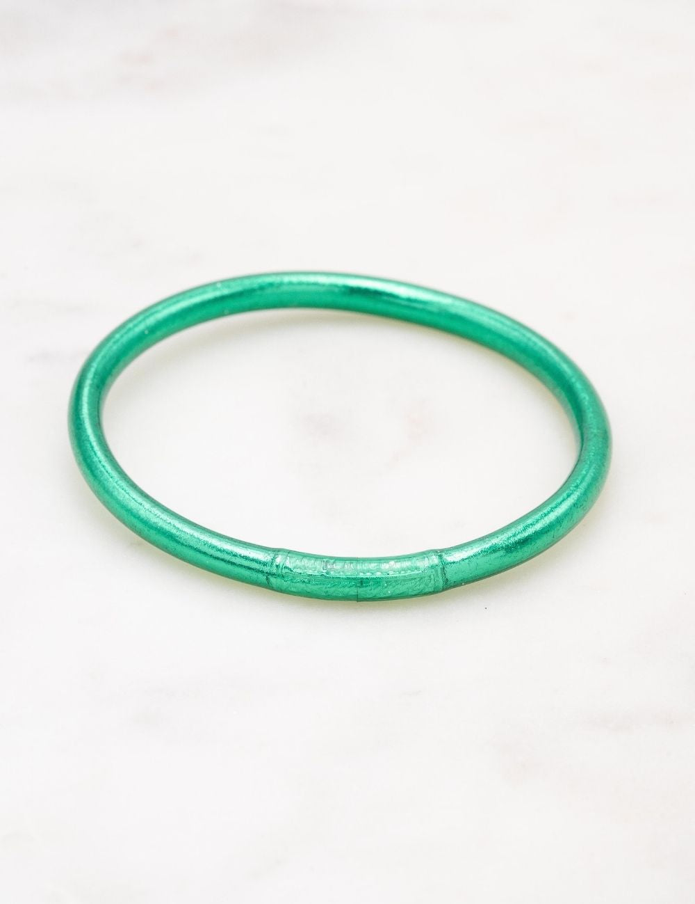 Jonc souple transparent rempli de feuilles argentées décoratives, scellé avec un mantra gravé "Bonheur, Chance, Fortune et Amour" en thaïlandais