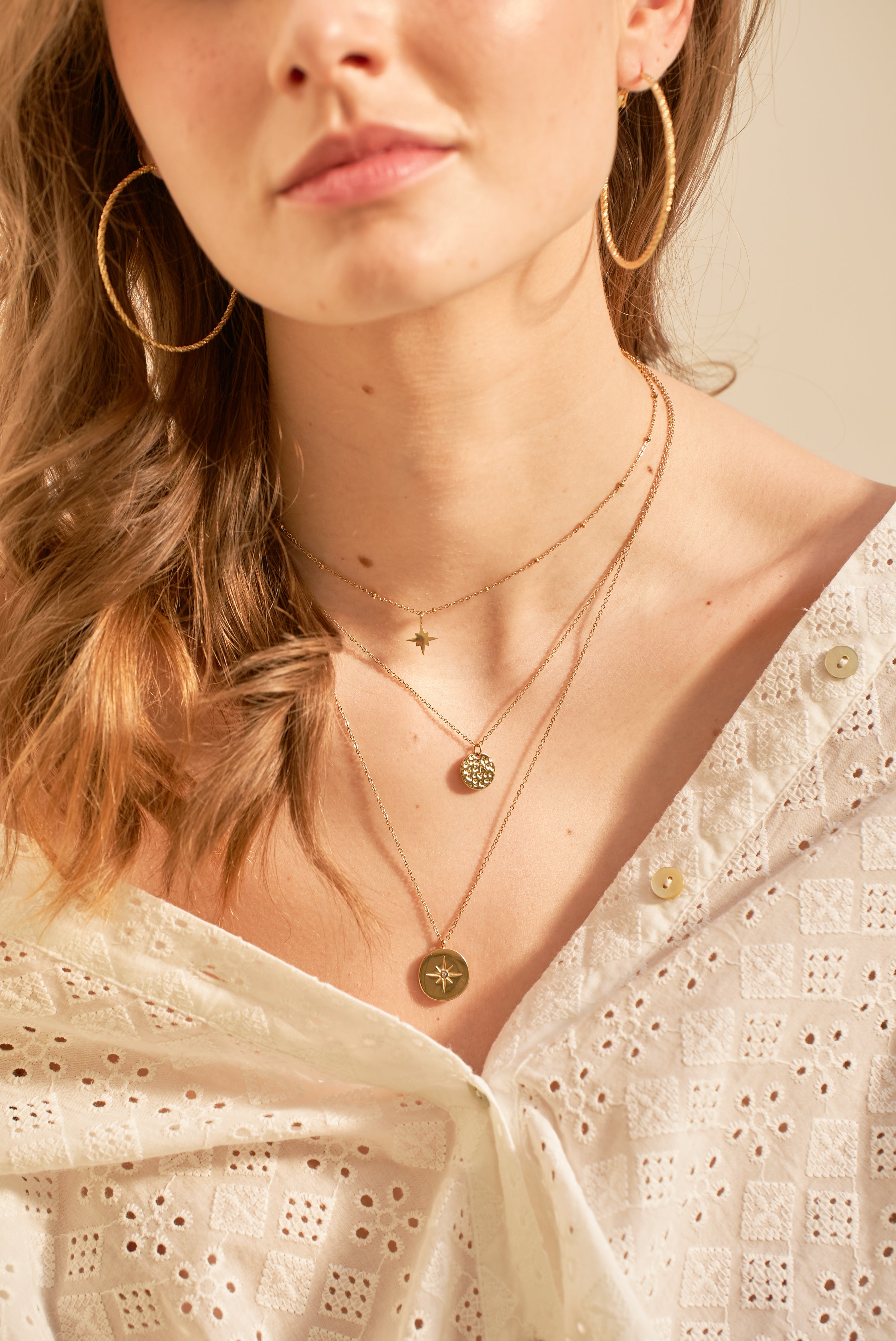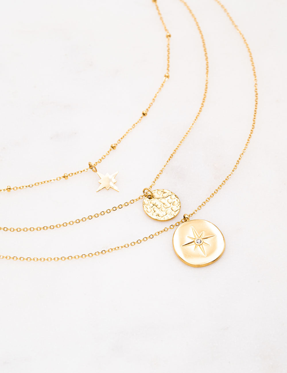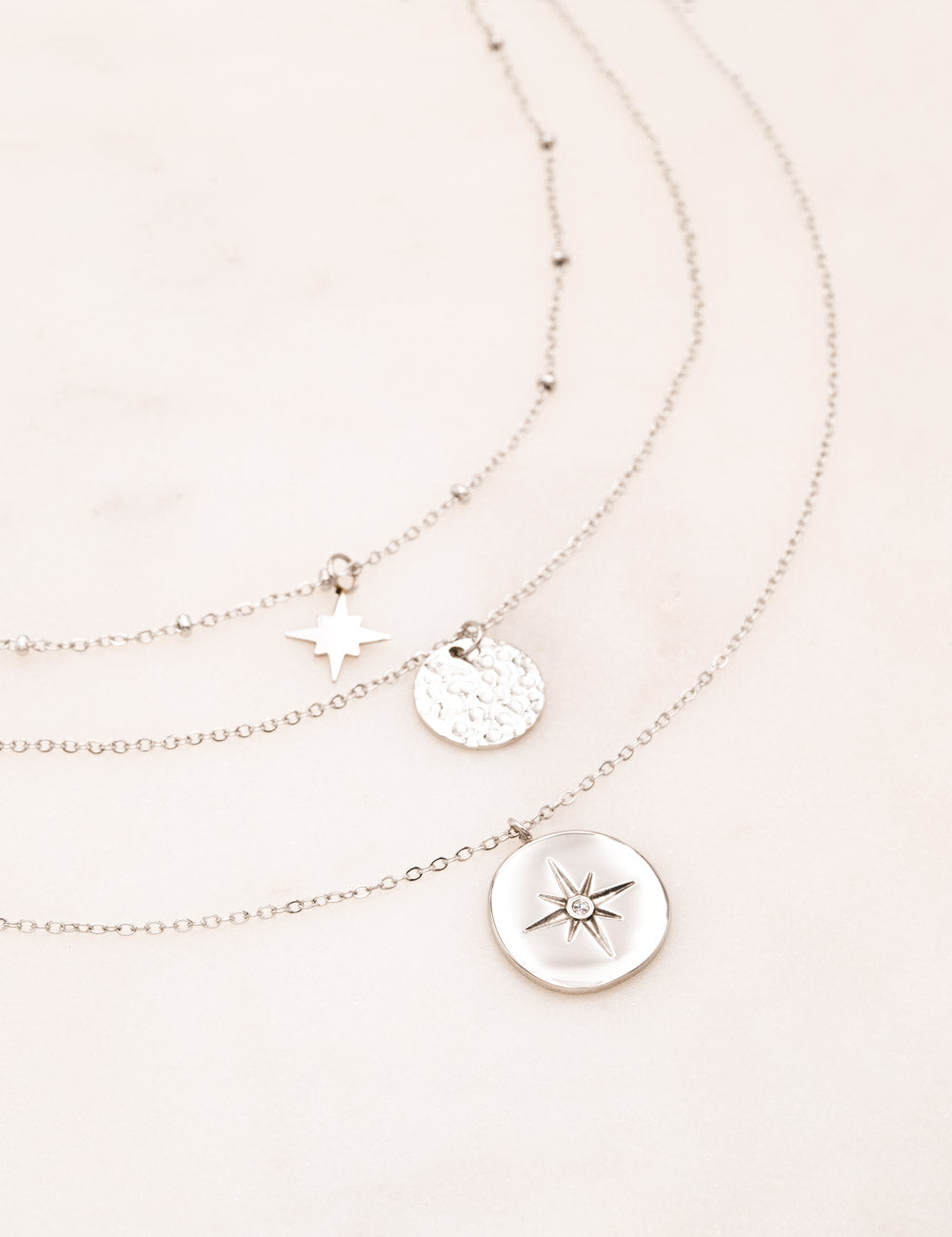 Collier réglable sur chaine 3 rangs composé d'une pièce étoilée, d'une pièce martelée et d'une pampille étoilé ornée d'un petit strass zirconium.