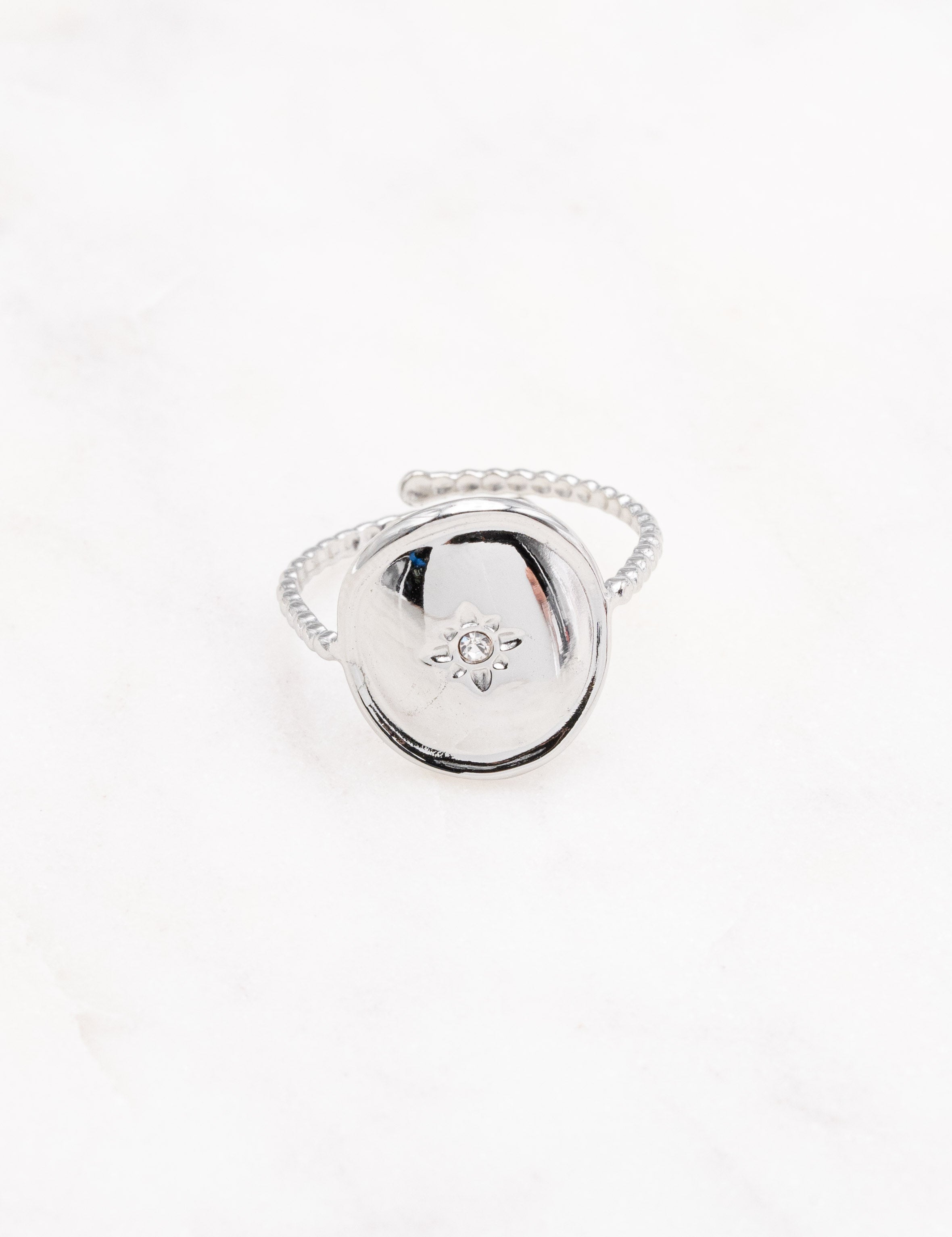 Bague fine ajustable avec une pièce ronde au motif étoile ornée d'un strass zirconium.