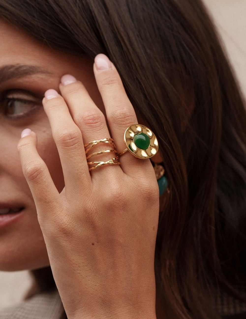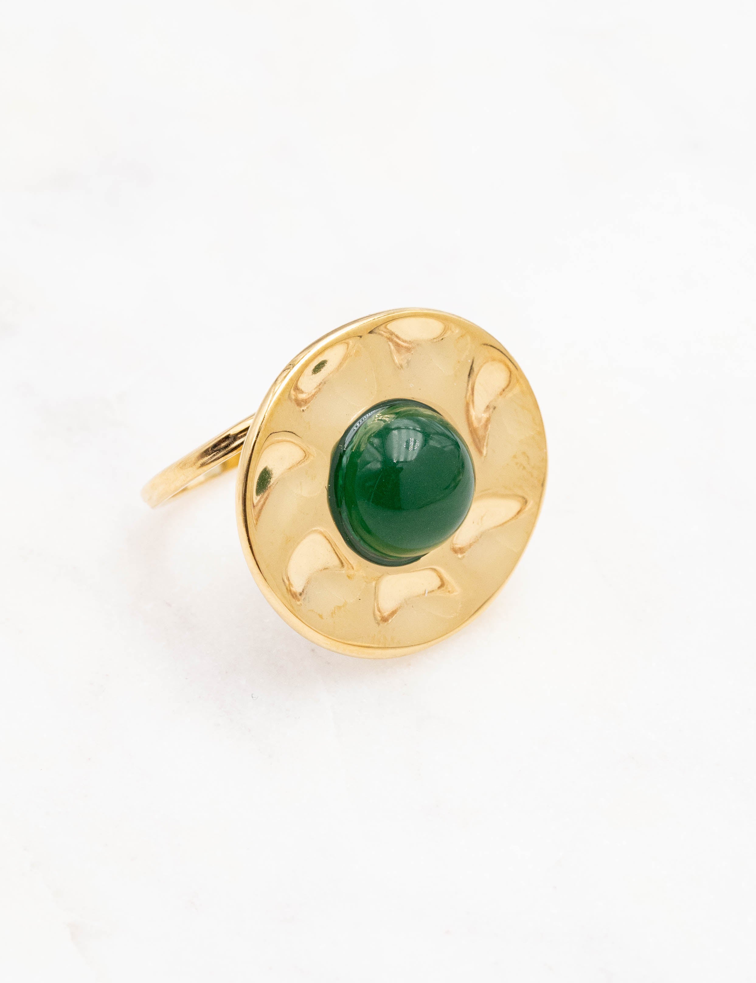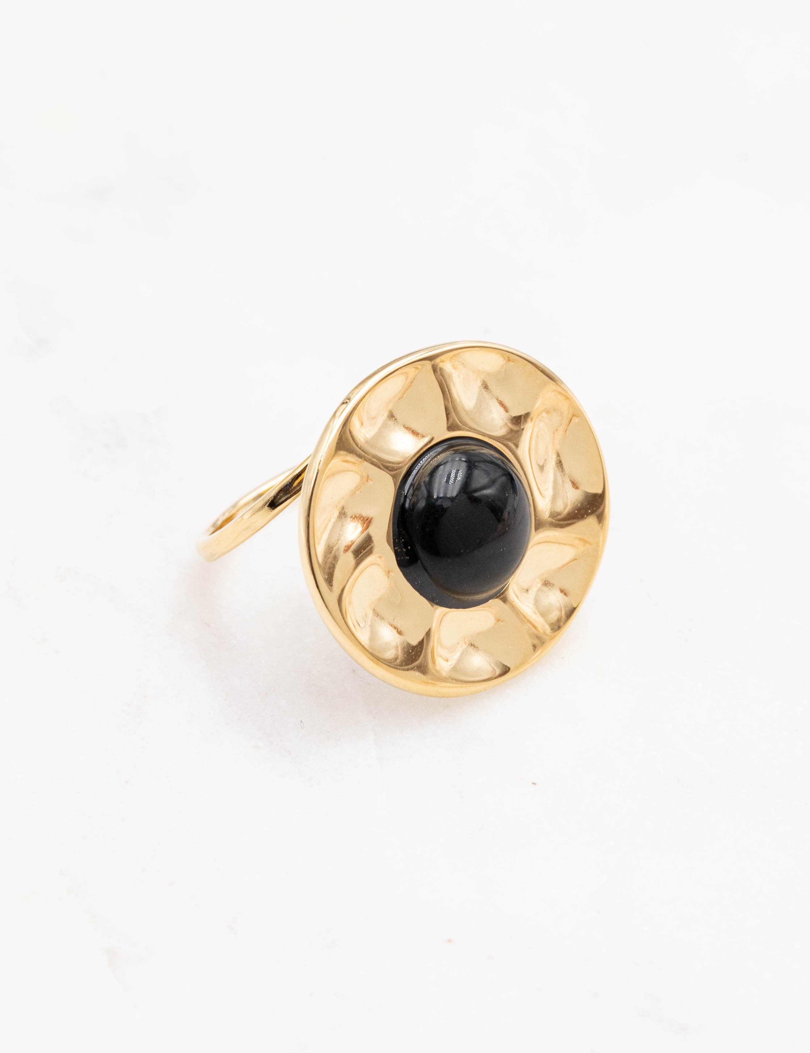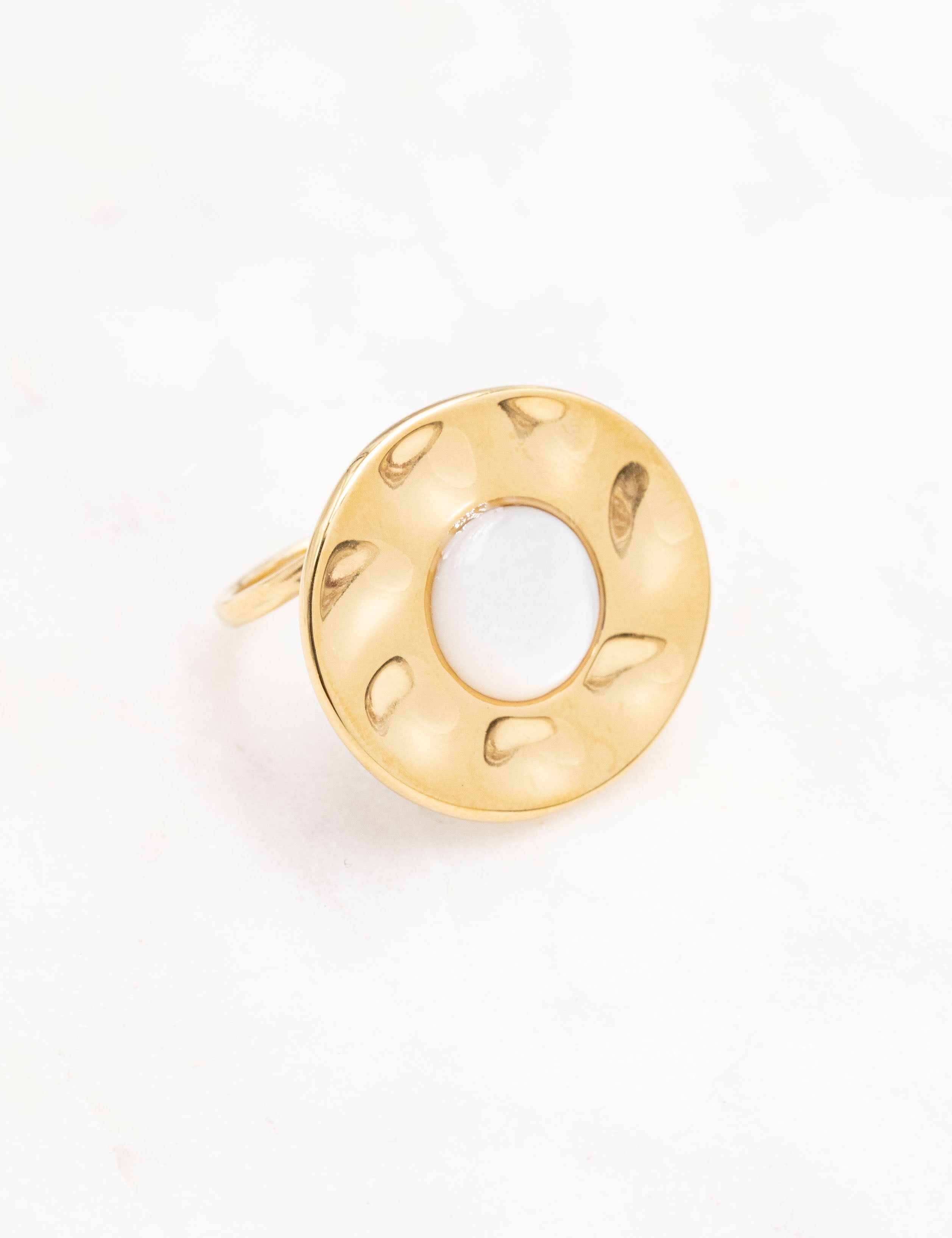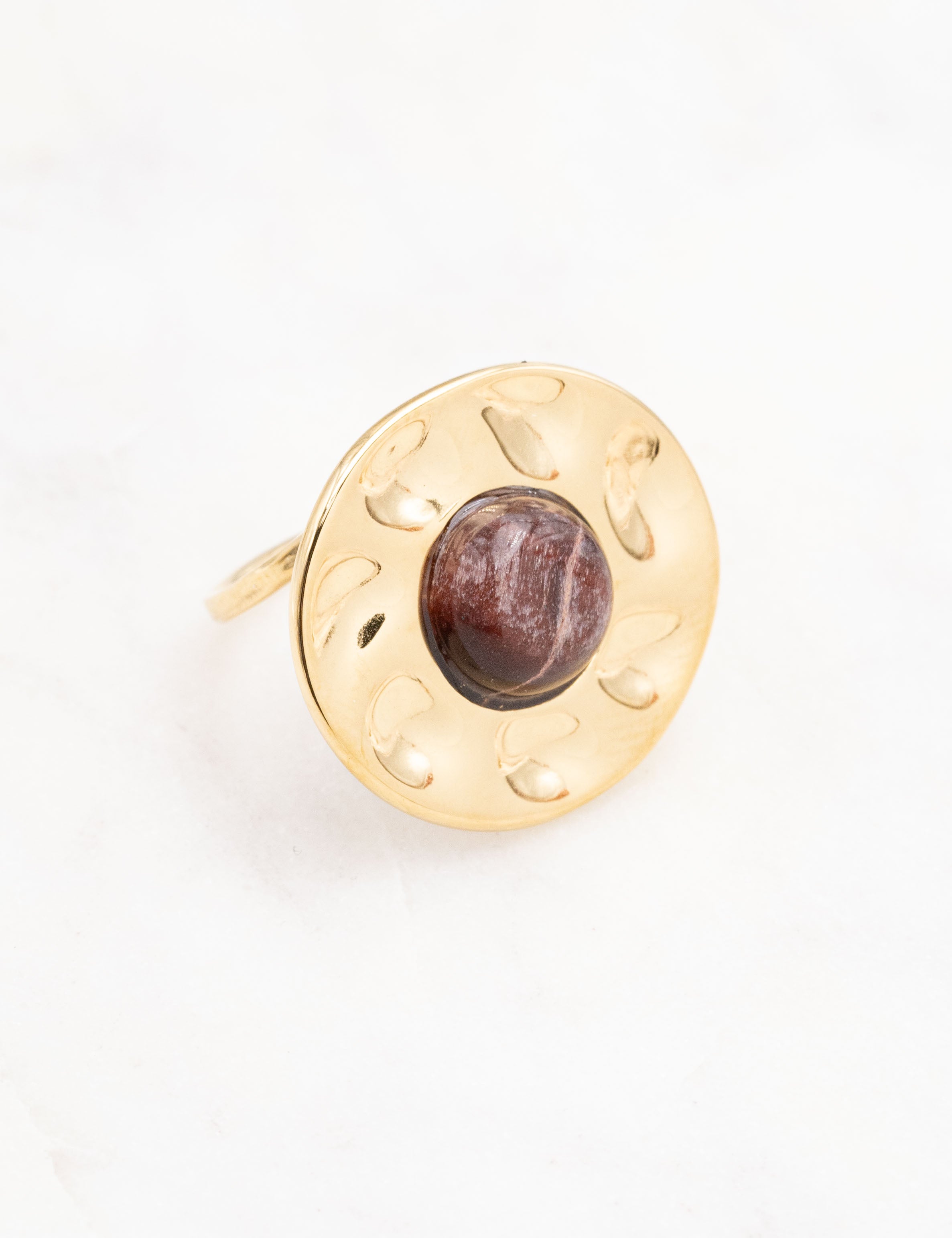 Bague ajustable composée d'une pièce martelée ornée d'une pierre naturelle.