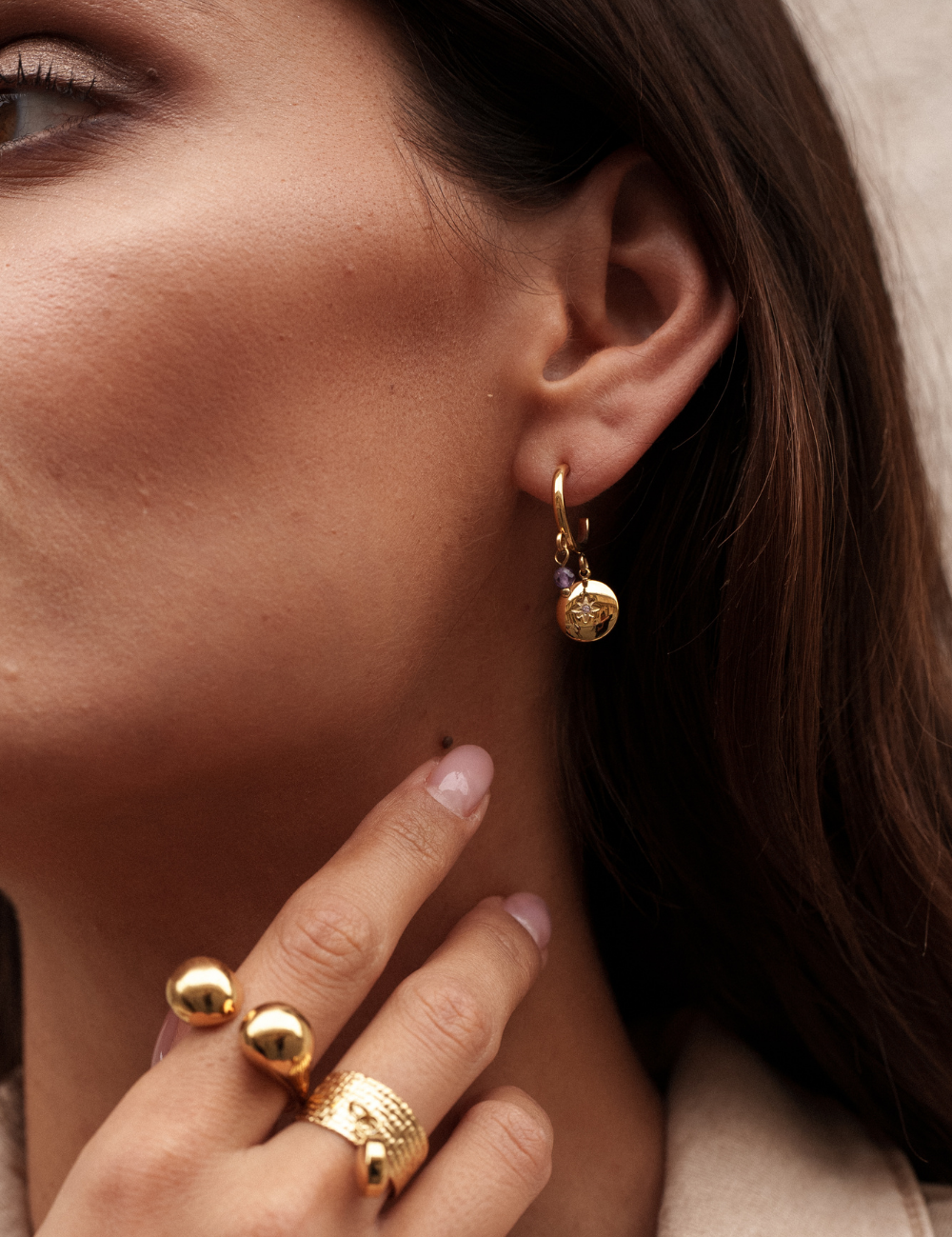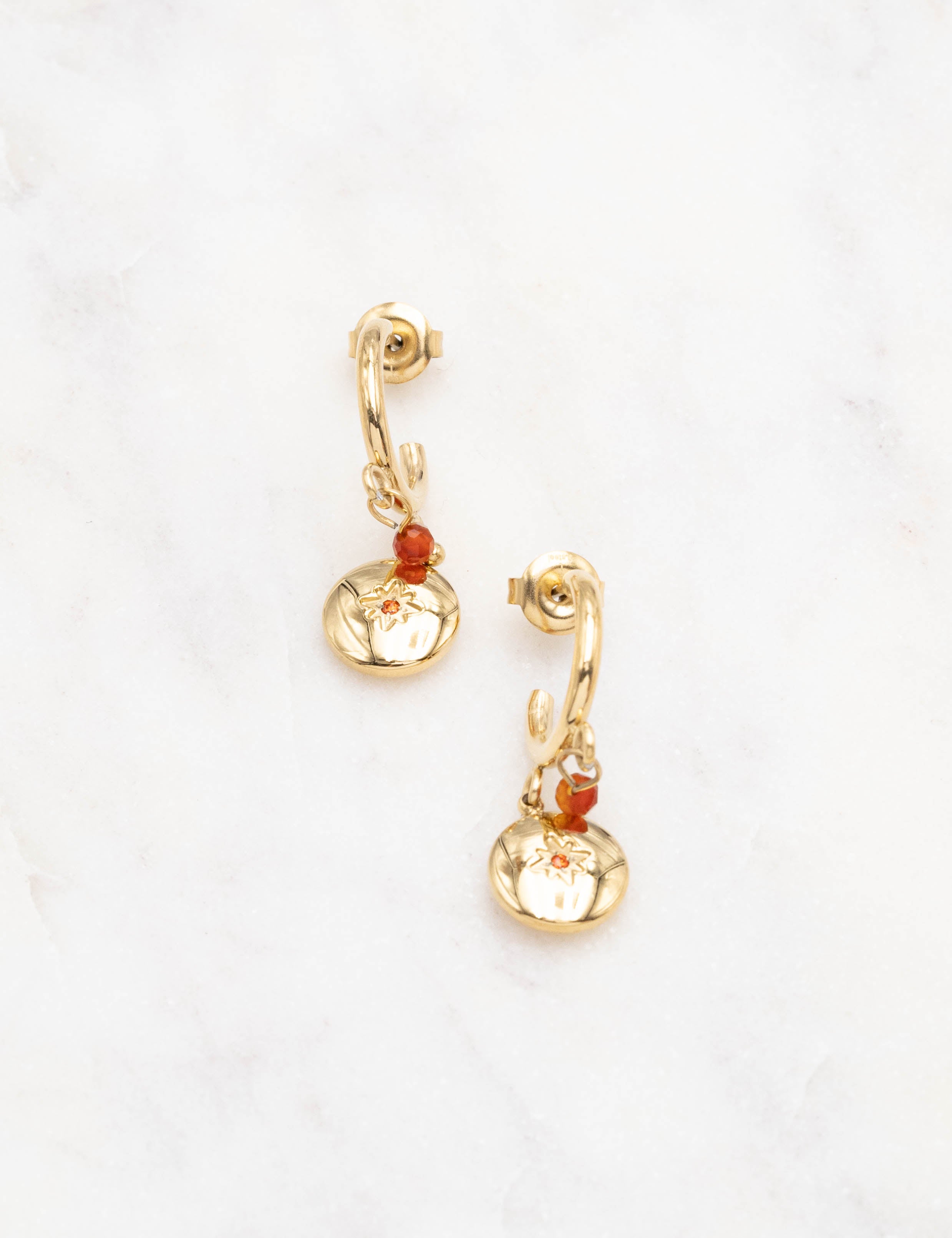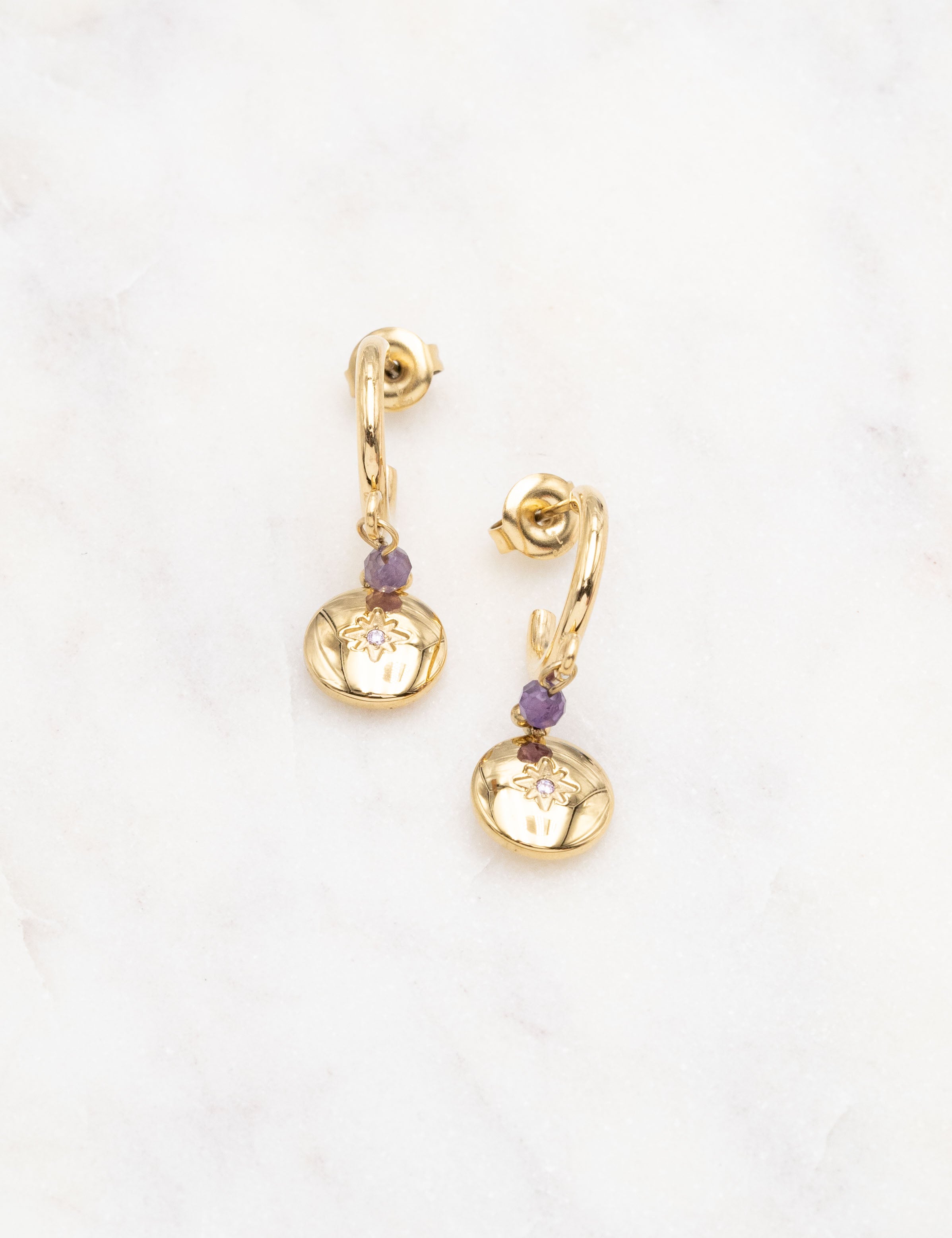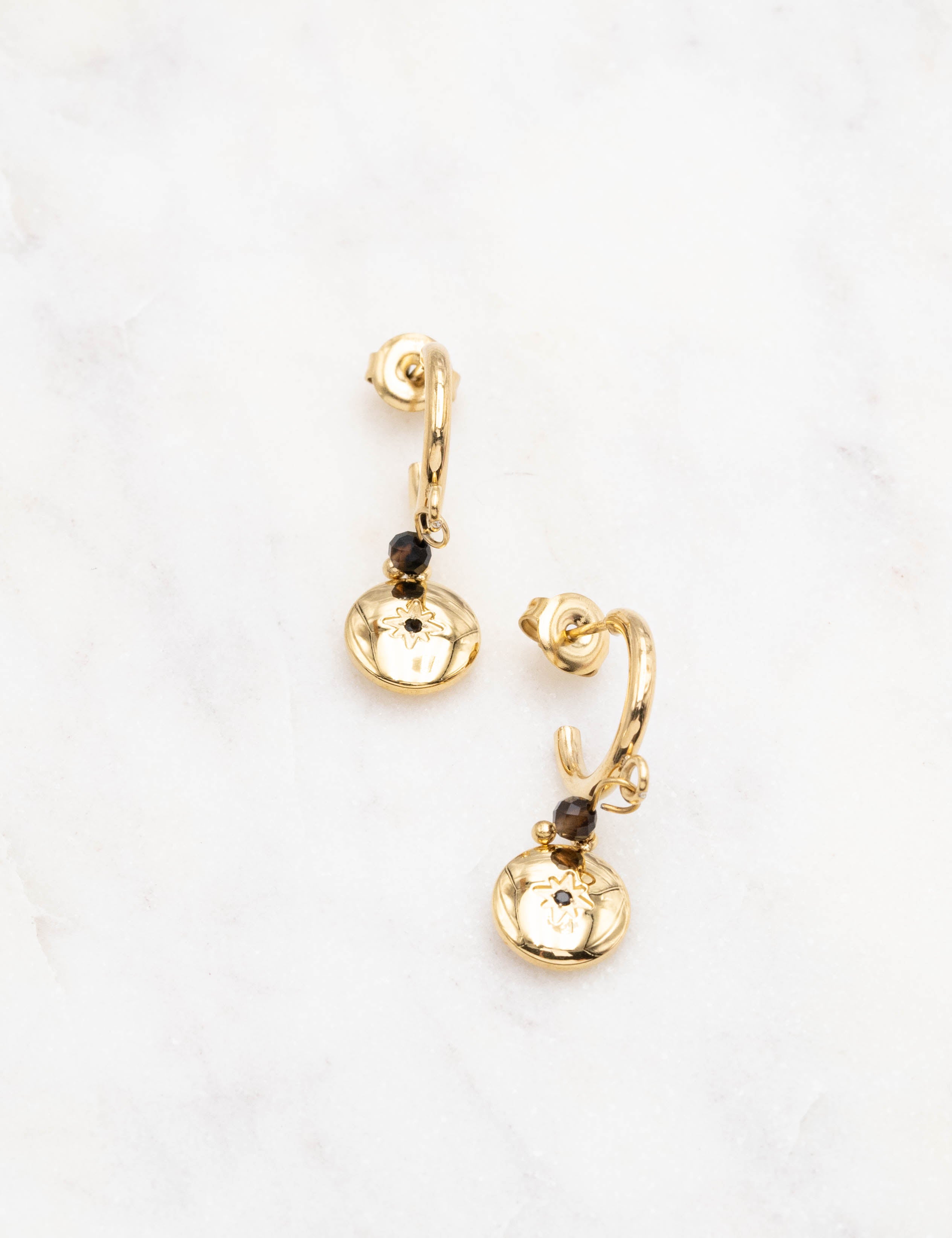 Boucles d'oreilles type créoles à puce composées d'une perle en pierres naturelles, d'une pièce ronde ornée d'une étoile gravée et d'un strass zirconium.