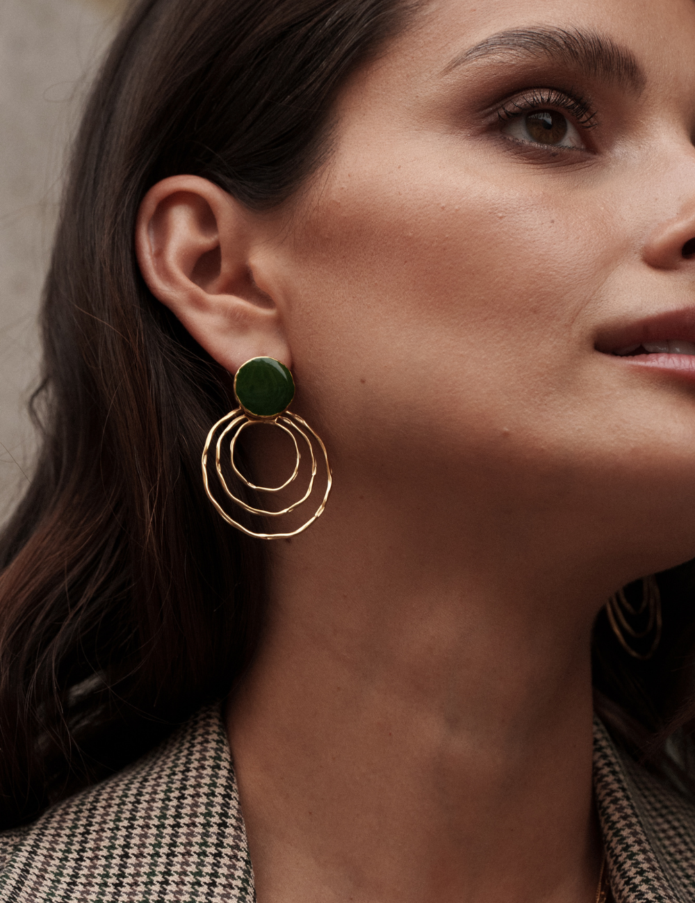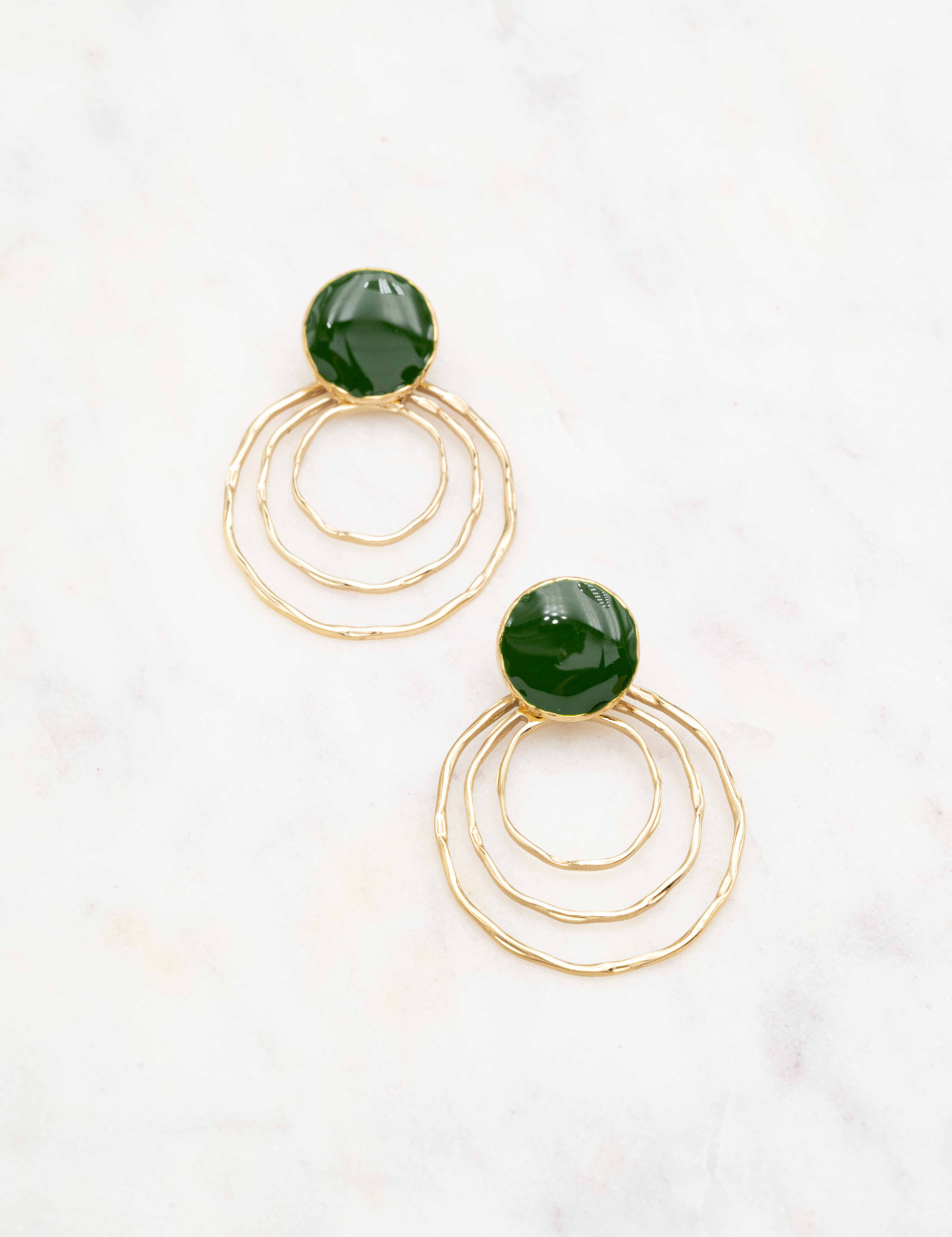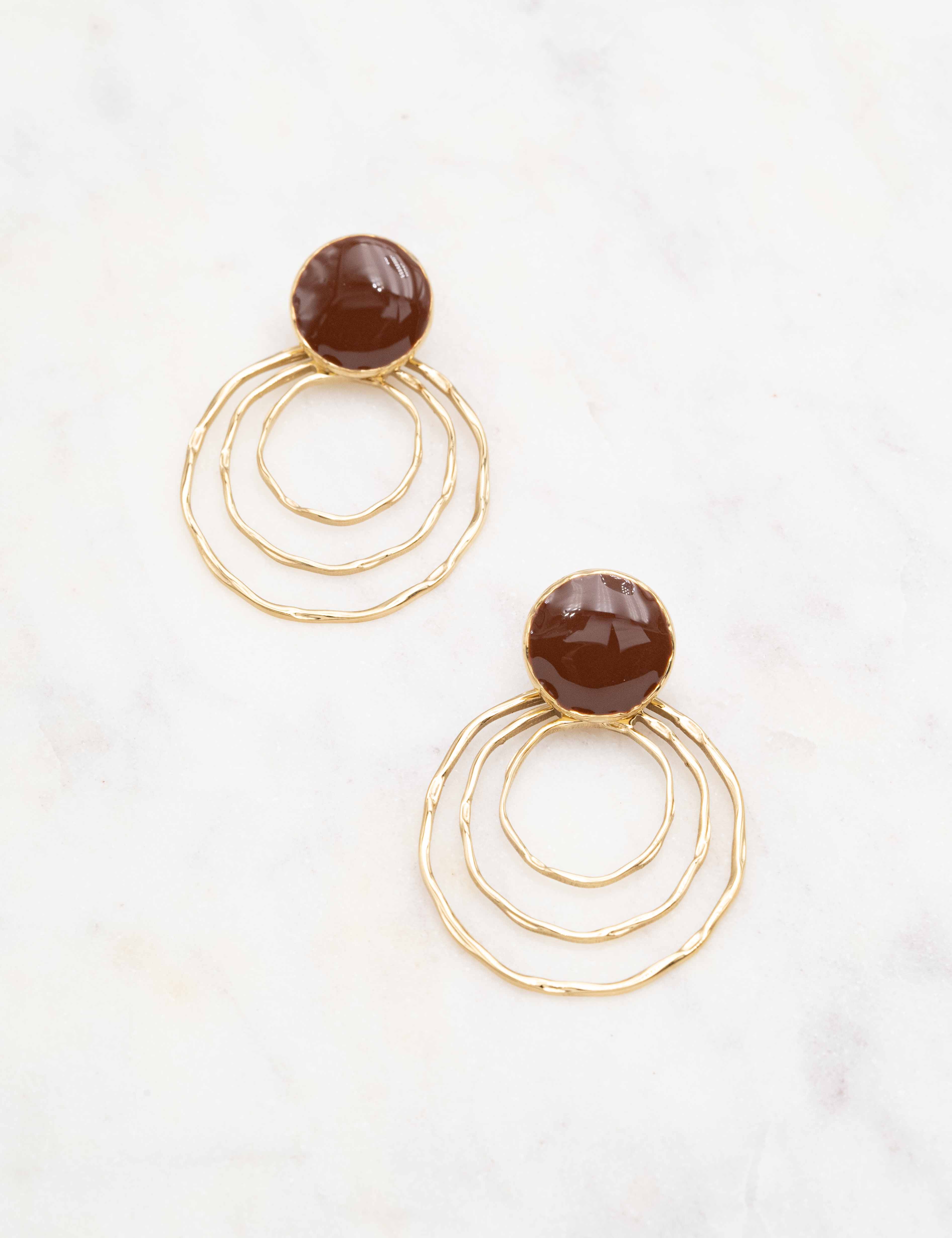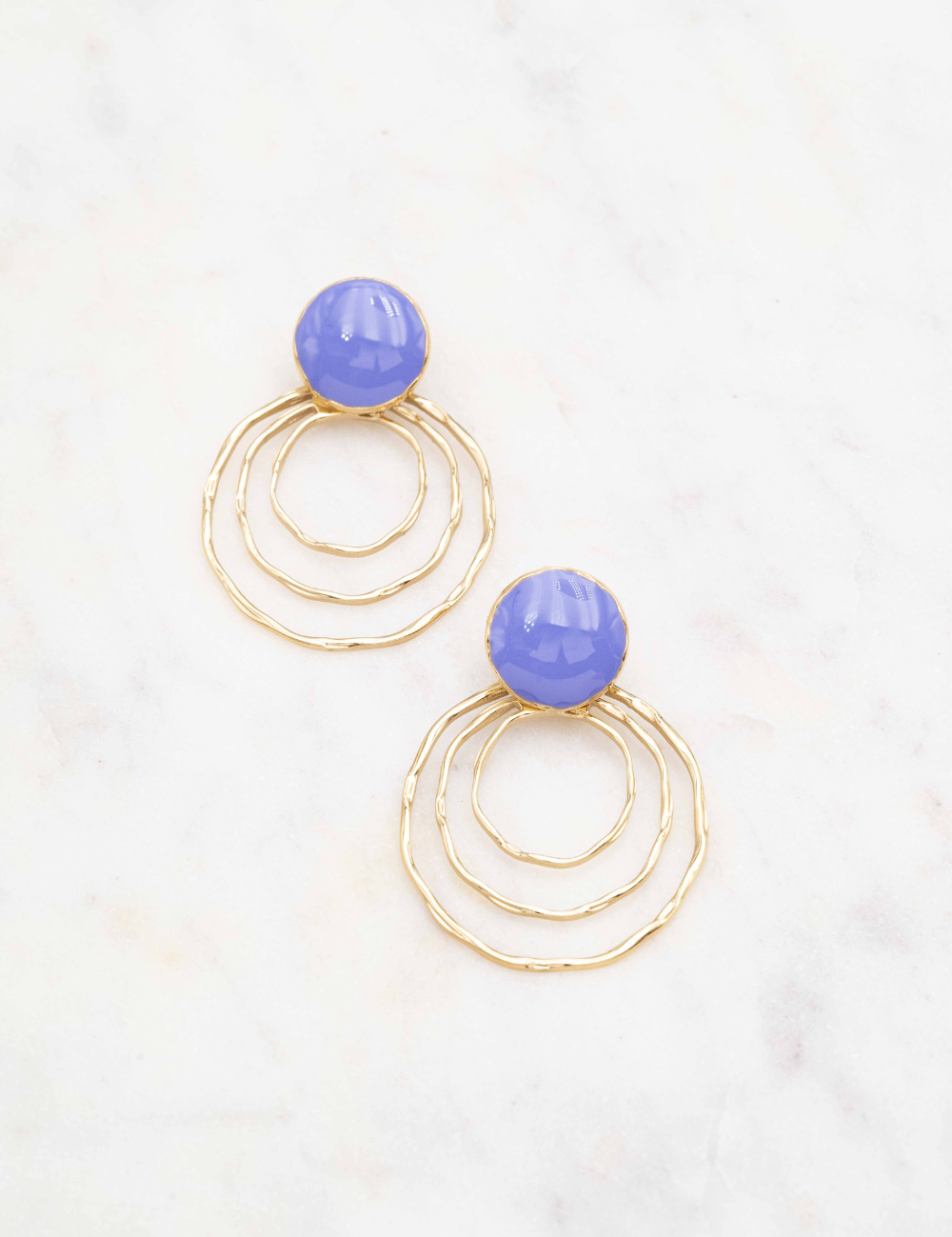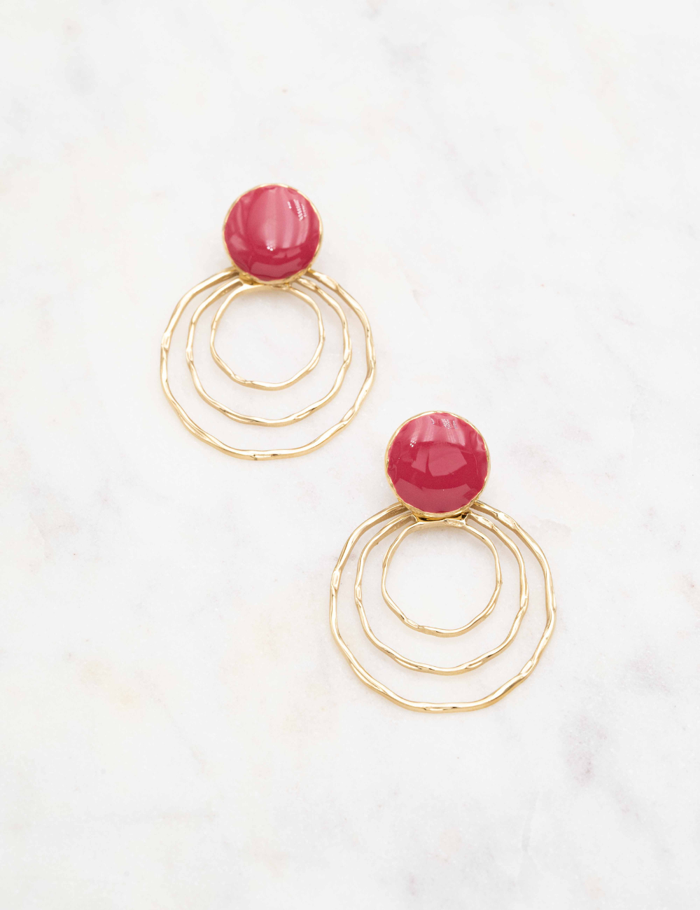 Boucles d'oreilles à puce composées d'une pièce ronde émaillée colorée et de trois anneaux texturés.