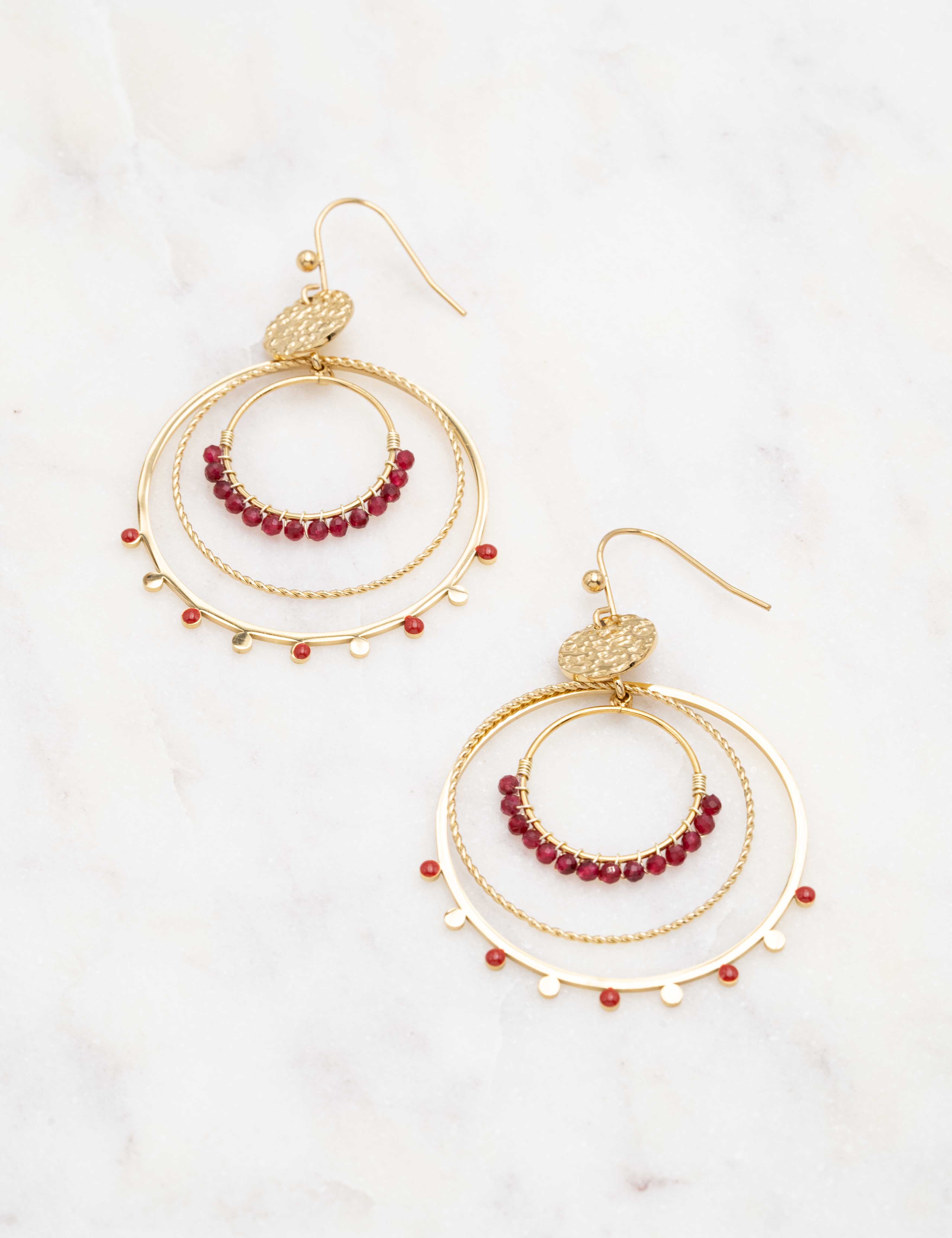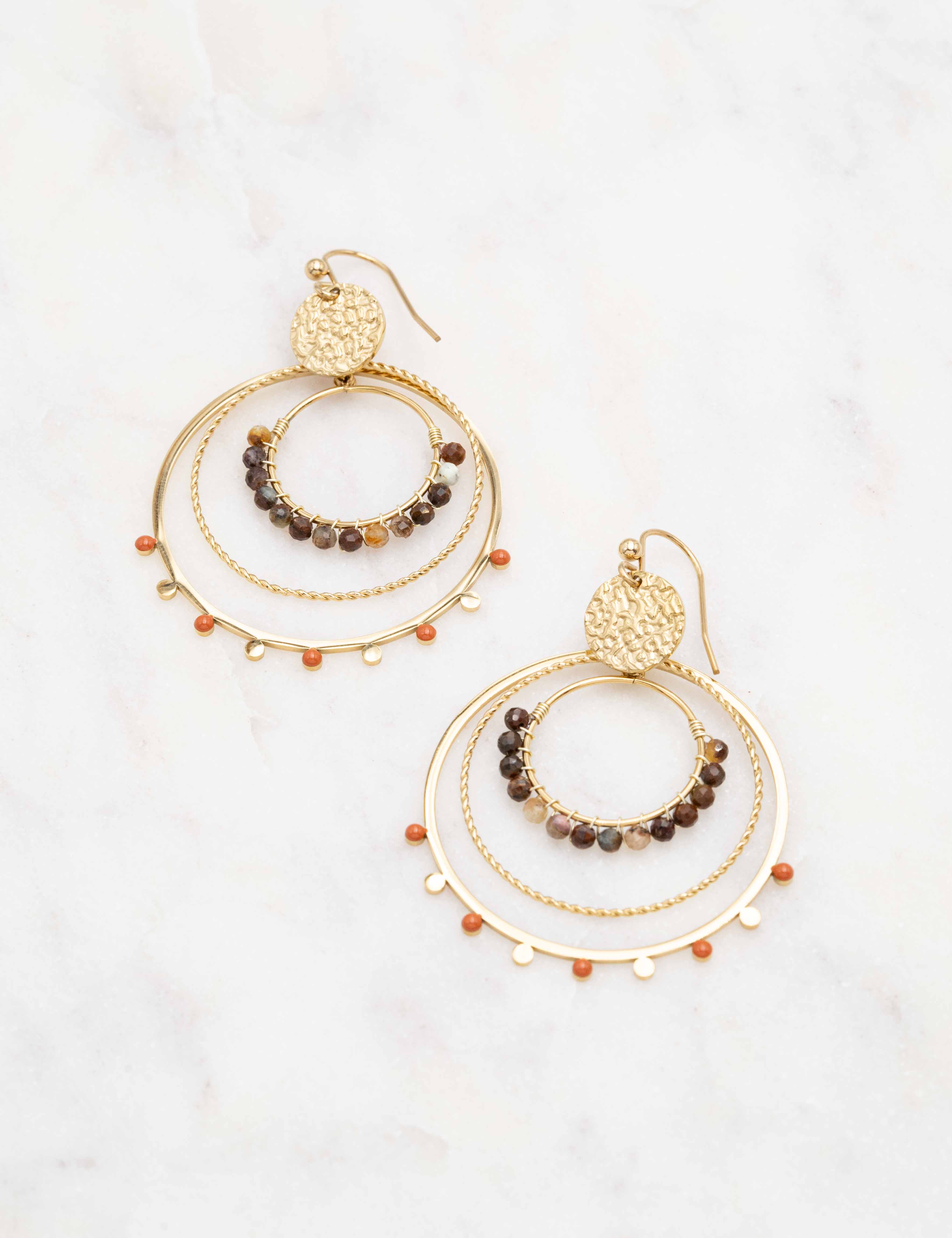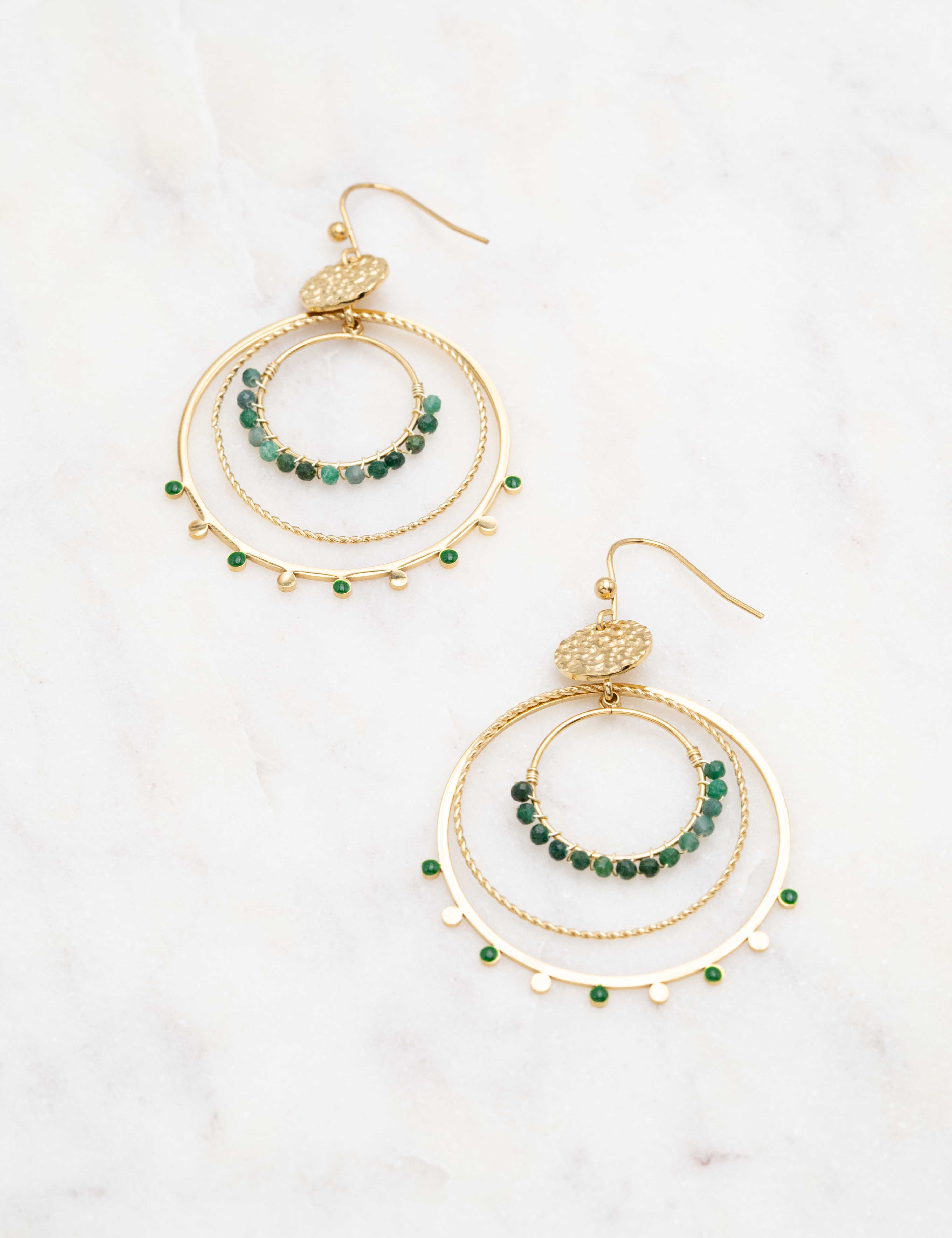 Boucles d'oreilles à crochet composées d'une pièce martelée et de plusieurs anneaux ornés de perles en pierres naturelles et des touches émaillées colorées.