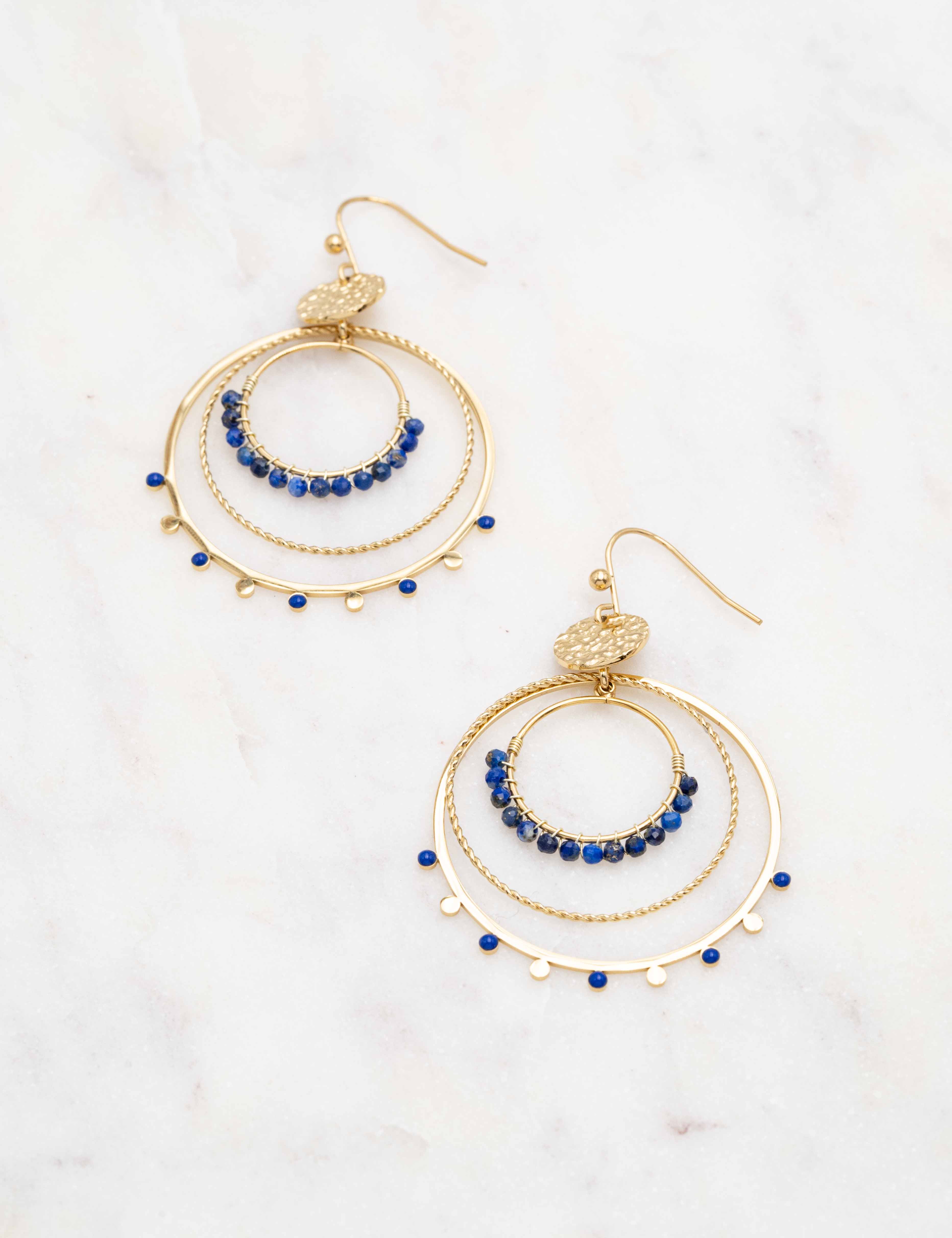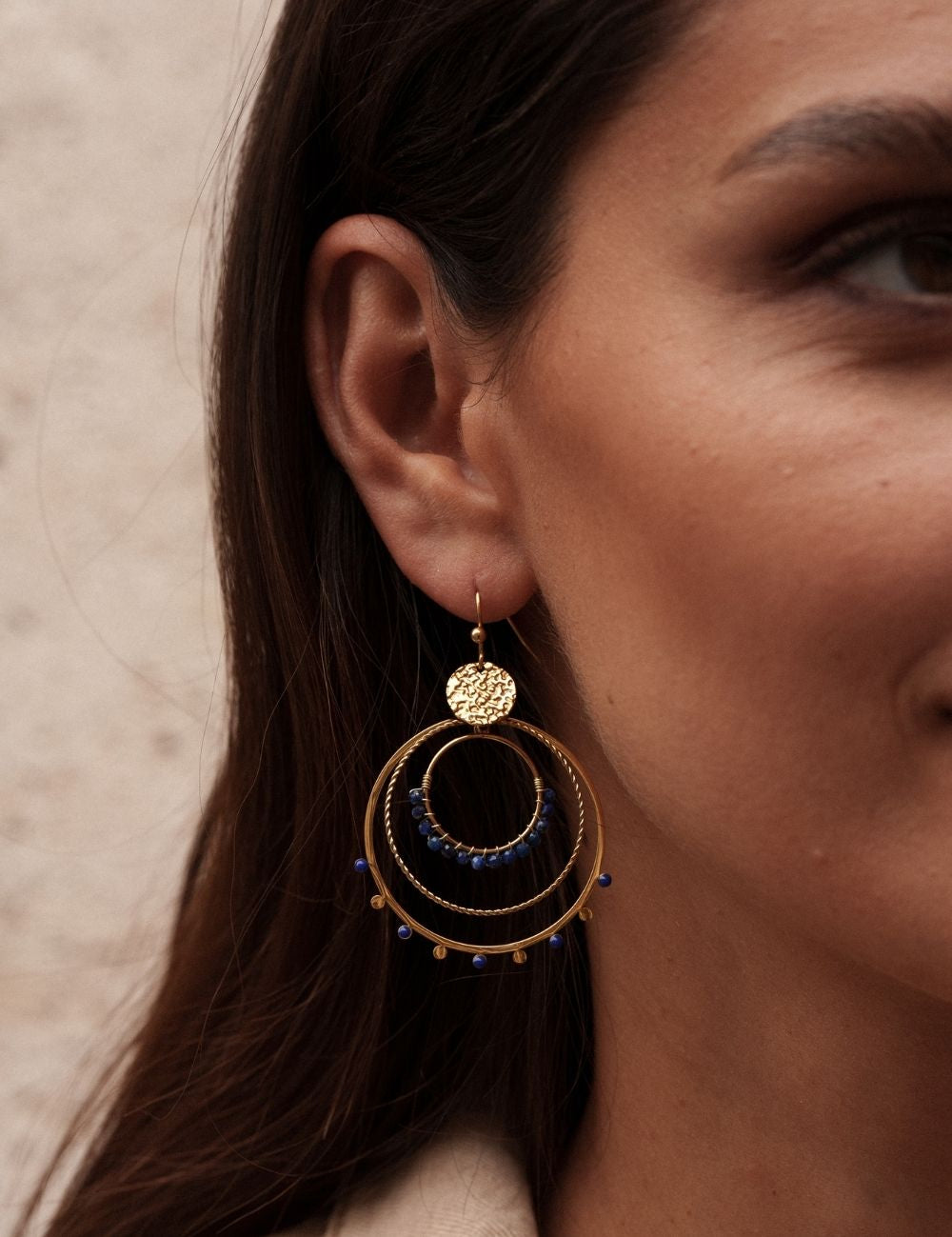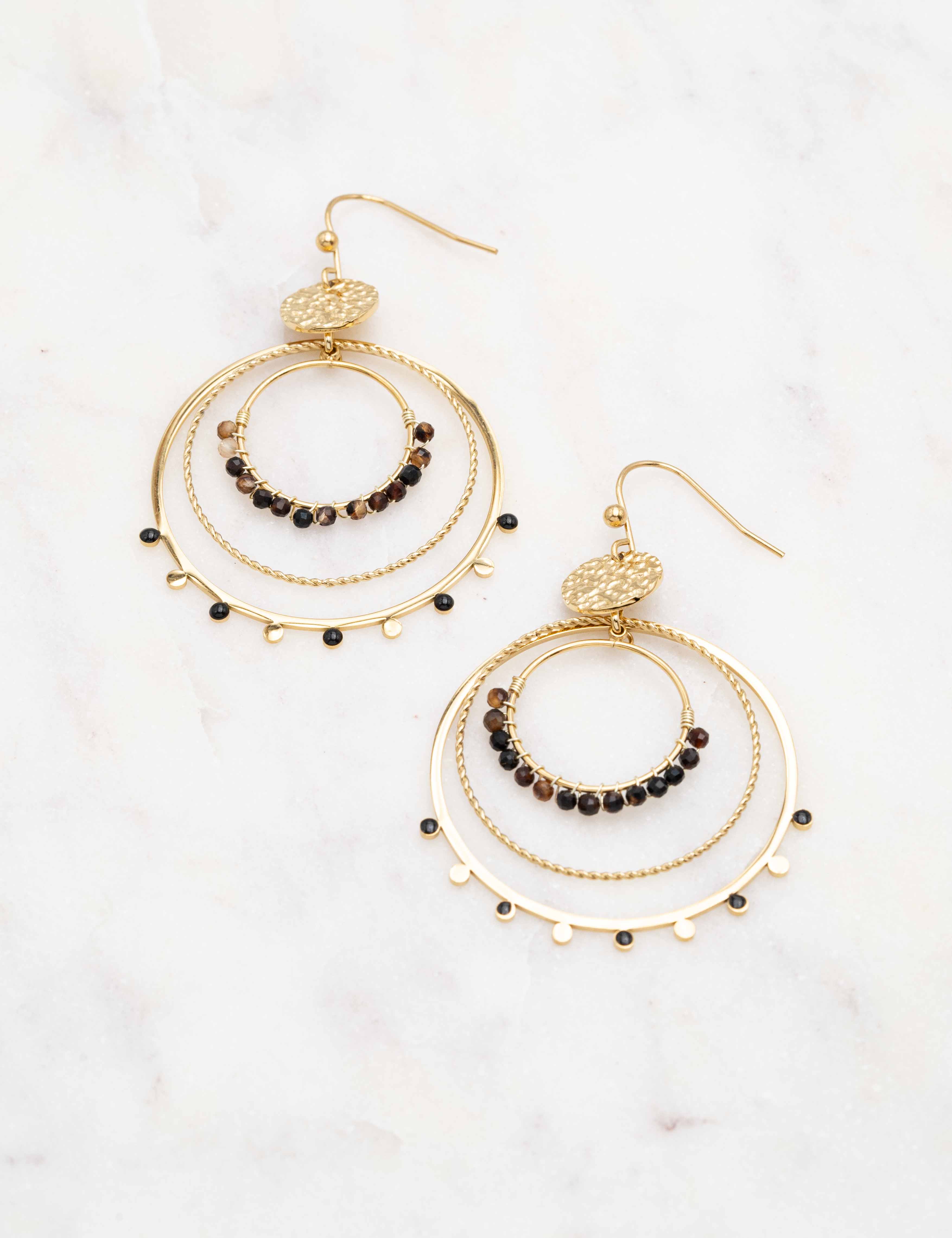 Boucles d'oreilles à crochet composées d'une pièce martelée et de plusieurs anneaux ornés de perles en pierres naturelles et des touches émaillées colorées.