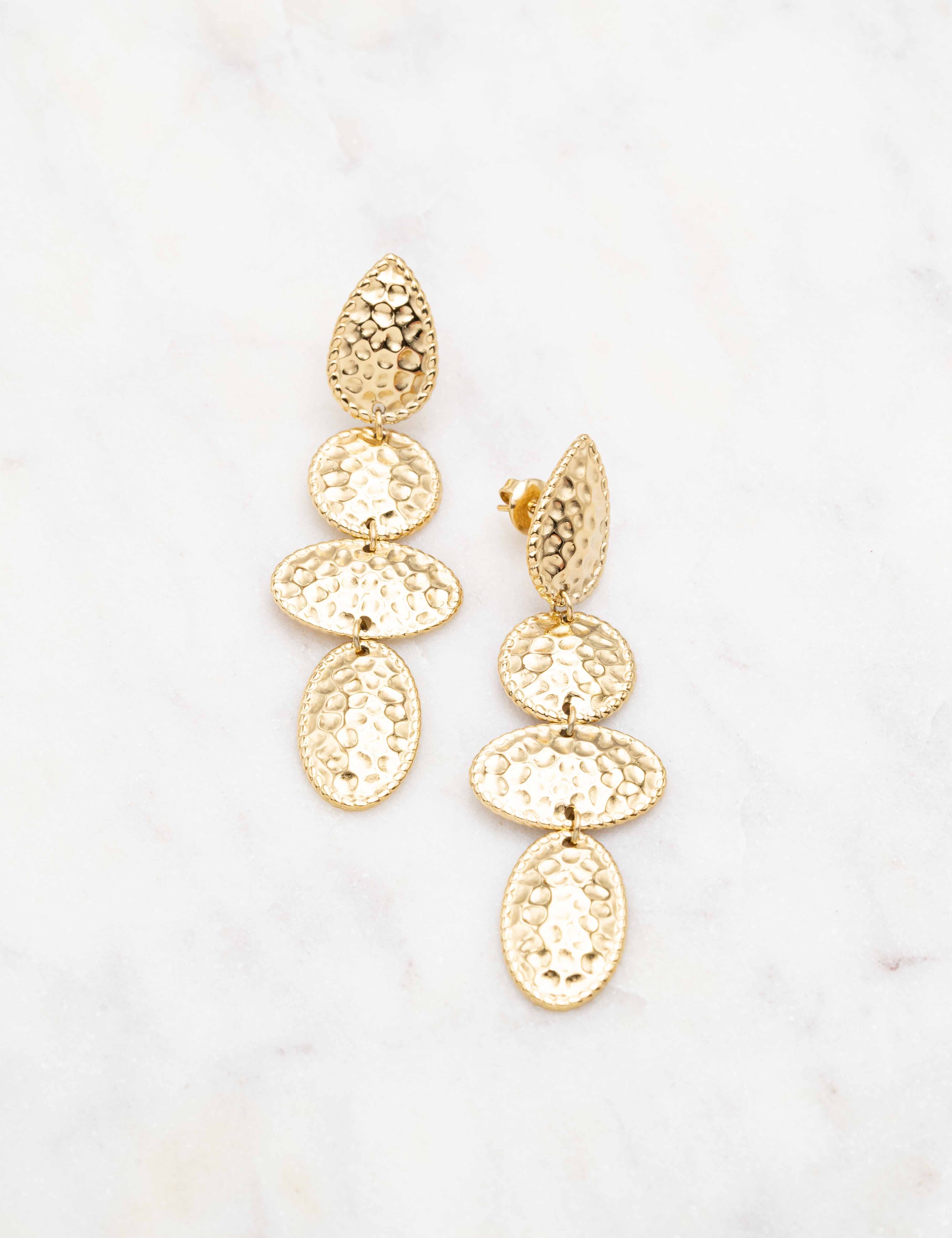 Boucles d'oreilles graphiques à puce pendantes composées de différentes pièces géométriques martelées.
