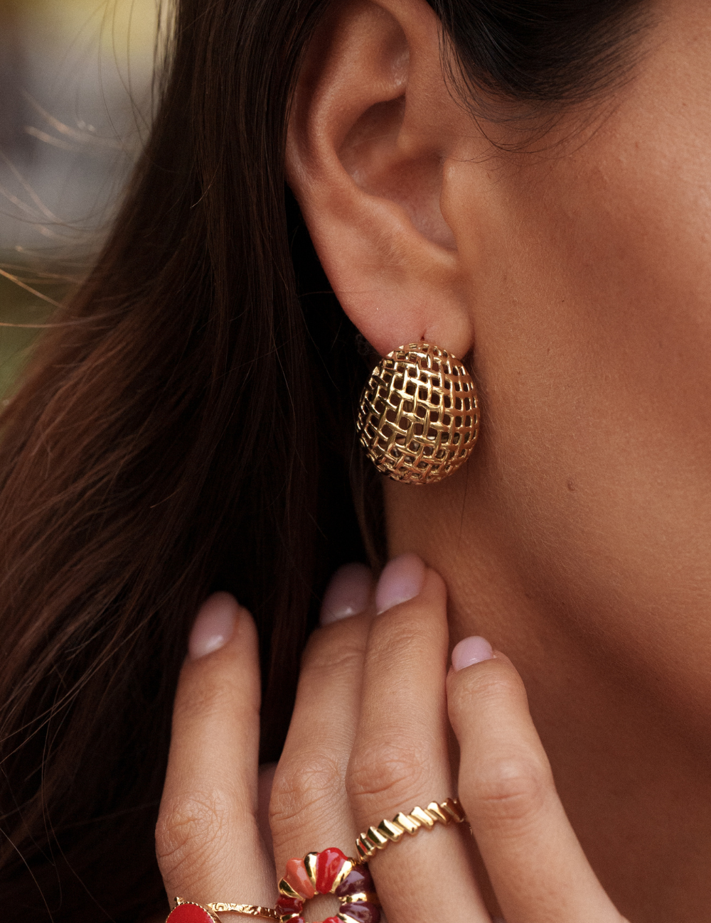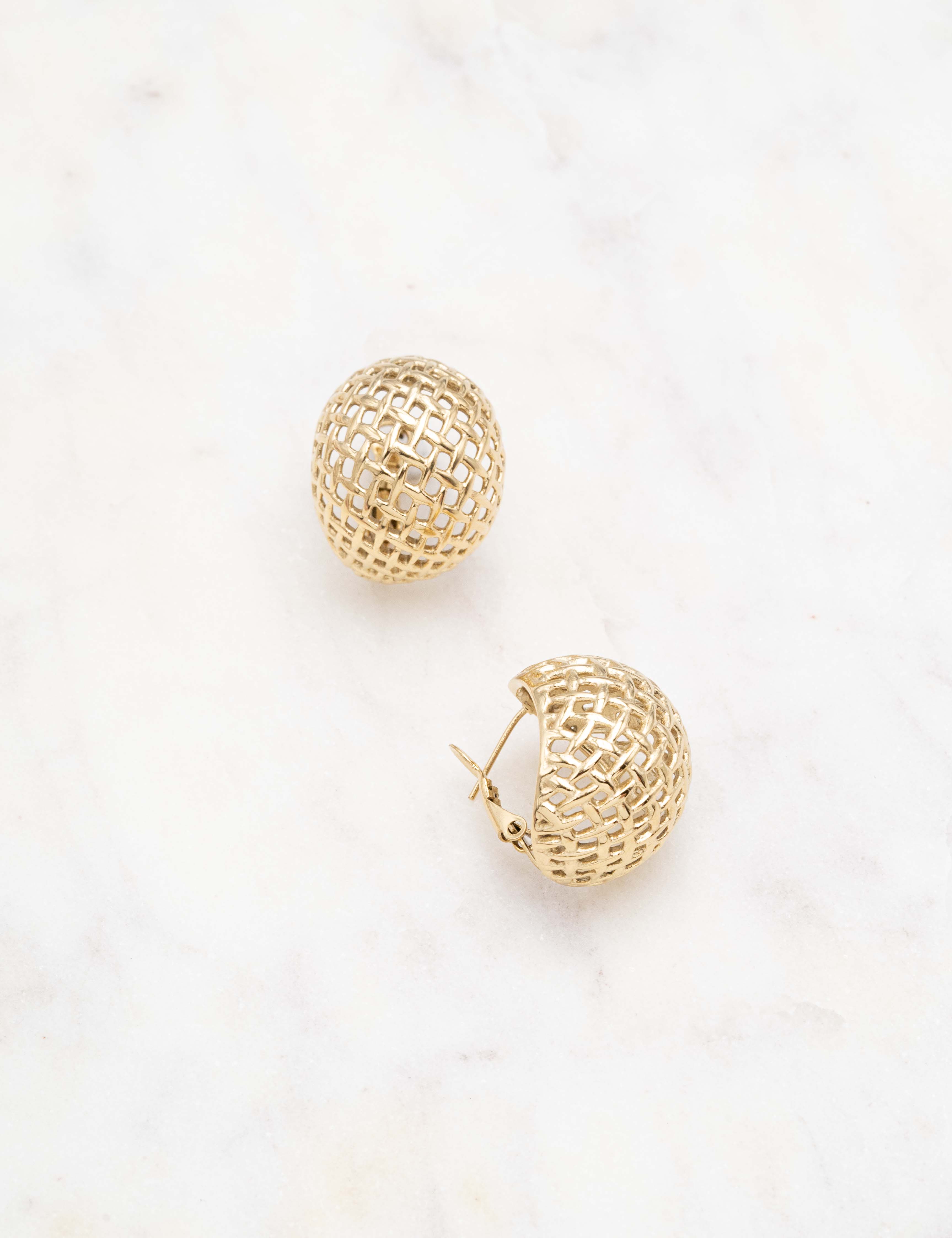 Boucles d'oreilles type créoles graphiques bombées et ajourées. Fermoir cliquet.