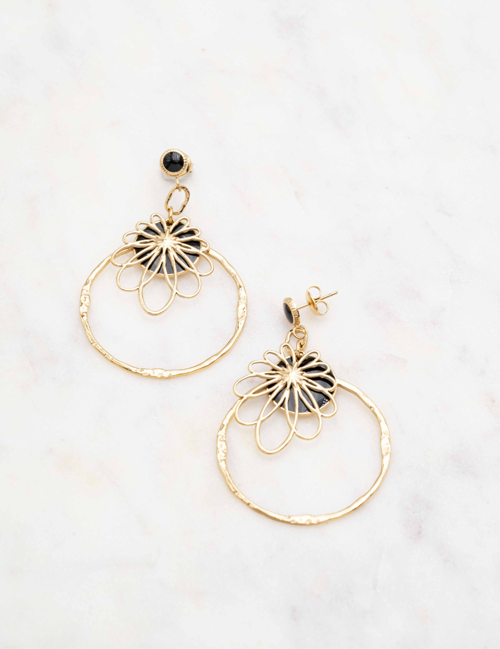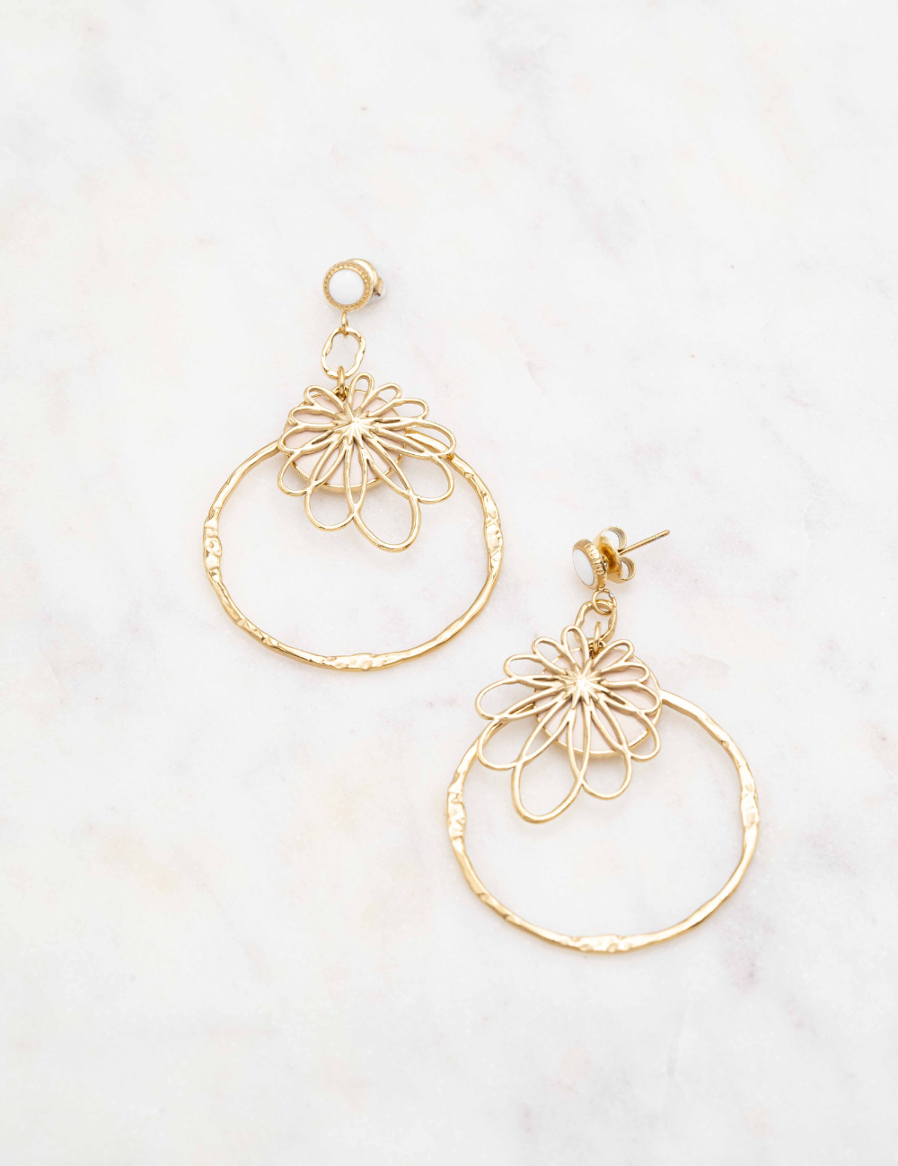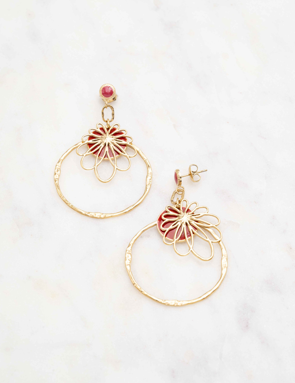 Boucles d'oreilles à puce composées d'une pièce ronde émaillée colorée et d'une pièce graphique effet floral et d'un anneau martelé.